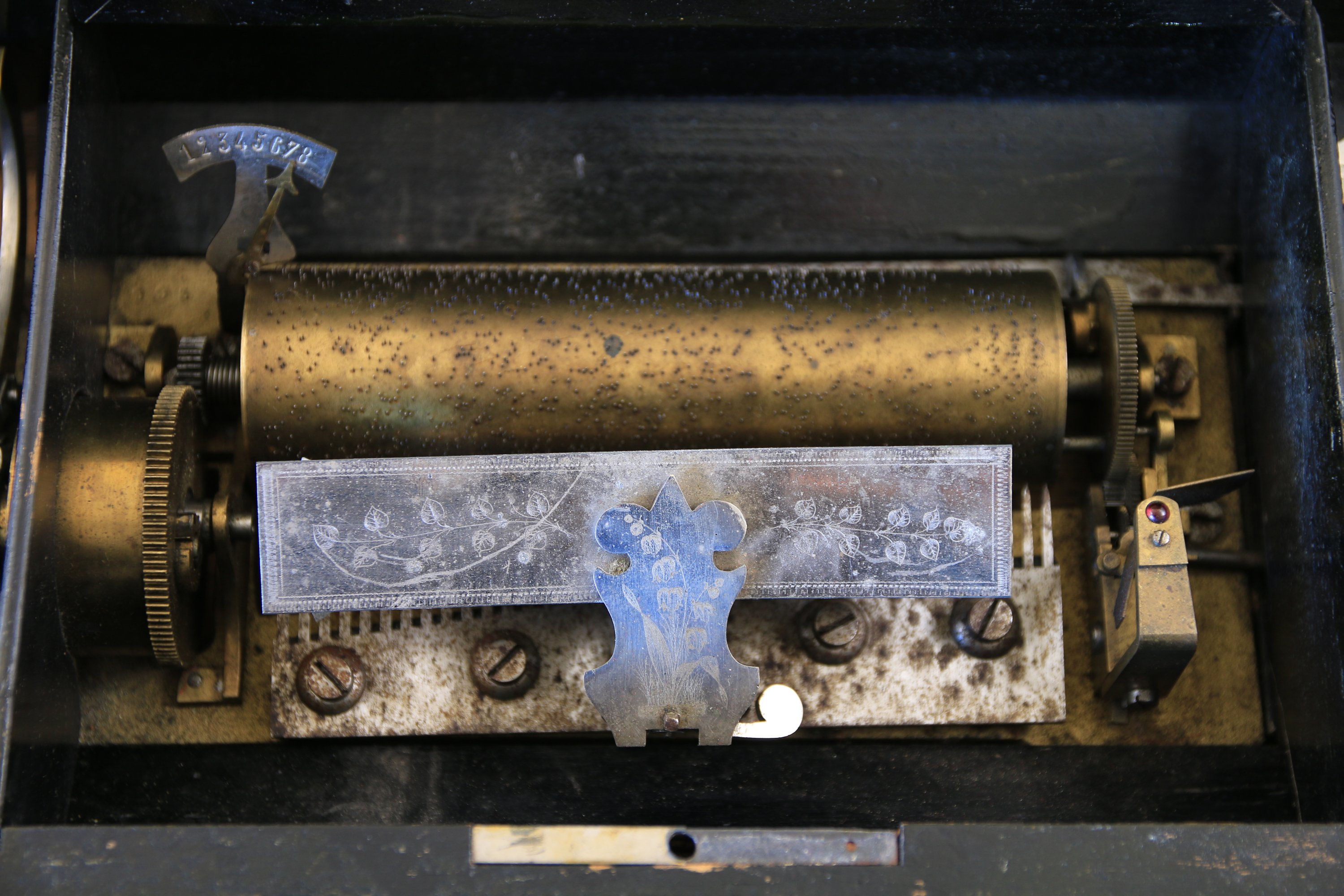 Un cylindre de 15 cm protégé par une vitre, avec remontoir à gauche et deux manettes de commande à droite. Joue les airs de La Mascotte, La Vague, La Périchole, Rigoletto, Carmen, La Vie Parisienne, Olivette et Laura.