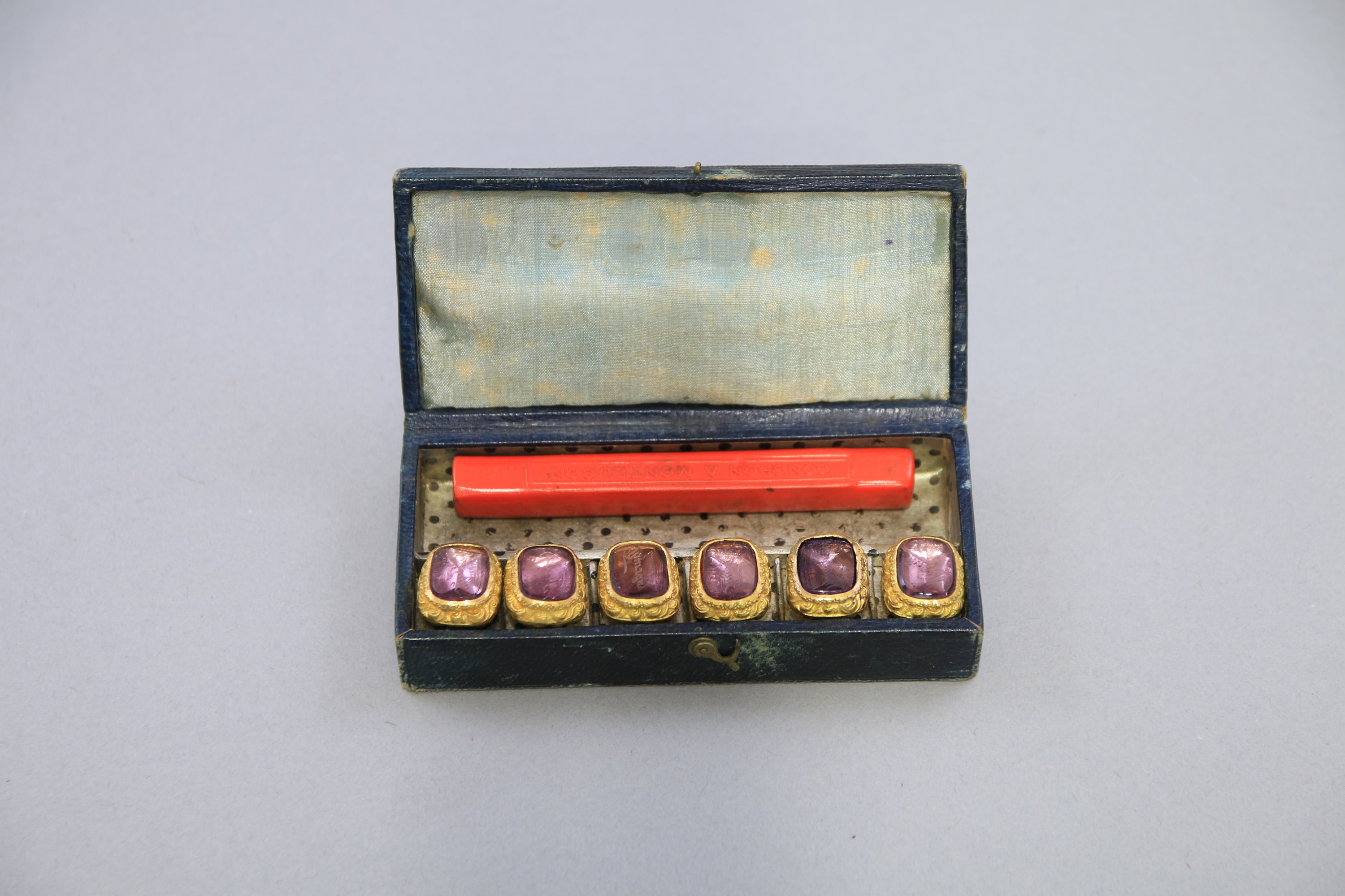 - Ensemble de six cachets en métal doré et verre à l'imitation de l'améthyste gravés des jours de la semaine (manque le samedi).