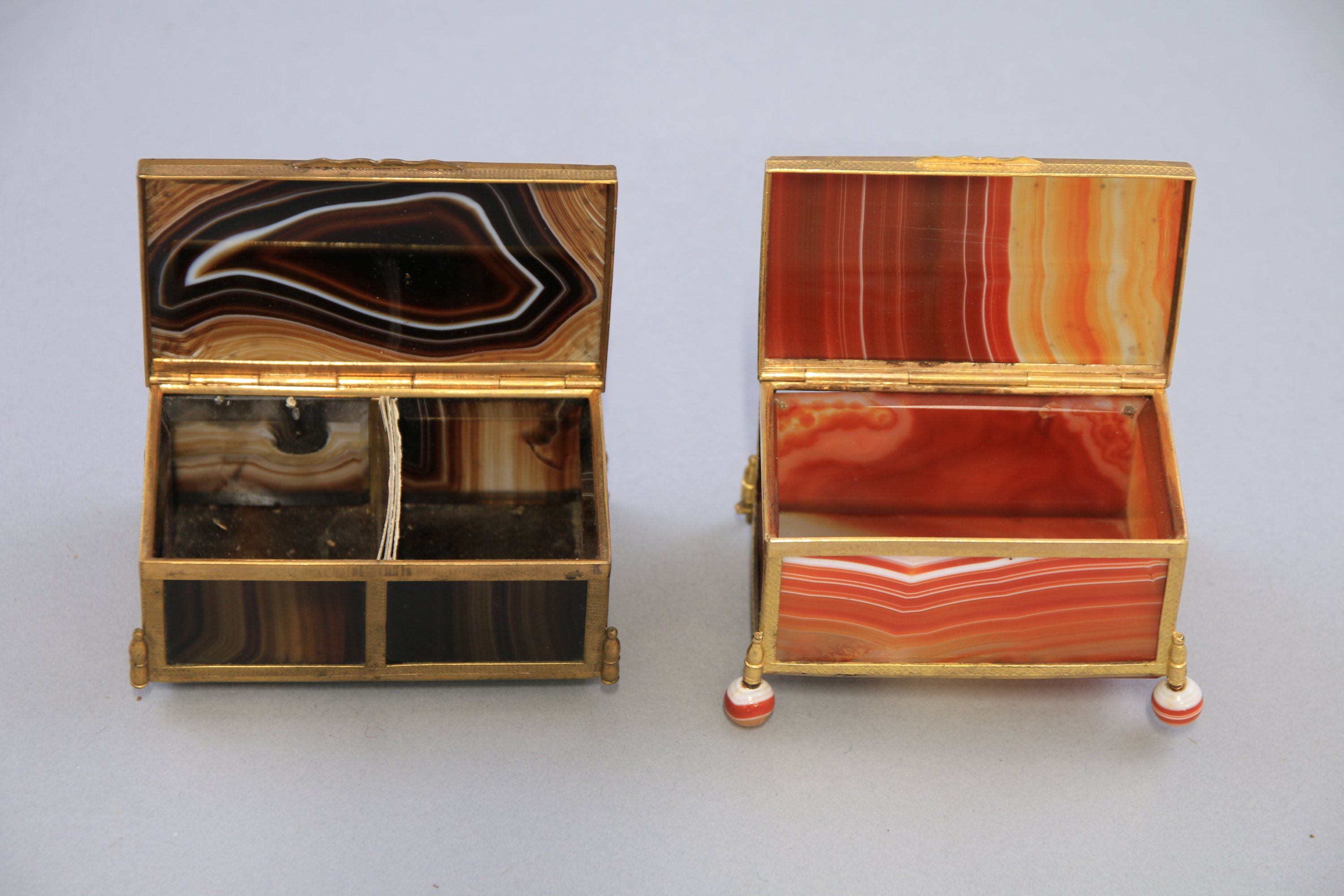 - Deux boites en agate et bronze doré, l'une à deux compartiments pouvant former boite à parfum.
