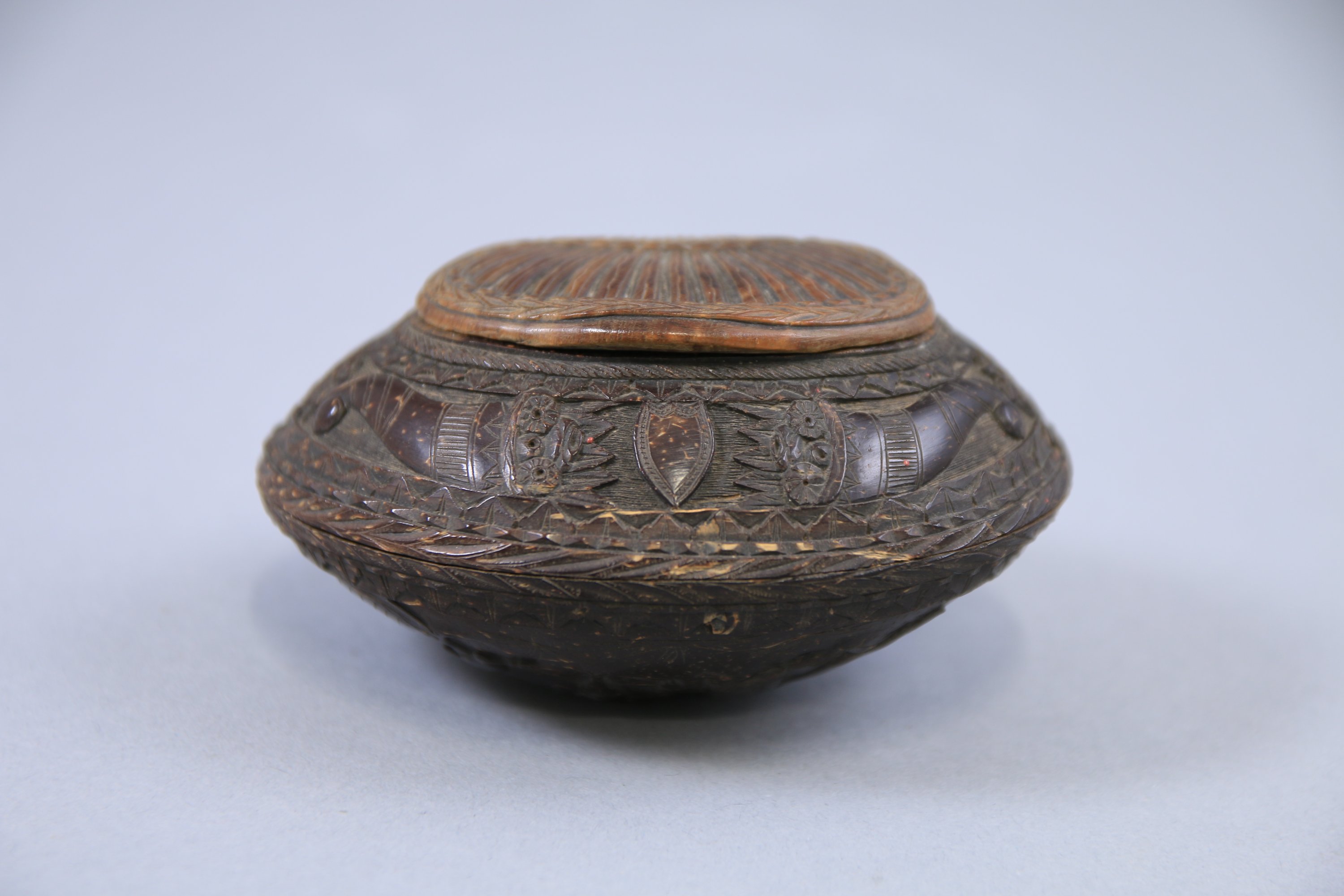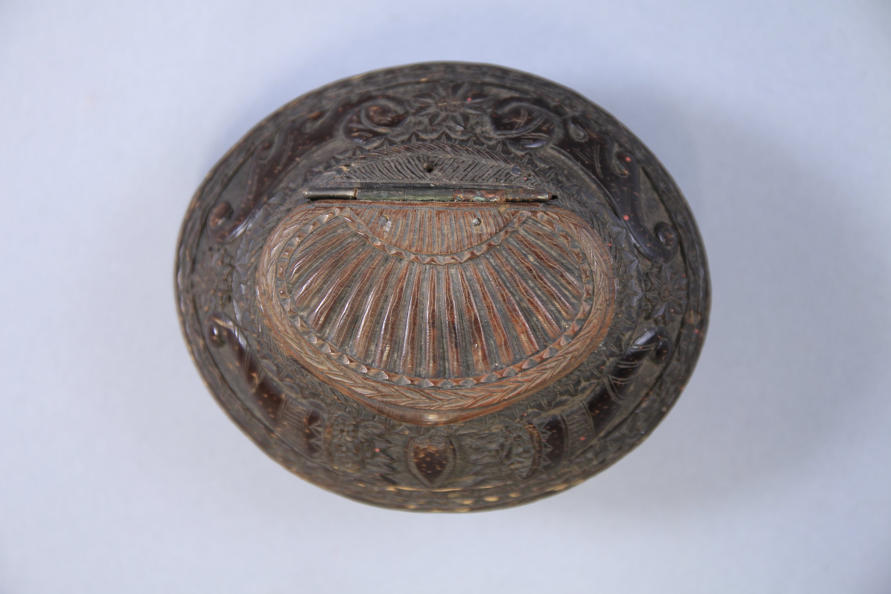 - Petite boite en noix de coco sculptée à décor d'une scène à l'antique d'une femme et de son chien dans un jardin et de cornes d'abondance, couvercle sculpté en forme de coquille.