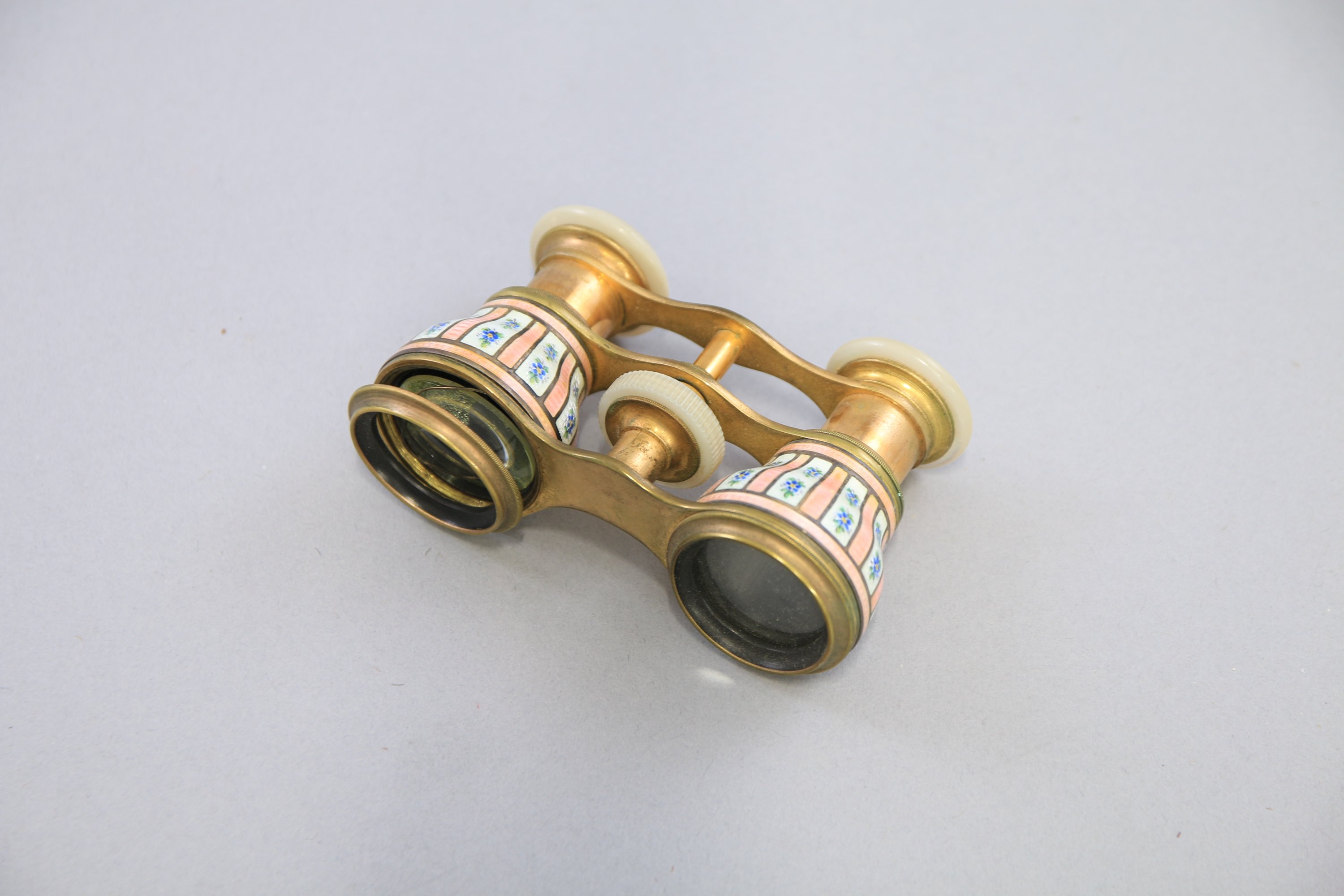 - Paire de jumelles duchesse en porcelaine et bronze doré, les oeilletons en nacre. Une lentille supplémentaire.