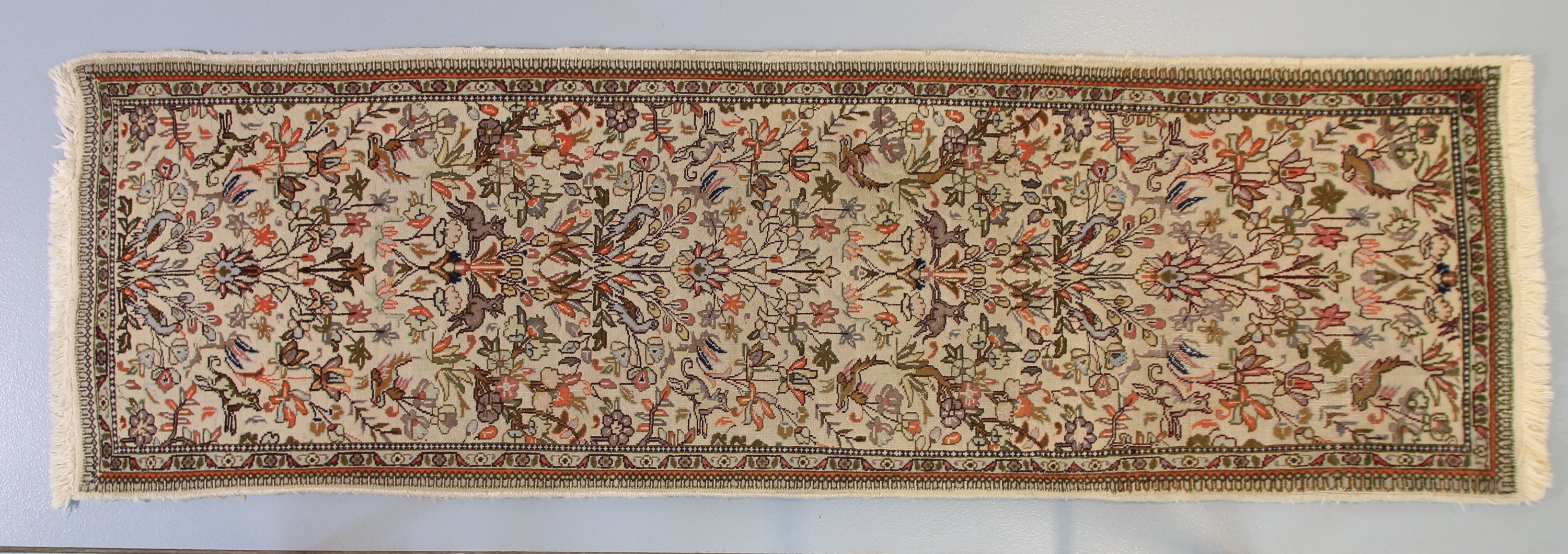 Fond crème, décor paradisiaque de tiges fleuries et animaux, bordure d’un galon turquoise.