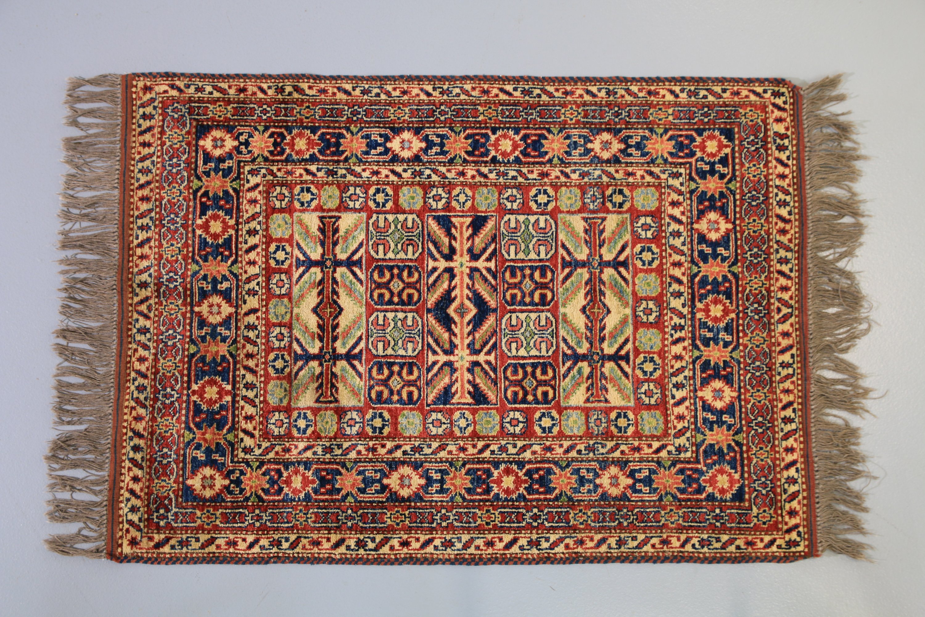 Fond compartimenté de motifs cruciformes, bordure bleue de fleurs entre des galons.
