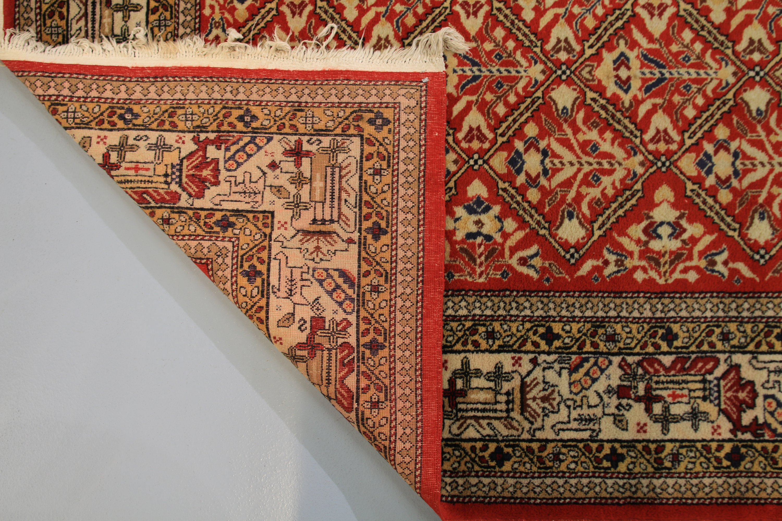 Décor de fleurs dans un réseau losangé, bordure crème de fleurs entre des galons jaunes.