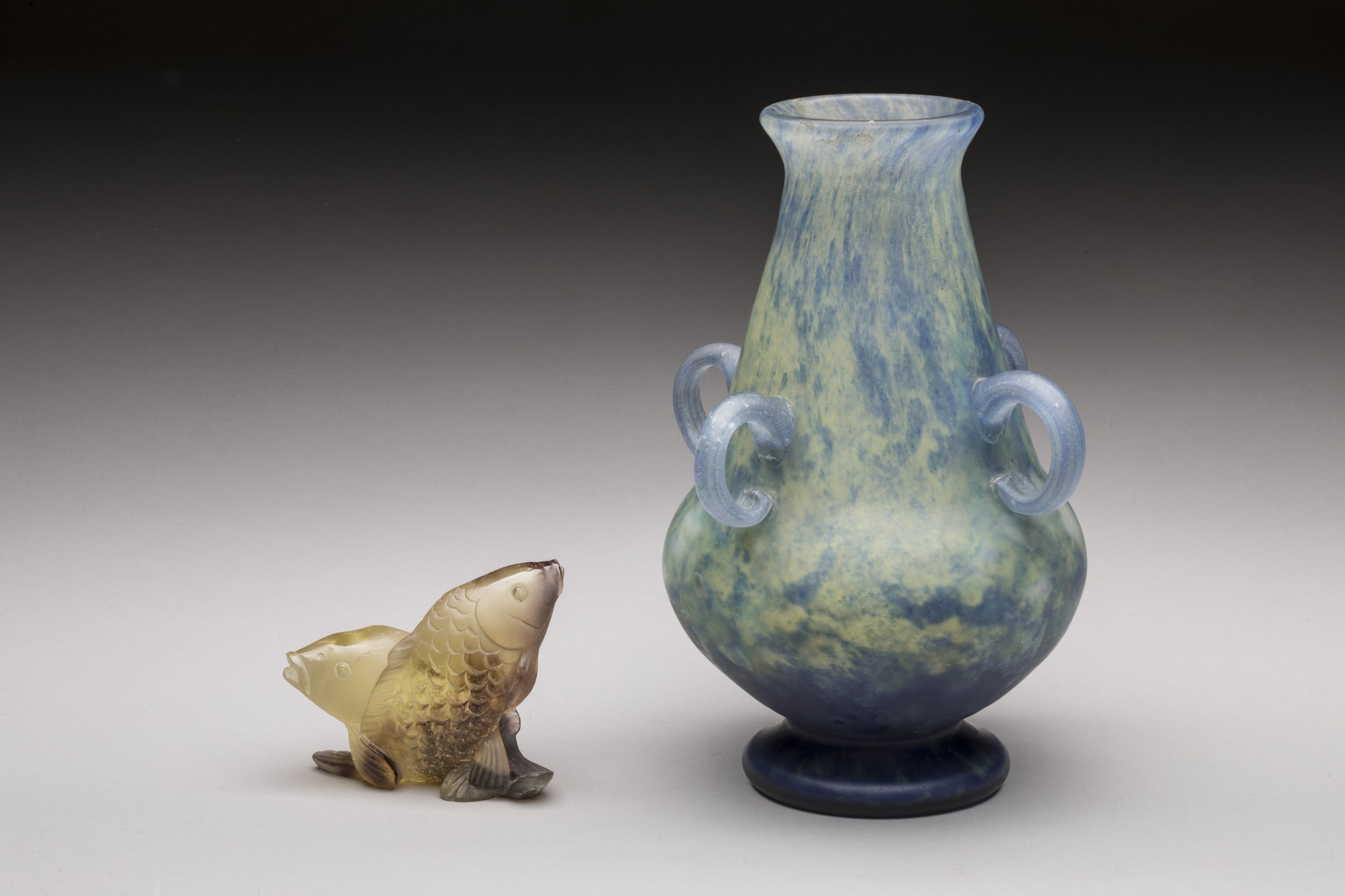 Joint: Daum France. Deux carpes. Cristal moulé ambré. Signé au revers. Haut. 6,5 cm.
