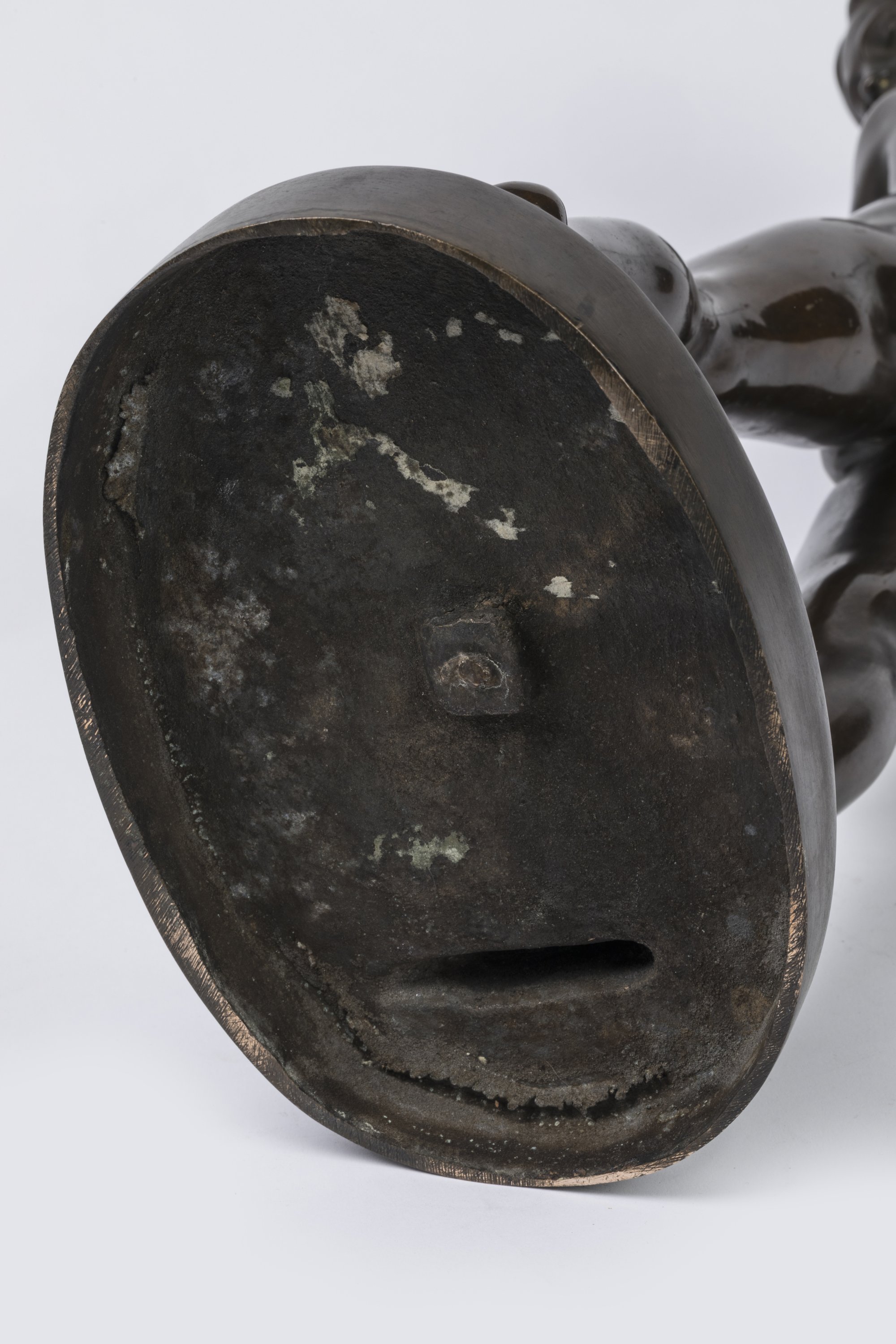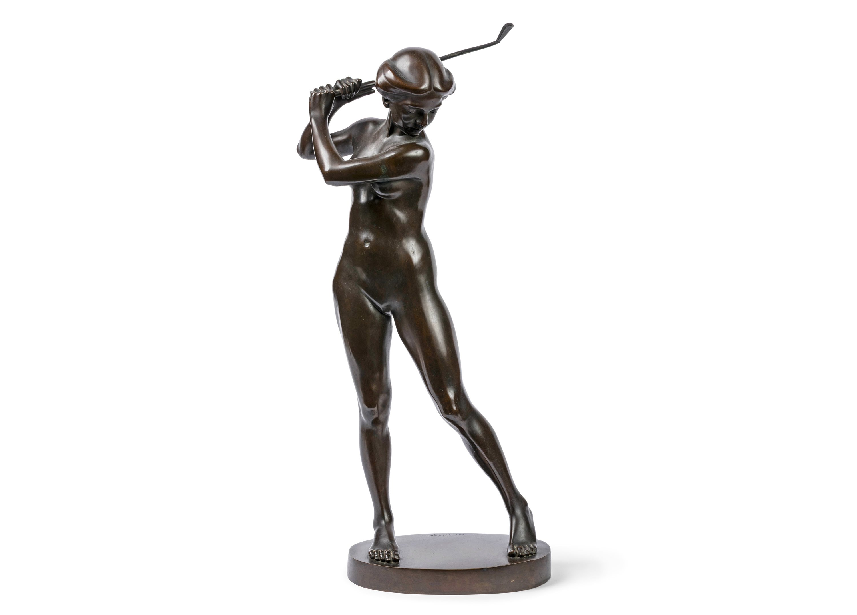 Sculpteur autodidacte, Krieger intègre à partir de 1907 la Sécession munichoise. Il est connu pour ses bronzes animaliers, notamment d'oiseaux, et sa collaboration avec la manufacture de porcelaine Hutschenreuther. Cette sculpture, précoce dans le travail de l'artiste, éclaire d'un jour nouveau l'oeuvre de l'un des plus grands naturalistes allemands du XXe siècle. Ses portraits familiaux référencés autour de 1910 sont en effet rares et portent cette même signature arrondie, telle celle figurant sur "Stehender Knabe", c. 1910 (vente Quittenbaum, Munich, 18/11/2015, n° 566). La coiffure typique du début des années 1900 est similaire à celle du "Bust of an Art Nouveau Lady", c. 1910 (vente Mehlis GmbH, Plauen, 27/05/2023, n°36517). En 1912, Krieger épouse Emilie Butters, céramiste, qui lui donne cinq enfants, dont le plus jeune d'entre eux, Hajo, est co-auteur du catalogue raisonné de l'oeuvre de son père. Ce bronze est ainsi décrit dans le répertoire de l'oeuvre: "Sportive nue tenant un club de golf derrière sa tête bien coiffée, prenant de l'élan pour frapper la balle. En appui sur sa jambe droite, la jambe gauche légèrement tournée vers l'extérieur".