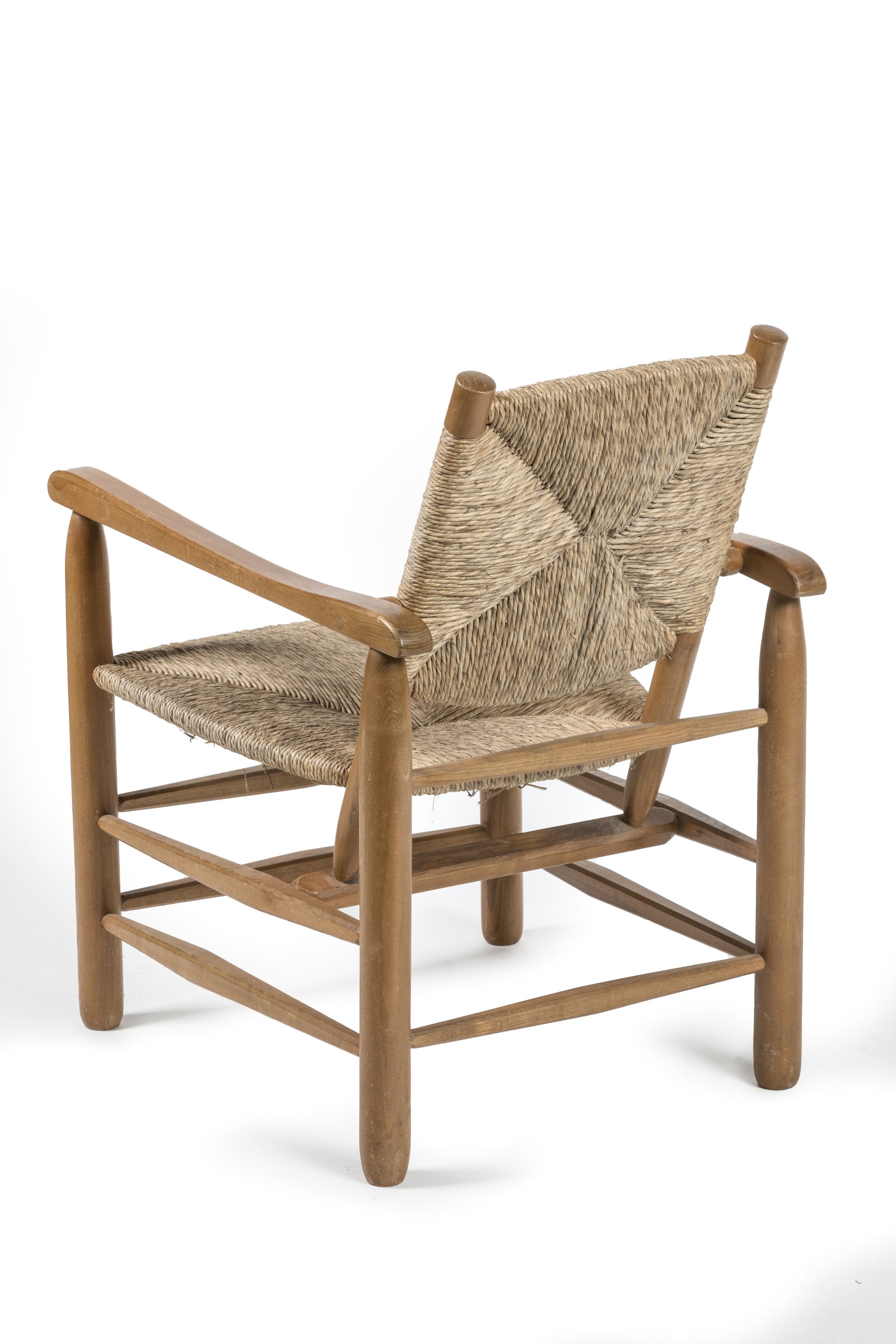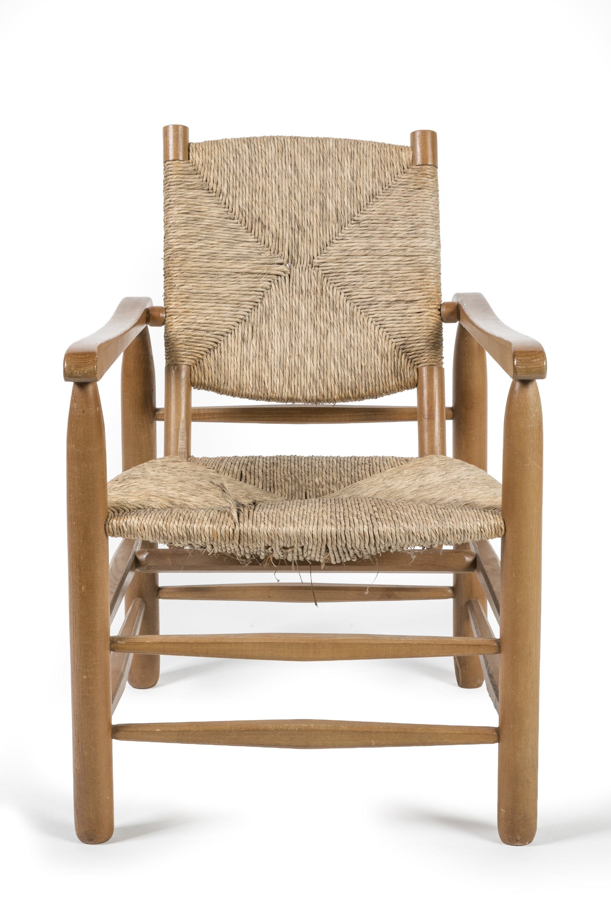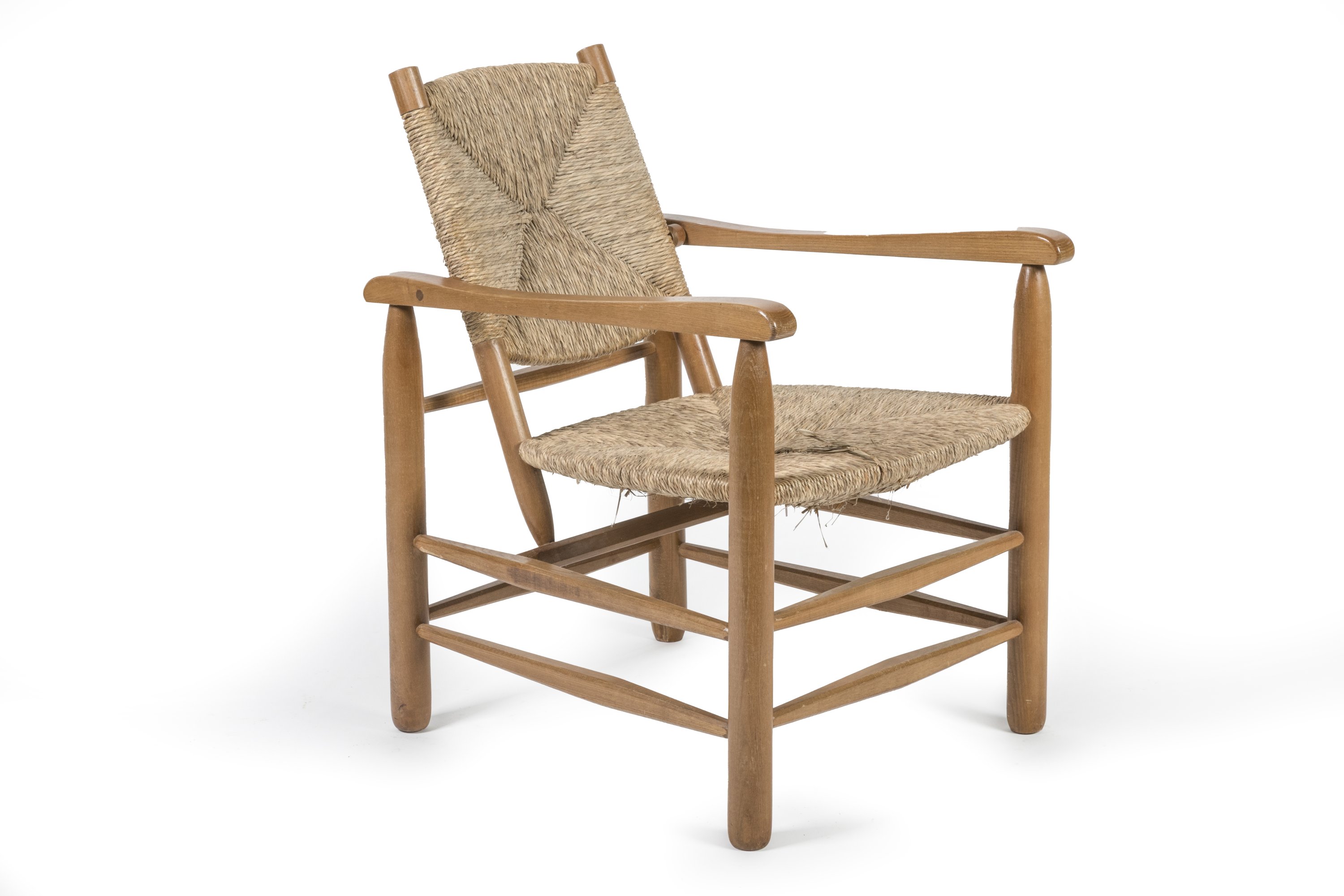 Créé en 1935 par Charlotte Perriand, le modèle de fauteuil n°21 figure au catalogue de l'Equipement de la maison en 1947. Entre 1966 et 1967, il sera produit sous le nom de "Chamrousse", probablement par l'atelier Sentou à Linde, pour un hôtel de la station de ski de Flaine en Haute Savoie.