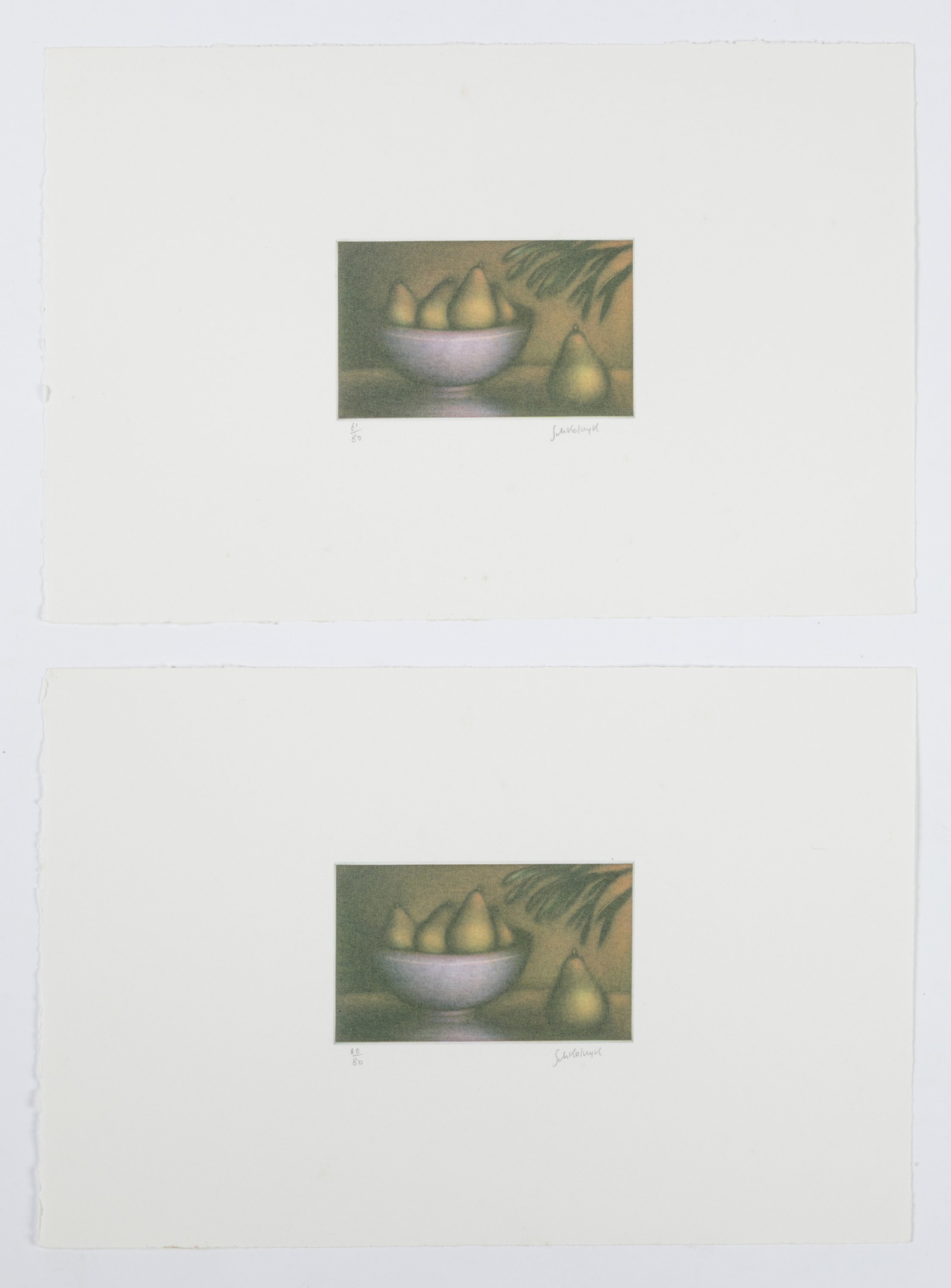 - Laurent Schkolnyk (Français, né en 1953). Natures mortes. Trois gravures en couleurs. Signées et justifiées. Les feuilles entre Haut. 190 et 286 et Larg. 287 et 321 mm.