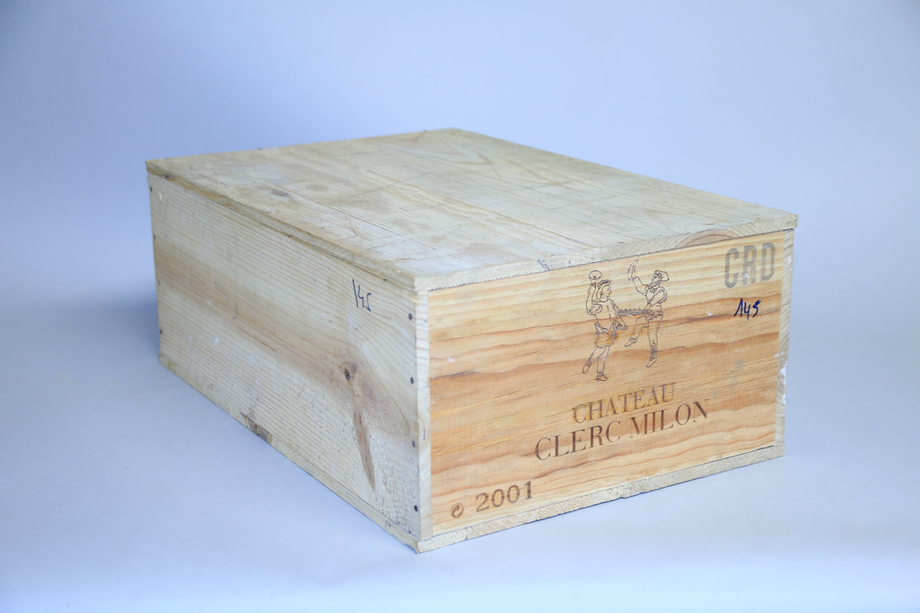 Pauillac, Château Clerc Milon, 5ème Grand Cru classé, 2001, 12 bouteilles. Caisse en bois d'origine (numérotation au feutre).