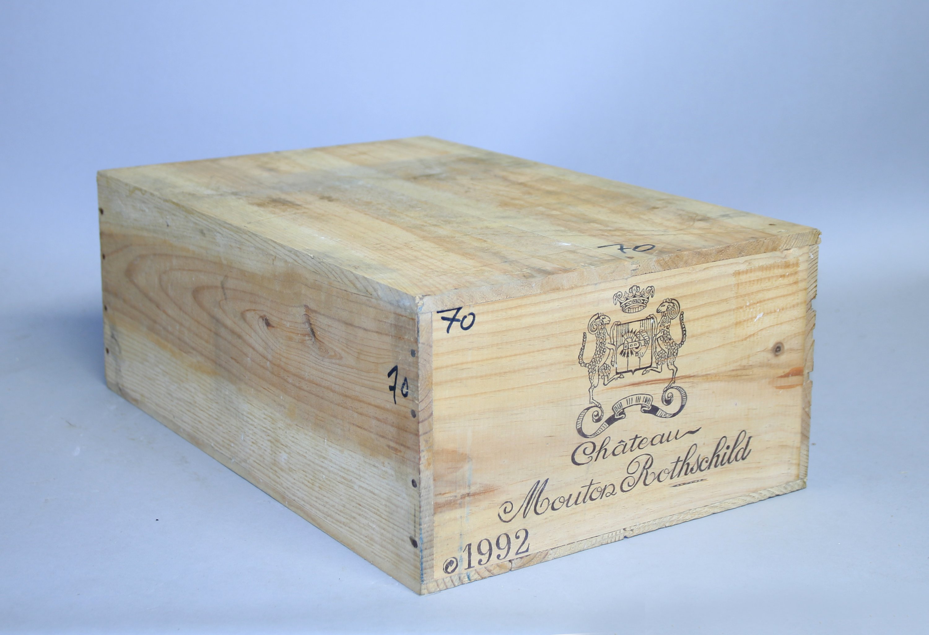 Pauillac, Château Mouton Rothschild, 1er Grand Cru classé, 1992, 12 bouteilles. Caisse en bois d'origine (numérotation au feutre).
