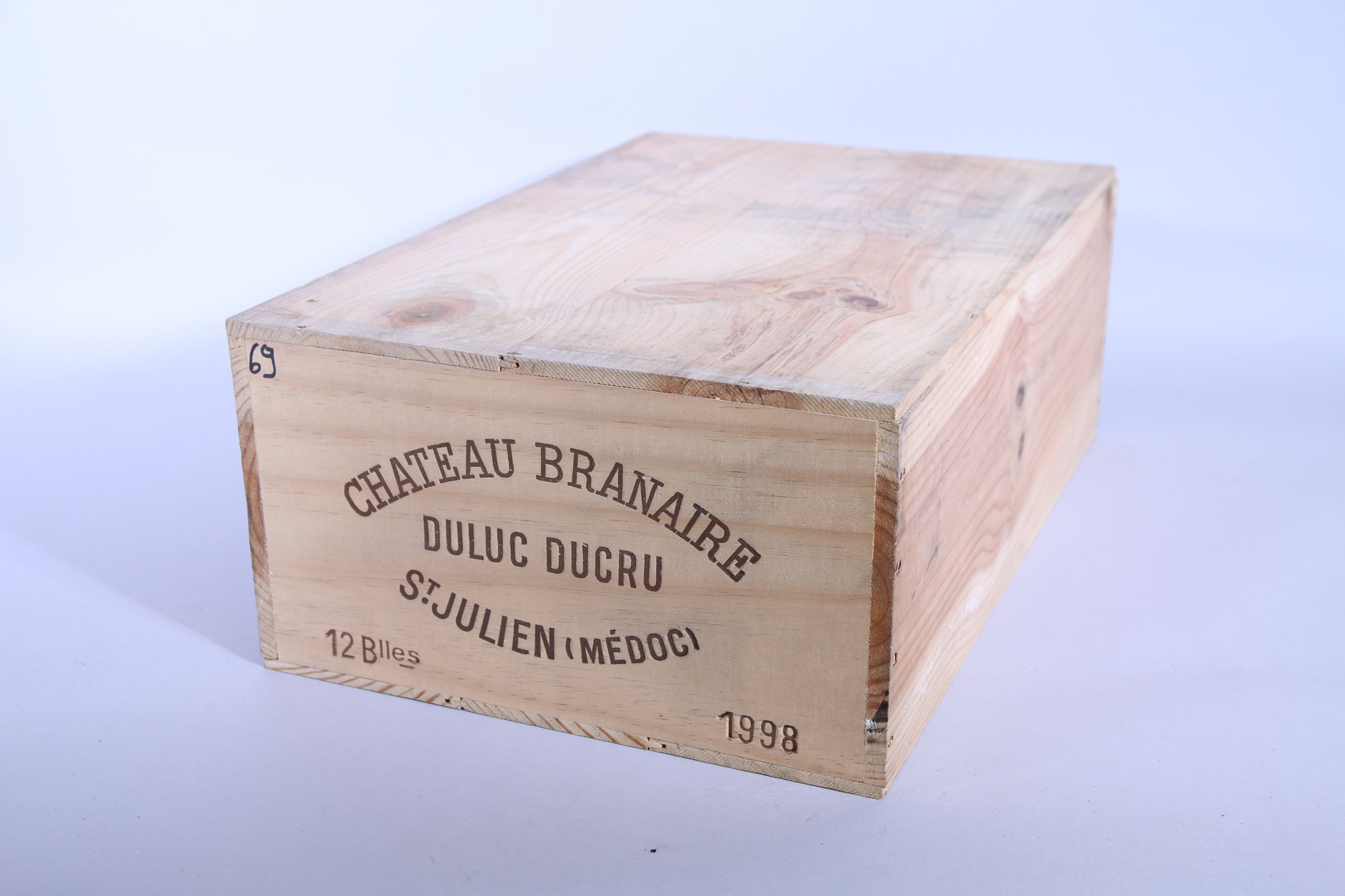 Saint-Julien, Château Branaire, 4ème Grand Cru classé, 1998, 12 bouteilles. Caisse en bois d'origine (numérotation au feutre).
