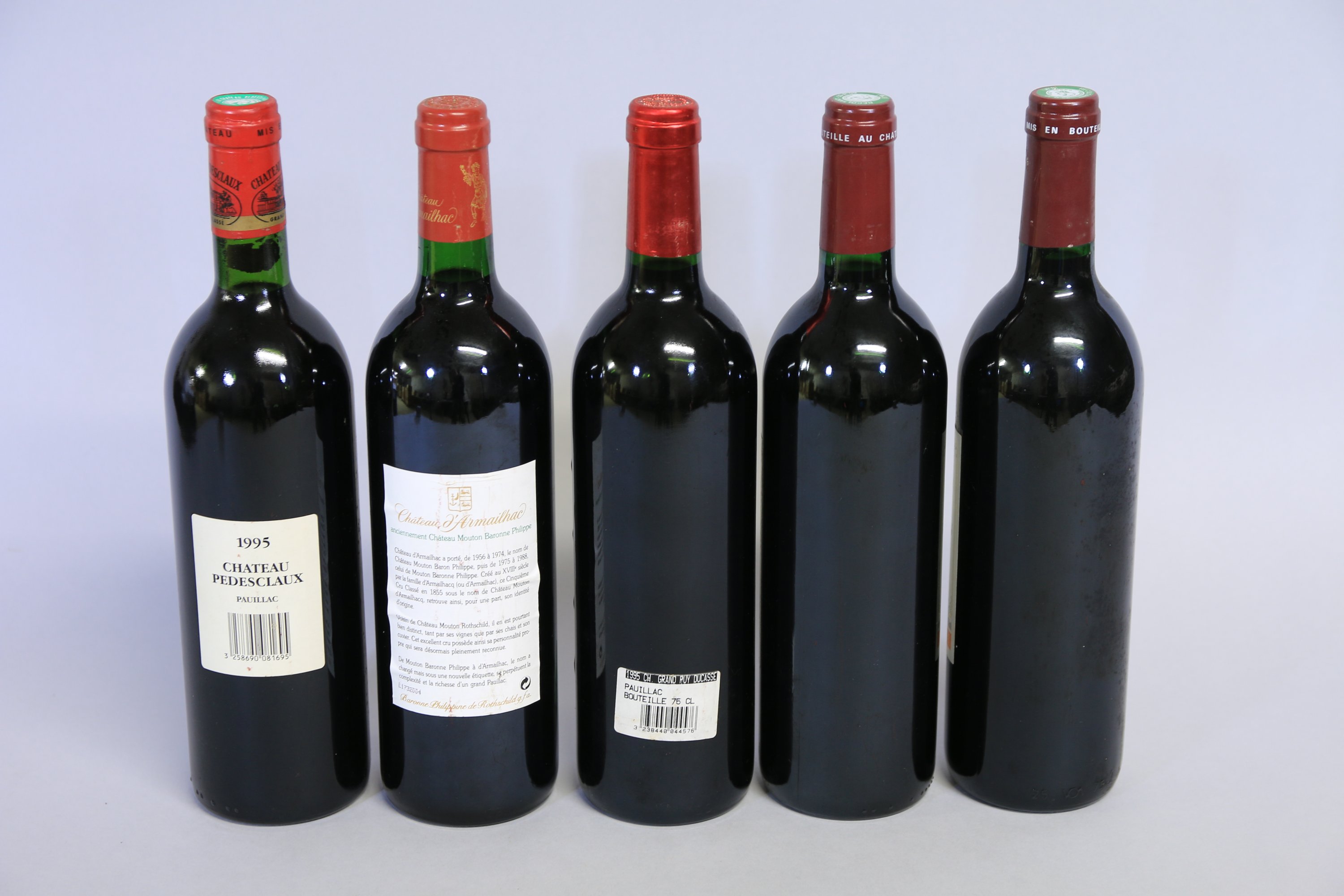 - Château d’Armailhac, 5ème Grand cru classé, 1995, 1 bouteille. Niveau: Très légèrement bas. Etiquette: Légèrement décollée. Capsule: Parfaite.