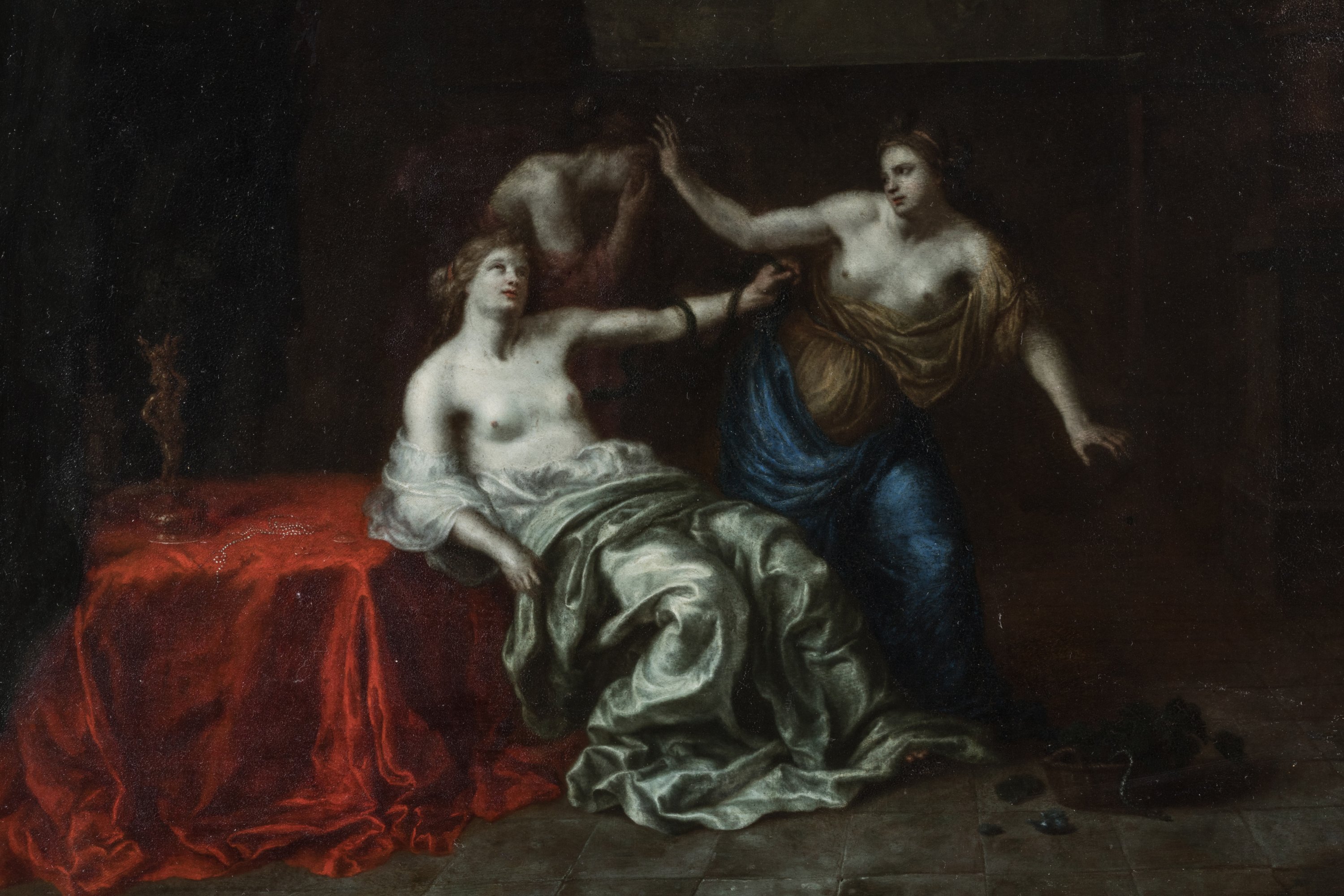 Attributed to Ottmar Elliger II. A painting depicting Cleopatra's death. Oil on copper. In a blackened wood and faux tortoiseshell frame.