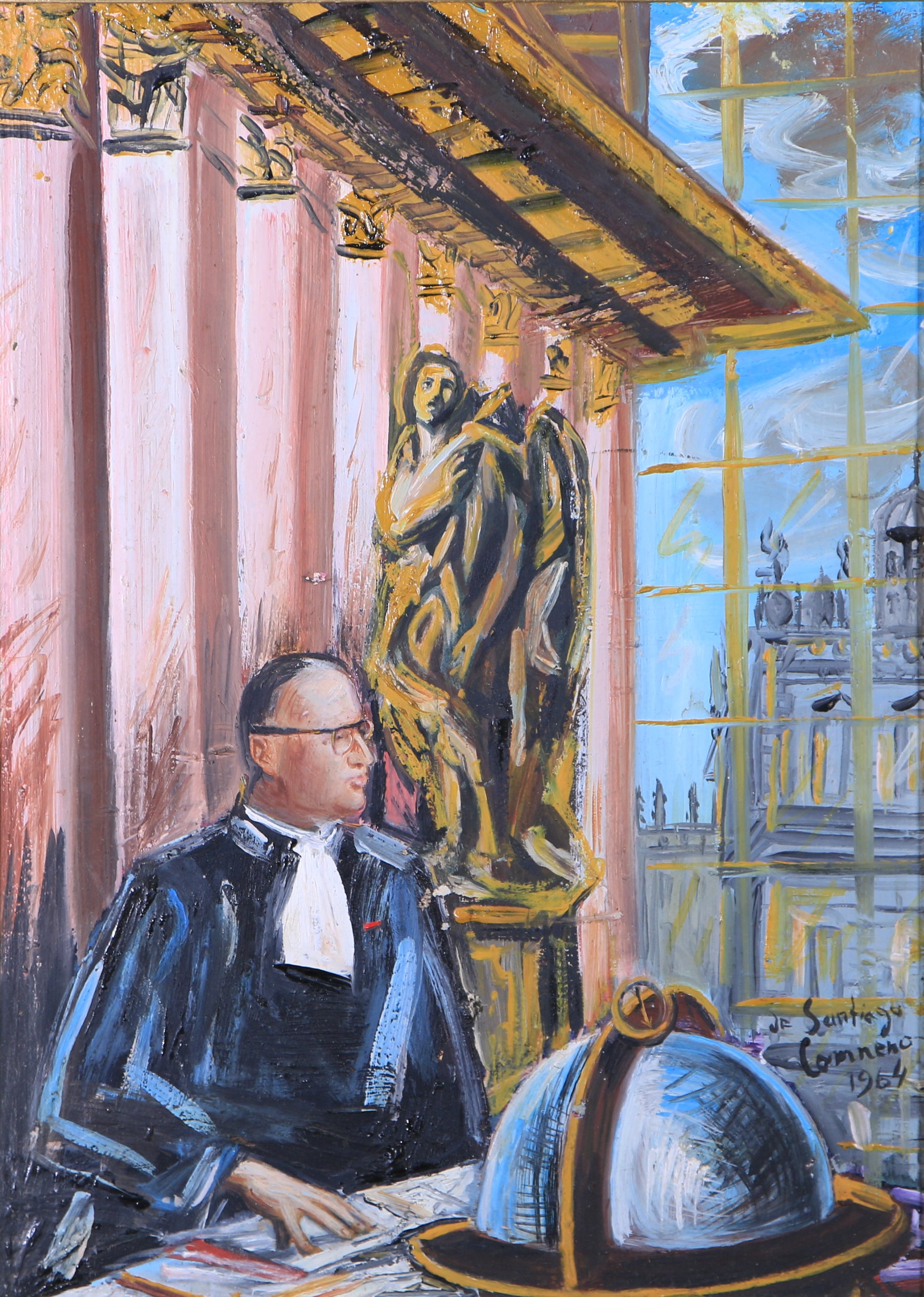 Notre tableau est un vibrant hommage du peintre à son avocat, René Floriot. En 1964, Georges Commène est accusé de "contrefaçon en raison des nombreux pastiches d'œuvres de maîtres contemporains, qu'il admet avoir fabriqués". Commène imite par exemple Bernard Buffet ou Maurice Utrillo. Il est défendu par René Floriot.