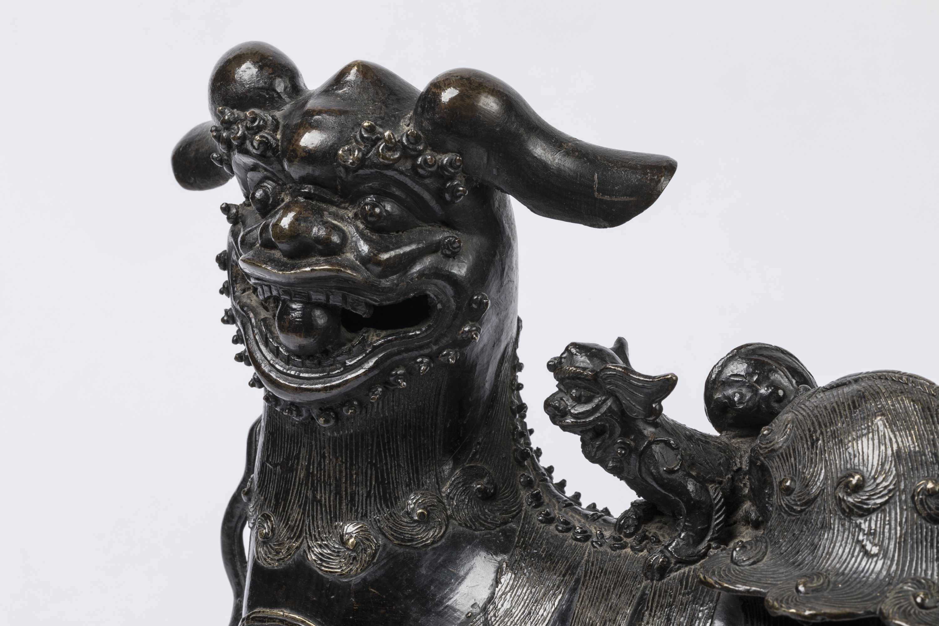 La patte antérieure sur la boule de pouvoir, un petit lion posé sur la boule, un autre petit grimpé sur son dos. Ils portent des boules dans leurs gueules, les poils finement incisés.
