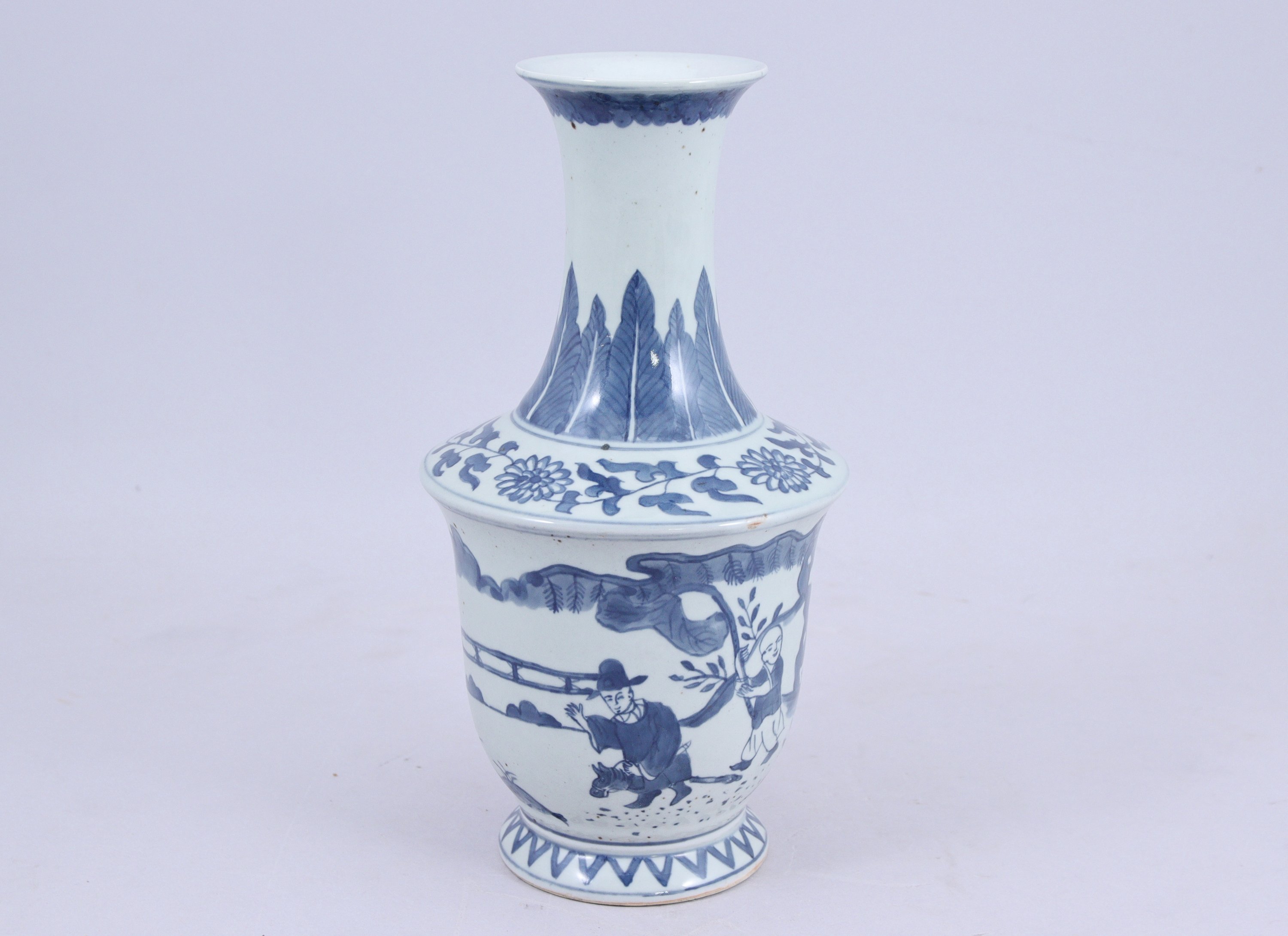 Porcelaine émaillée. Vase au long col évasé reposant sur un piédouche à décor en bleu et blanc d'enfants en procession.