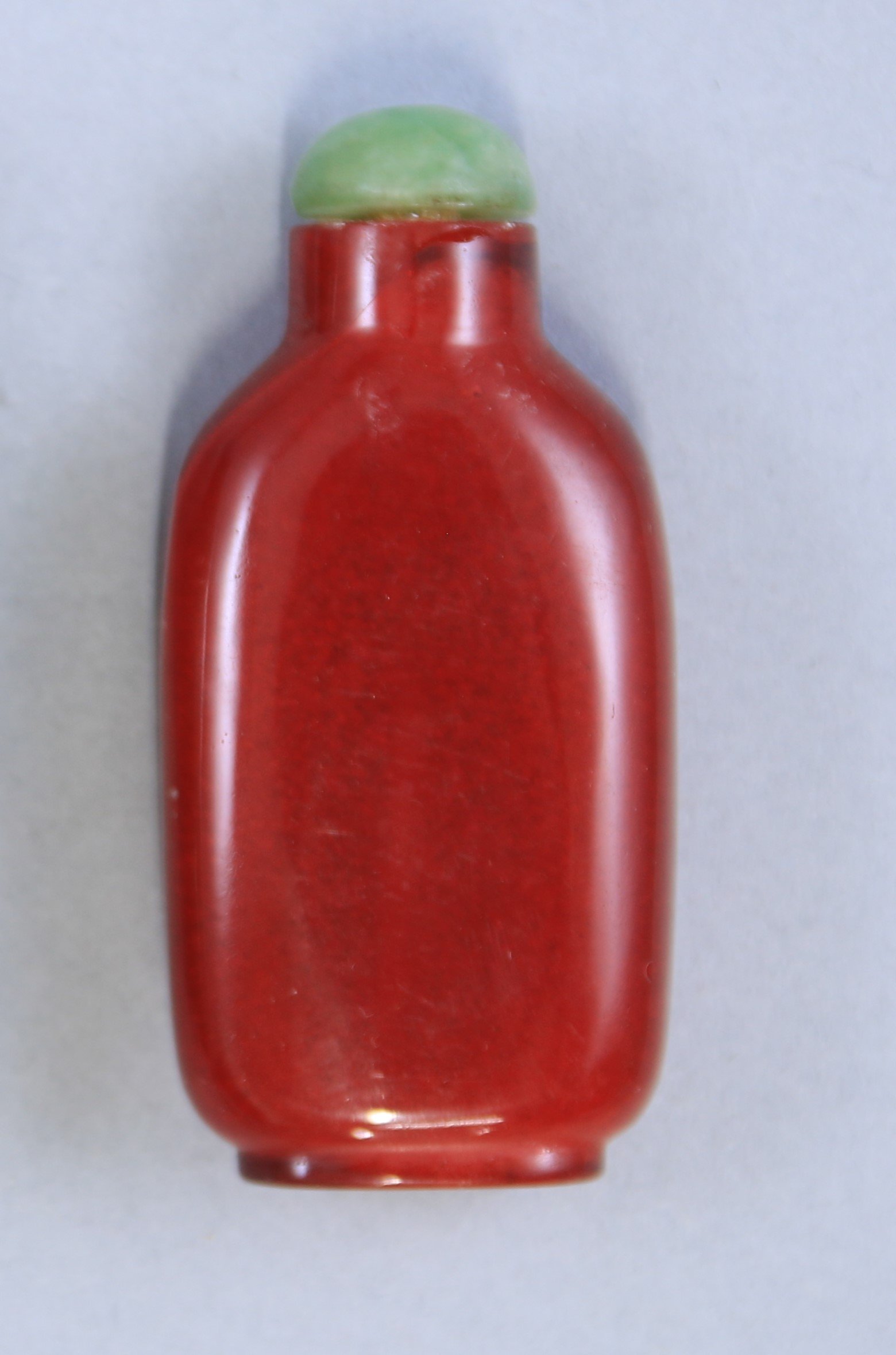 Verre. L'un ovoïde aplati en verre bleu, l'autre rectangulaire à épaules tombantes en verre overlay rouge sur fond bullé.