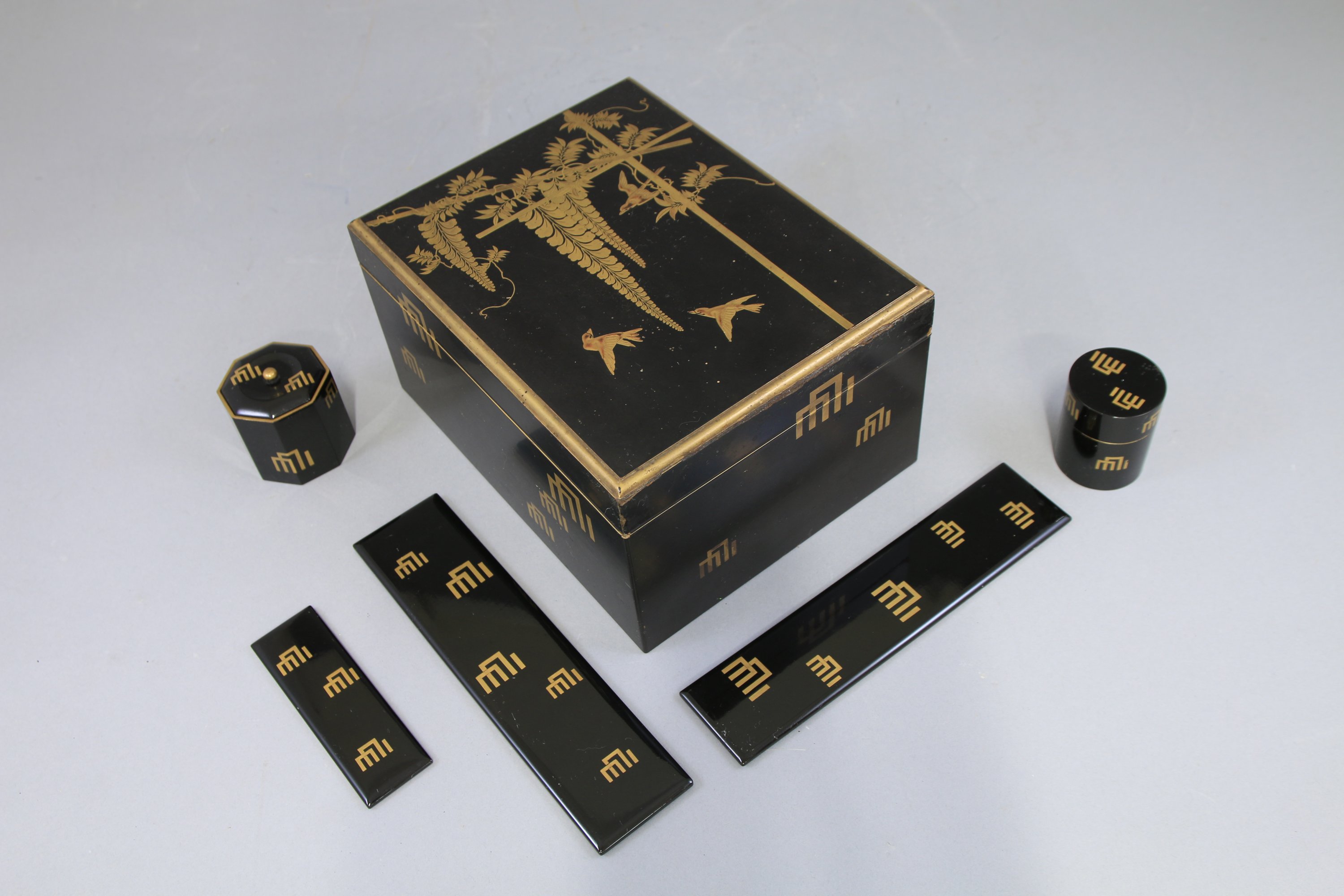 Laque maki-e à décor de genji-môn, couvercle à décor d'oiseaux et de glycines.