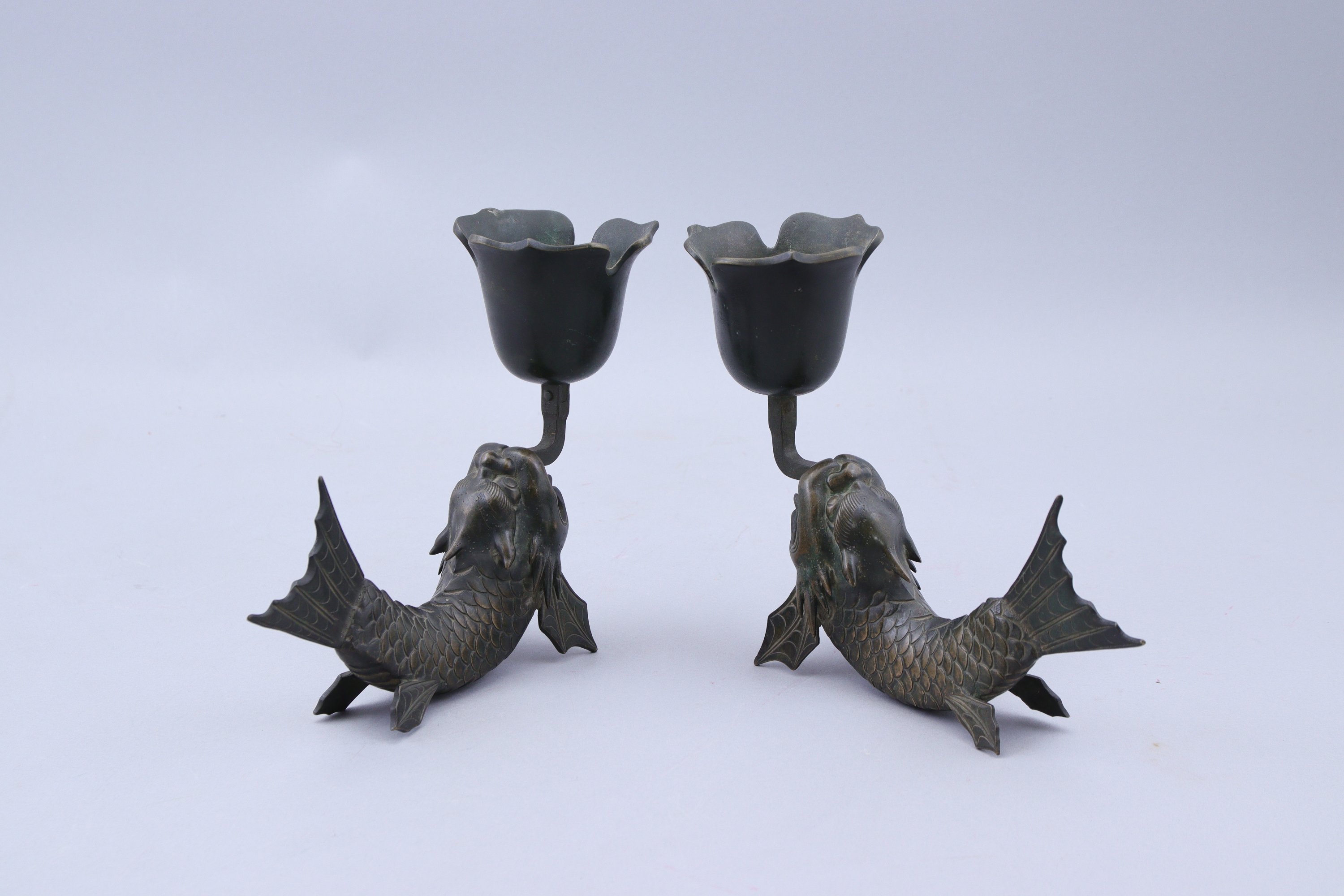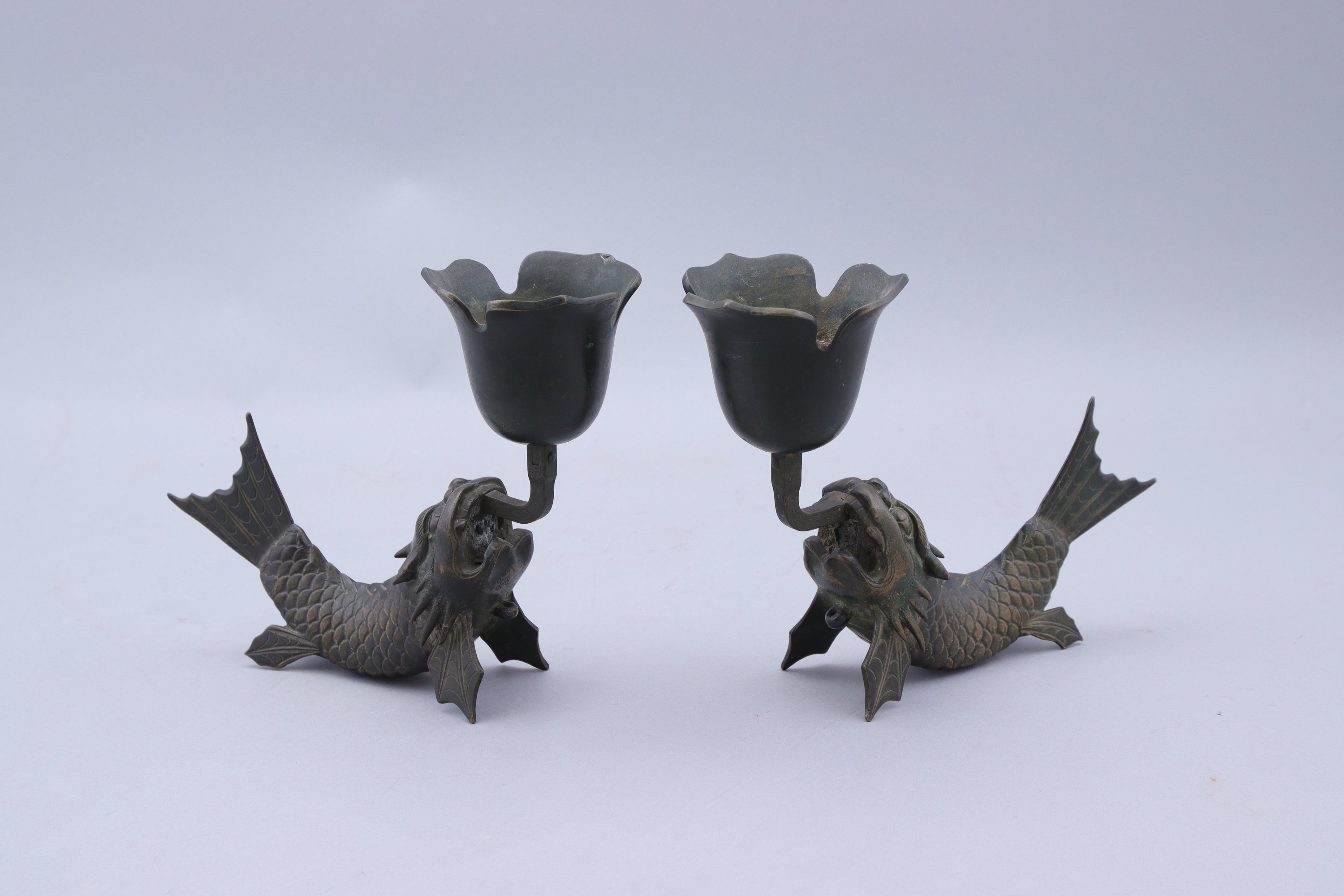 Joints: Paire de porte-encens transformés en bougeoirs en forme de dragon. Haut. 18 Long. 22 cm.