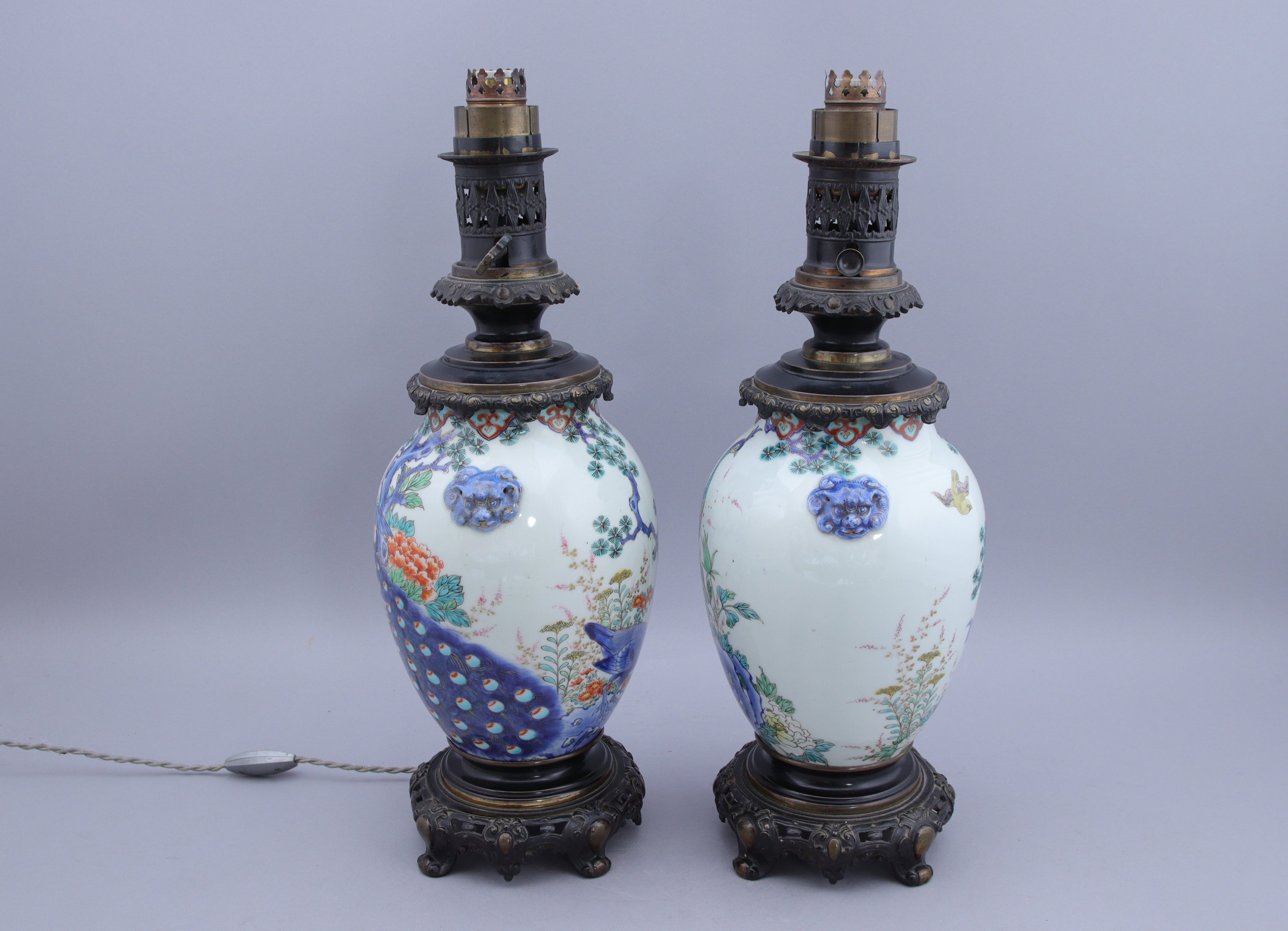 Décor en bleu sous couverte et émaux polychromes et or d'oiseaux variés dans les pins et fleurs d'automne. Montés en lampes.