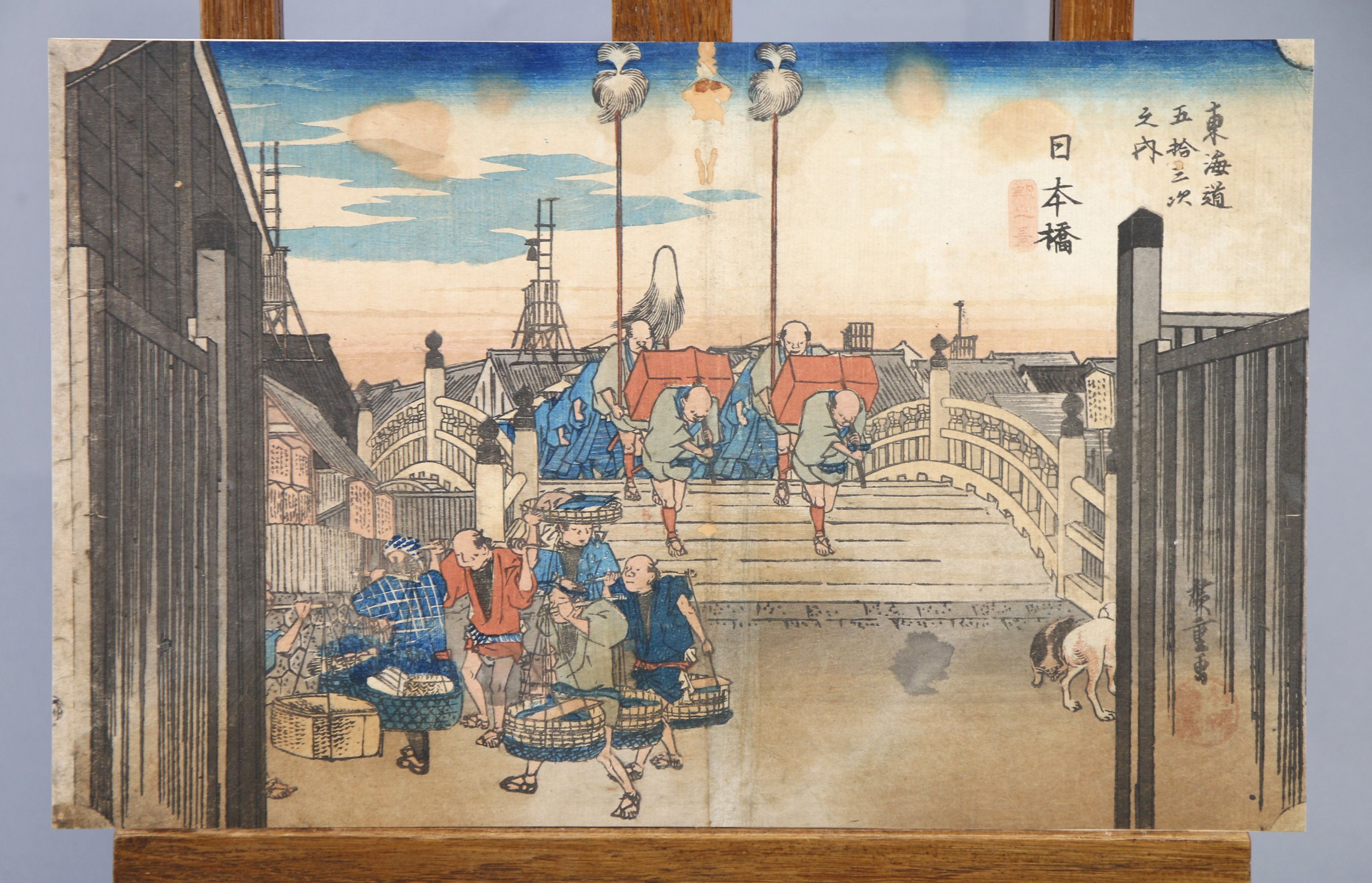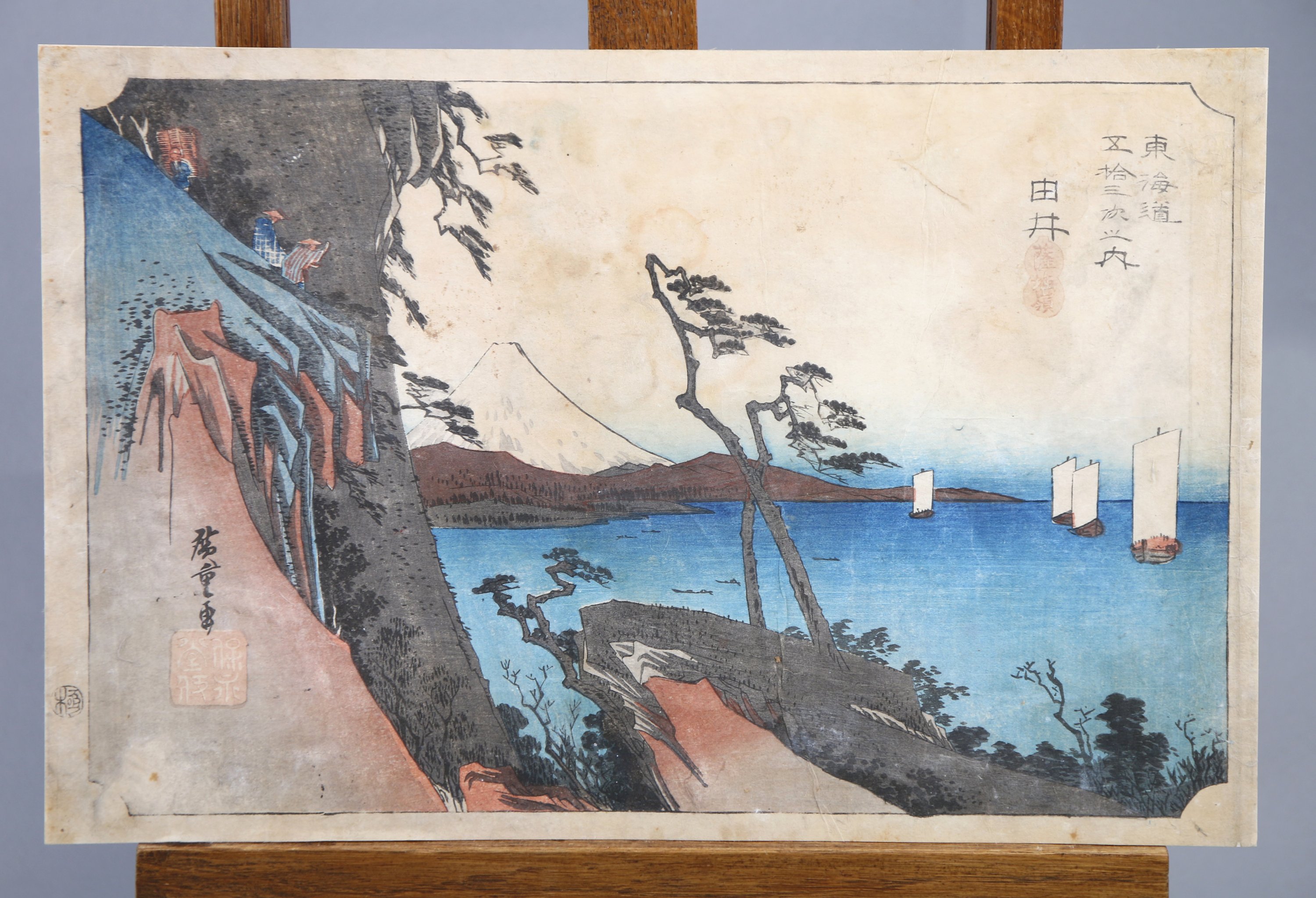 Deux estampes, oban yoko-e, de la série Tokaido gojusan tsugi no uchi, Les cinquante-trois stations du Tokaido, stations 17: Yui Satta-mine, Le pic de Satta, province de Yui, et station 1: Nihonbashi. Signés Hiroshige ga. Editeur Hoeido.