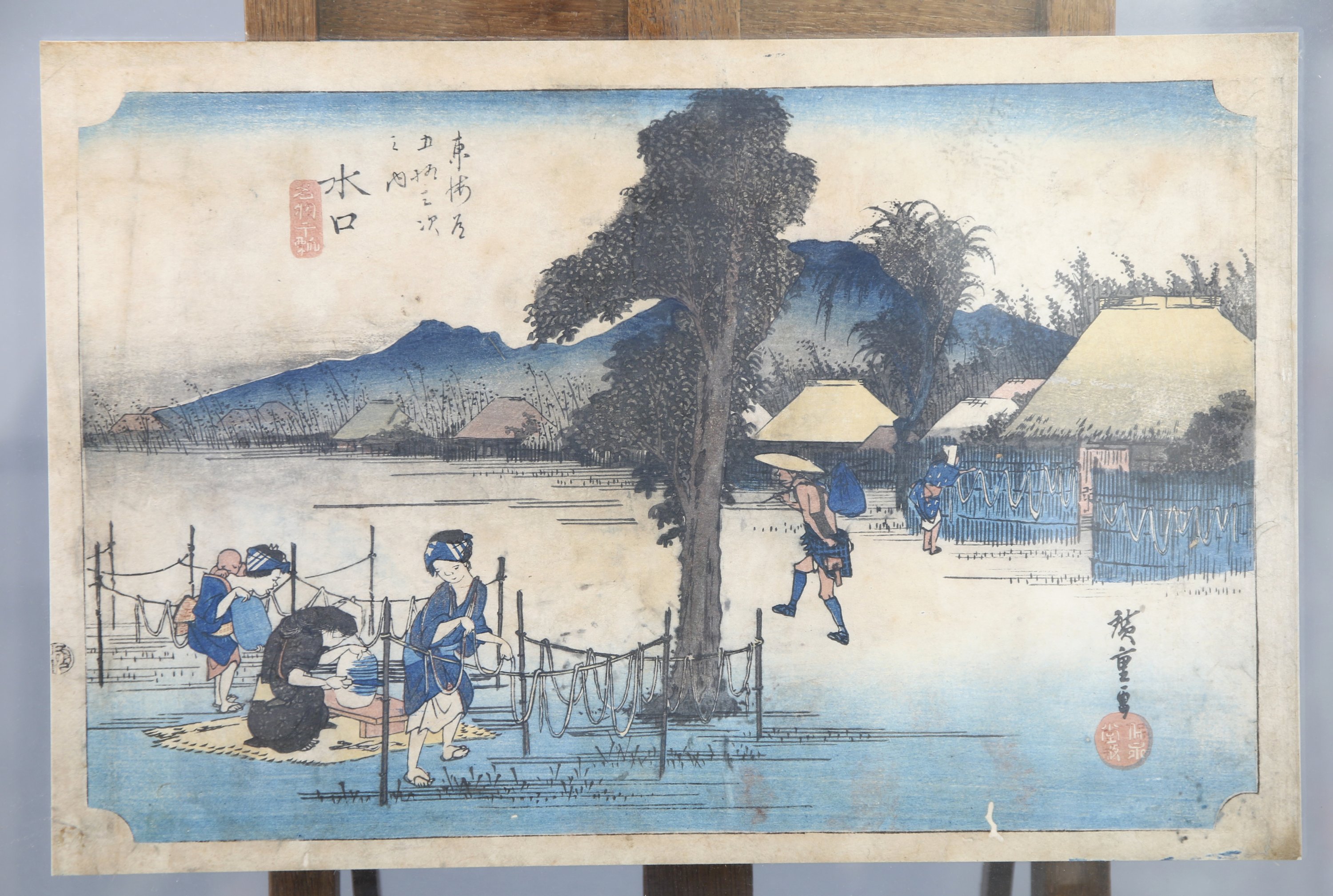 Estampe, oban yoko-e, de la série Tokaido gojusan tsugi no uchi, Les cinquante-trois stations du Tokaido, station Minakuchi meibutsu kanpyo, Minakuchi, célèbre pour sa spécialité locale de gourde séchée.