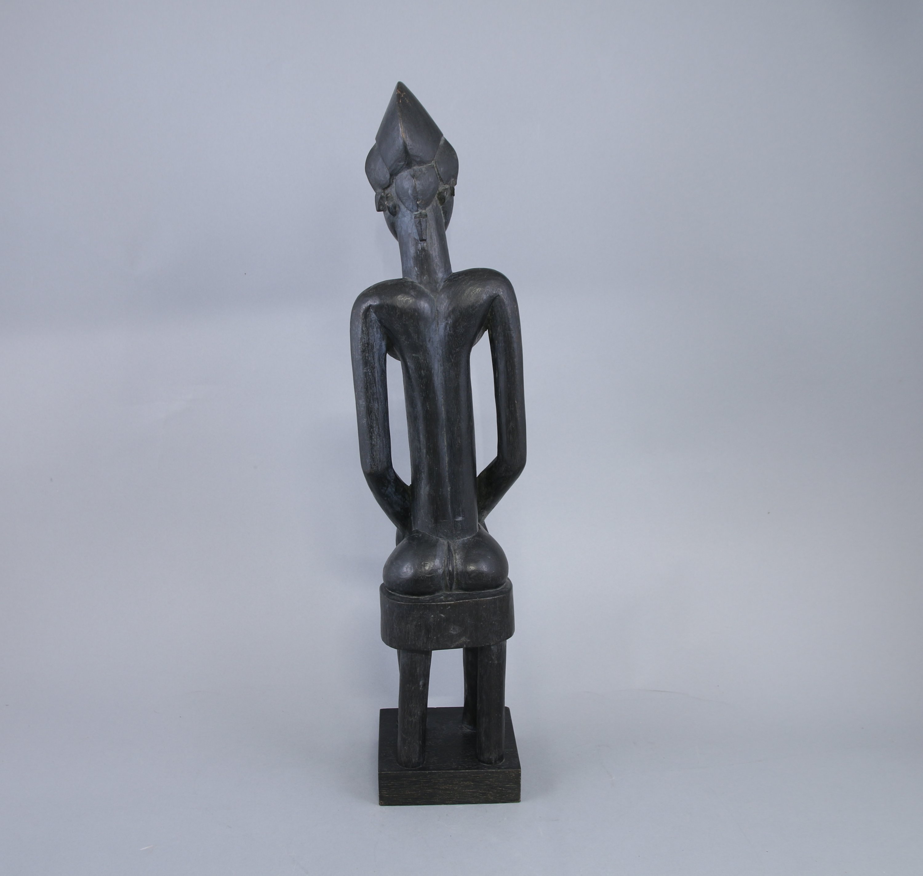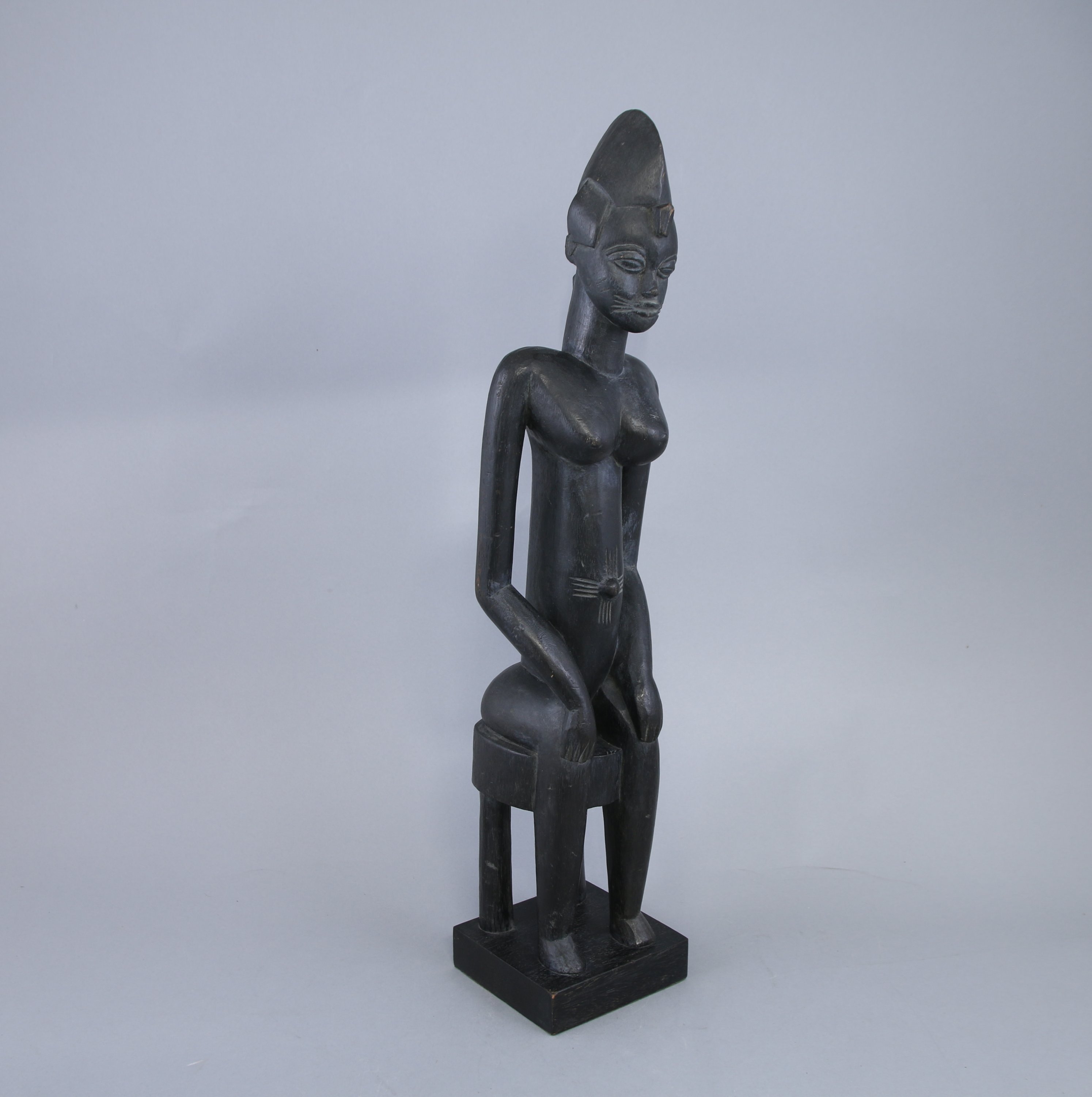 Statue représentant un personnage féminin assis sur un tabouret, les mains posées sur les genoux, le ventre orné de scarifications et la tête à la coiffure en crête à bec de calao.