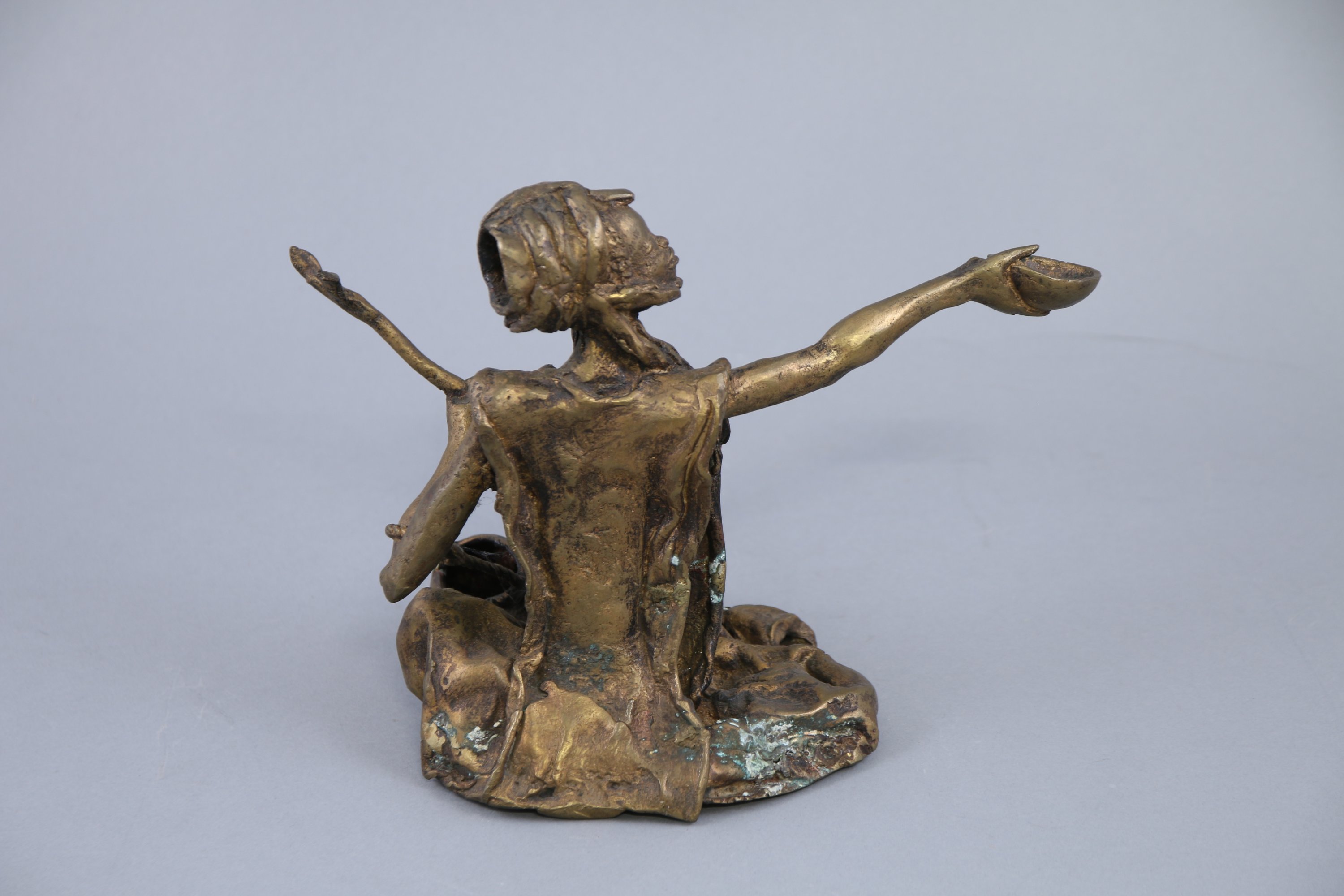 Sculpture représentant un mendiant assis, le bras droit tendu demandant l’aumône