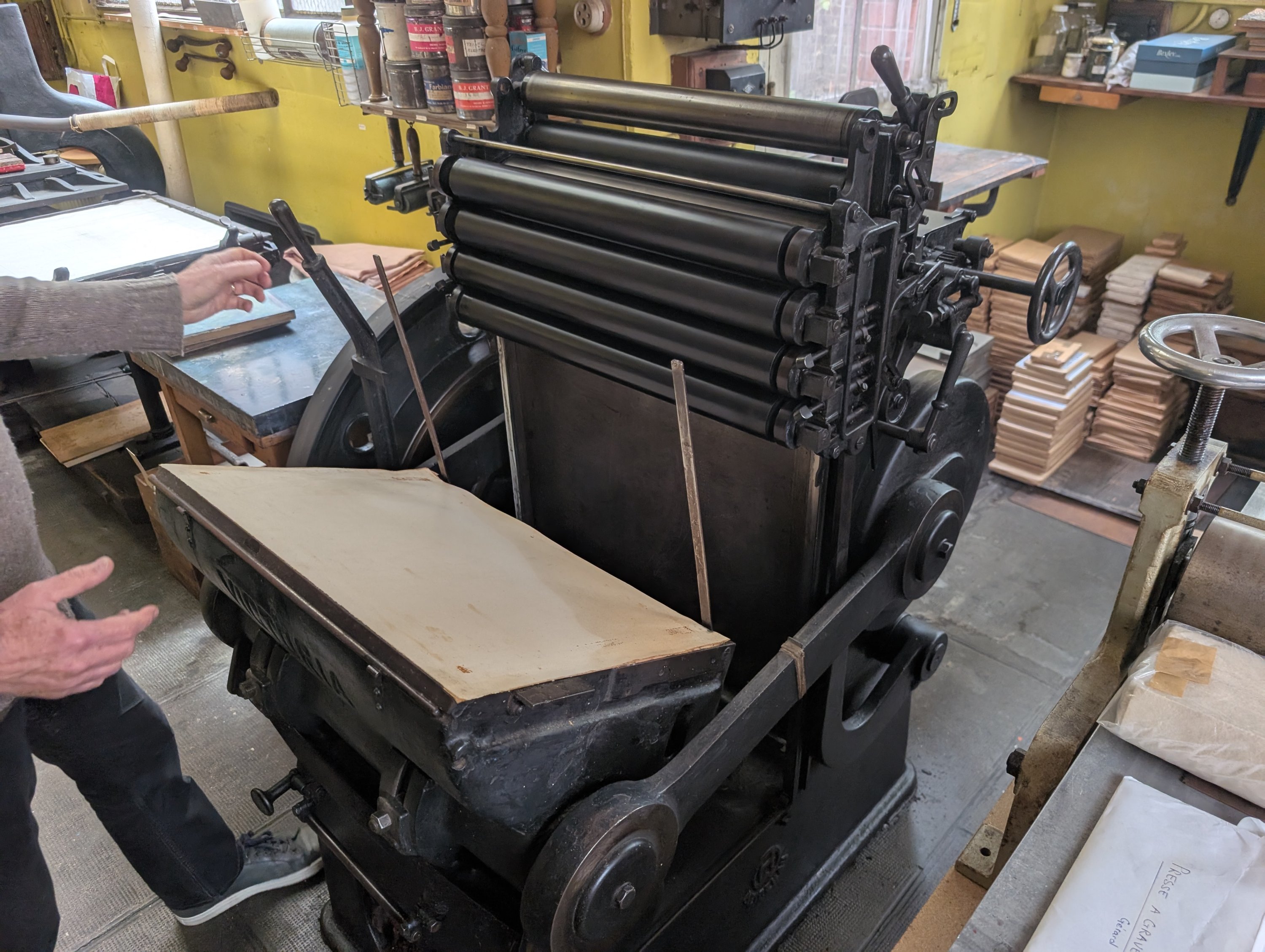 Presse à platine lourde à moteur électrique, variateur de vitesse, avec 2 châssis, un jeu de rouleaux (à regarnir), 2 tablettes hautes sur lesquelles sont empilées les feuilles d’impression, mandrin de rechang.