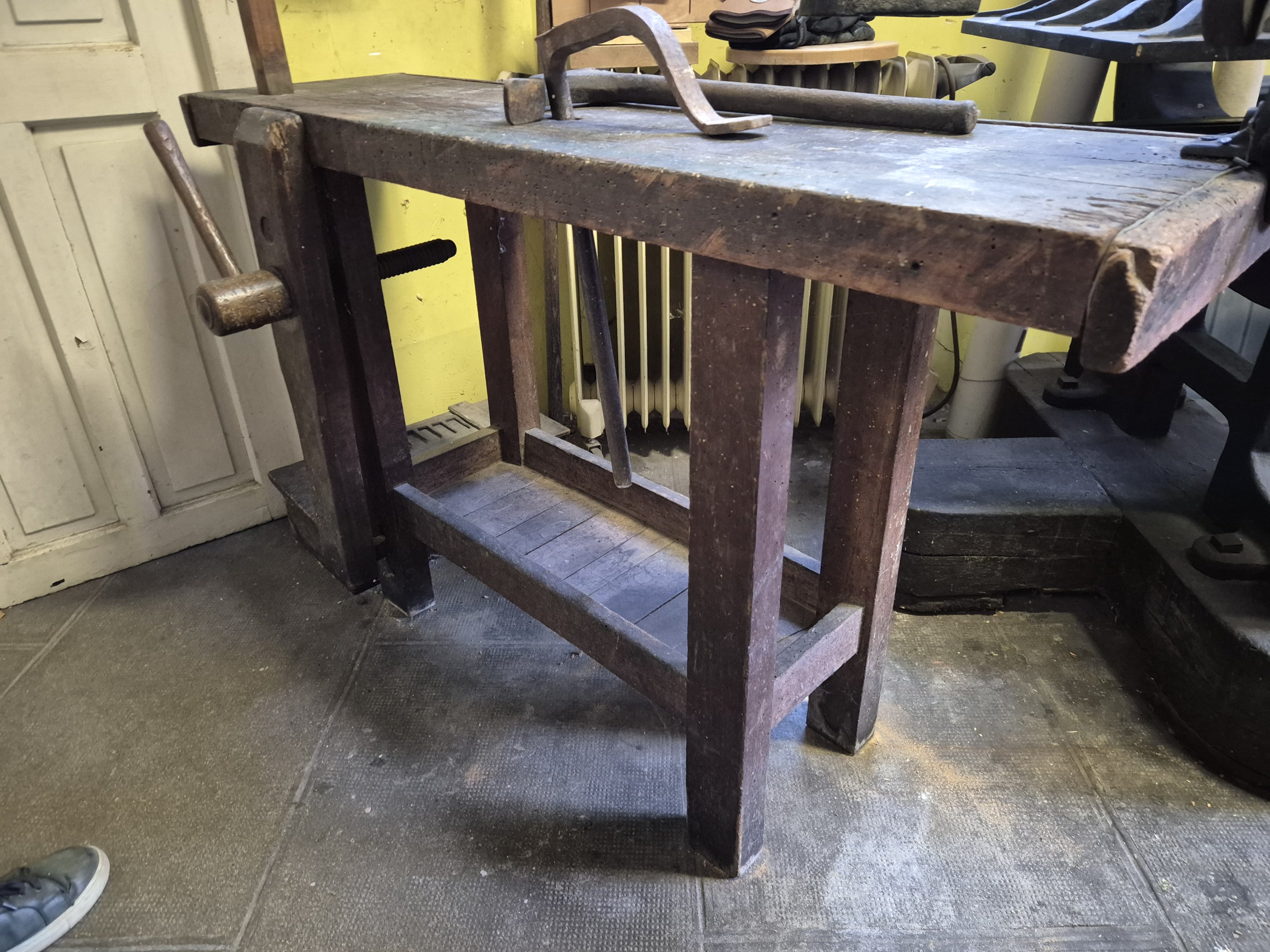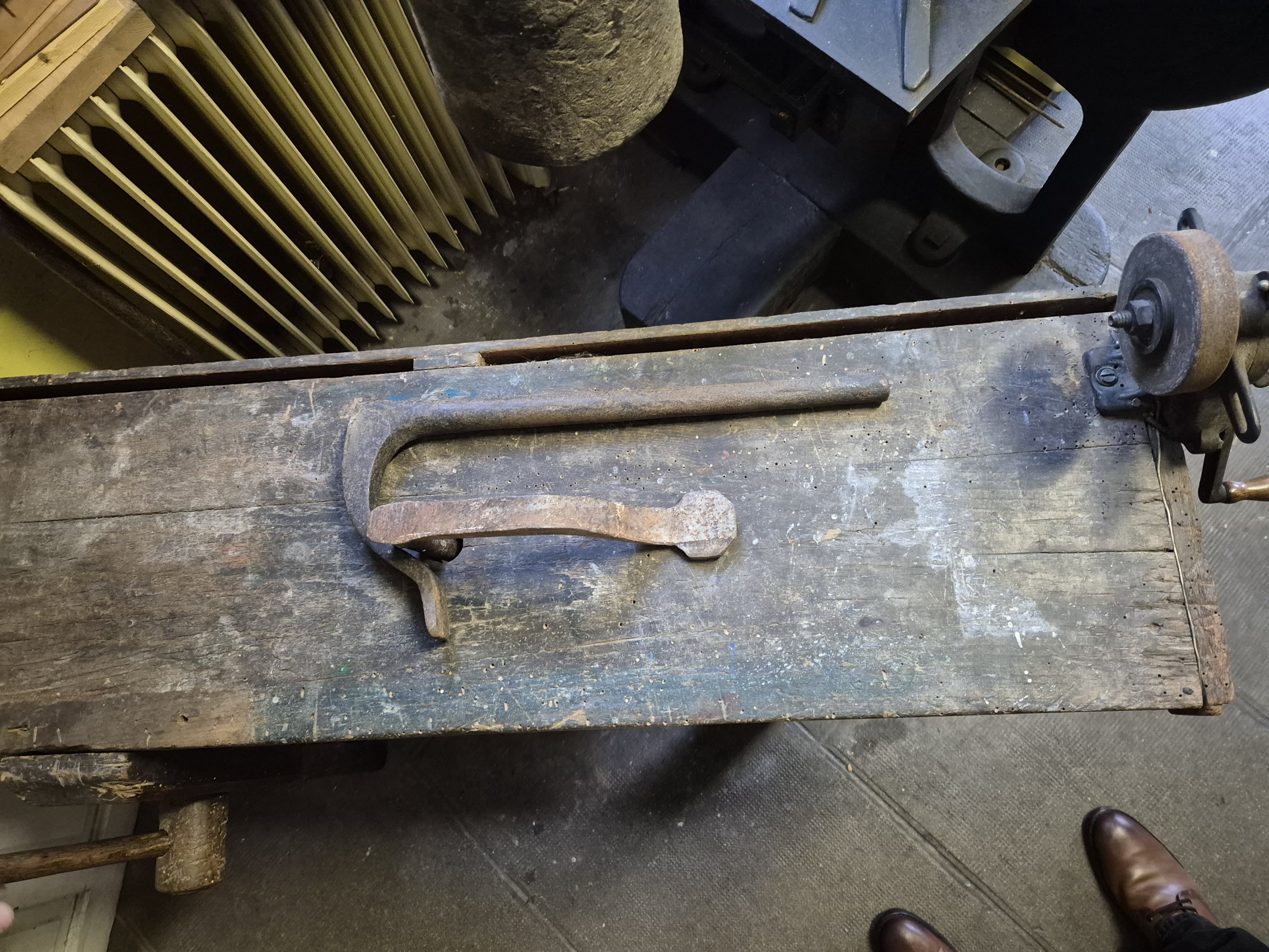 Un établi équipé d’un aiguisoir à manivelle et de divers outils anciens.