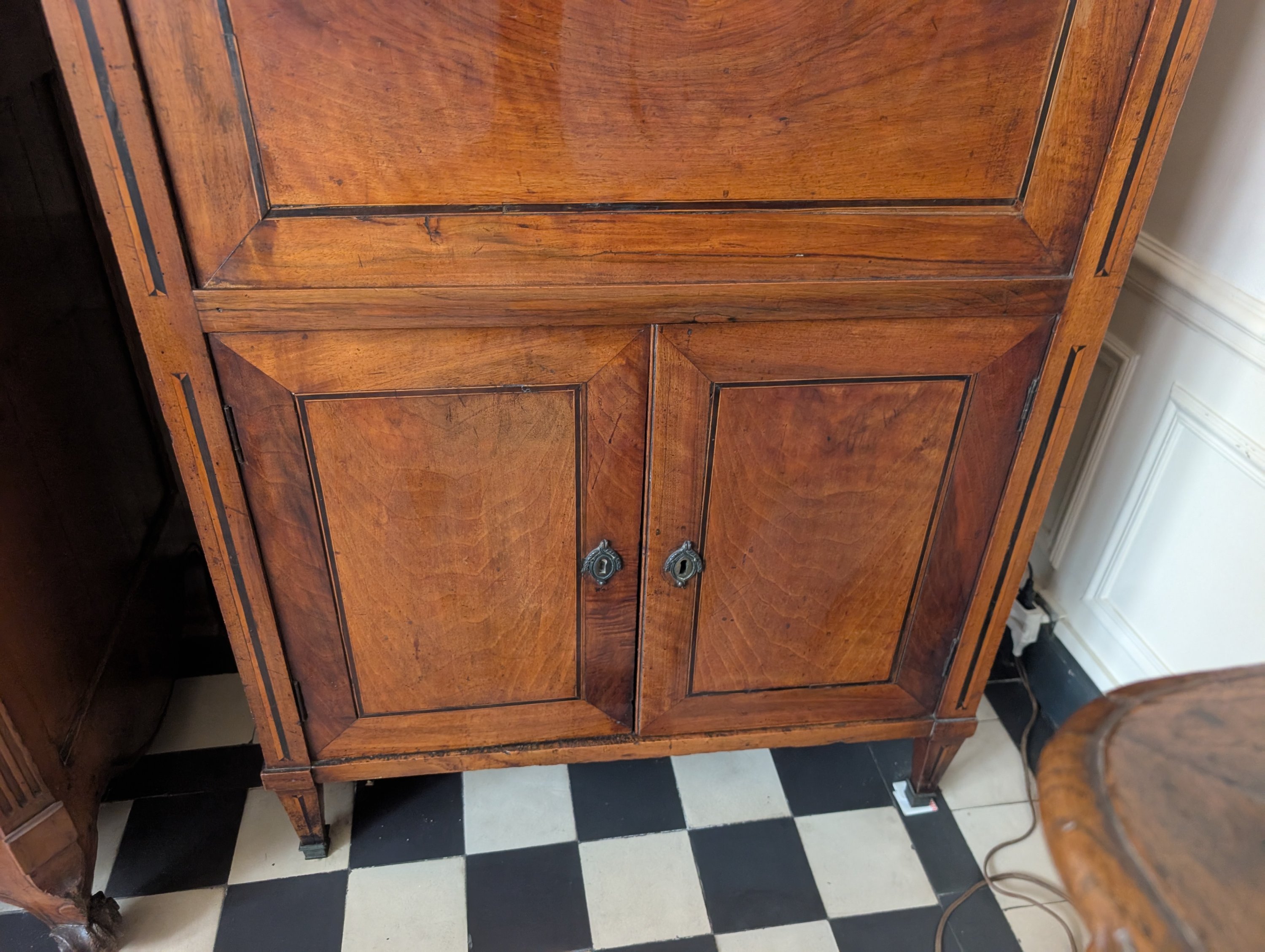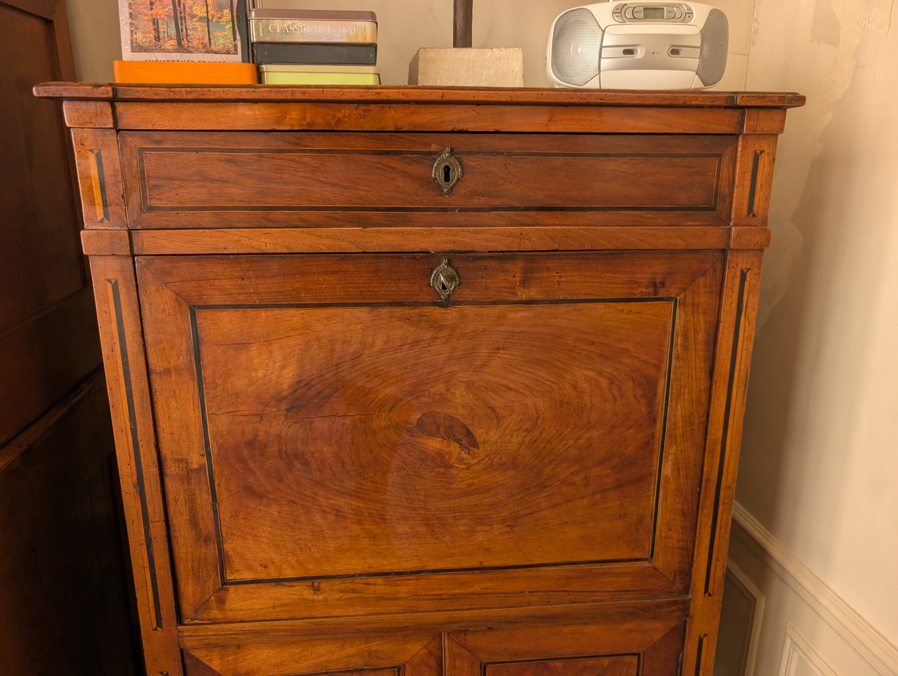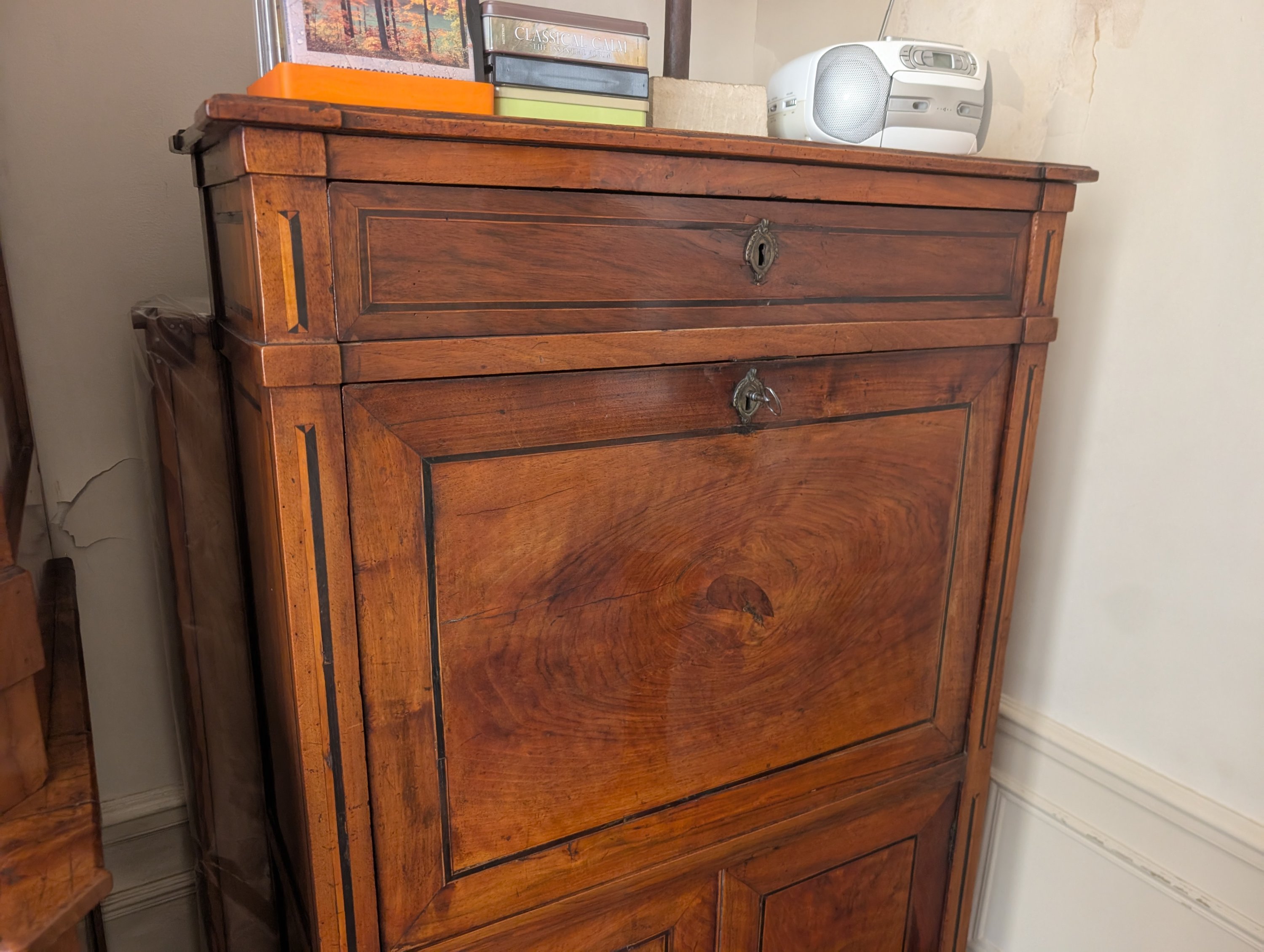 Il ouvre par un tiroir et deux portes en partie basse et repose sur quatre pieds en gaine fuselés.