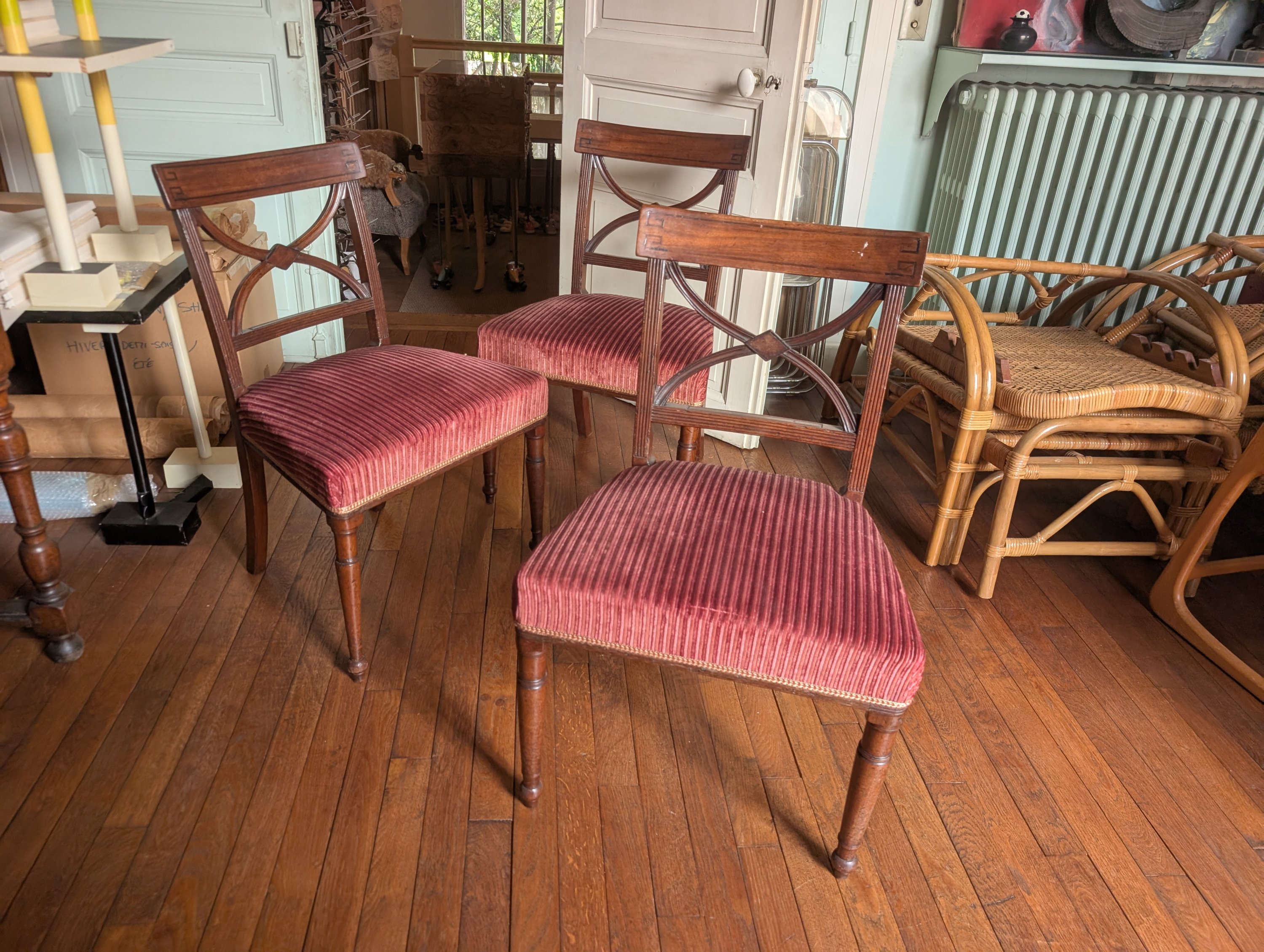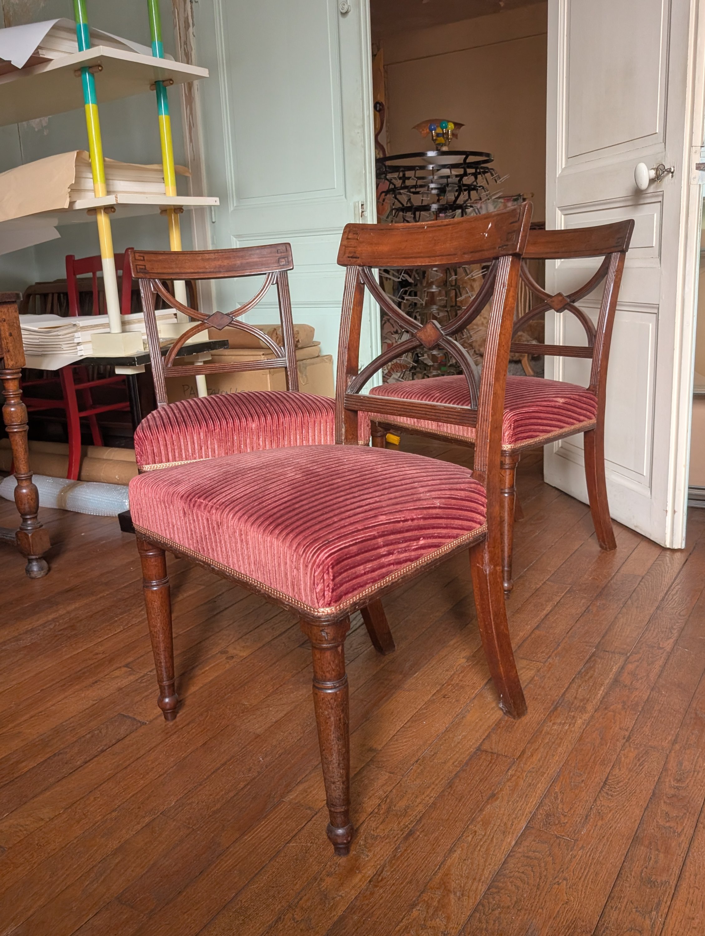 Le dossier légèrement cabriolet ajouré à motif de croisillon reposant sur des pieds en gaines et des pieds sabres.