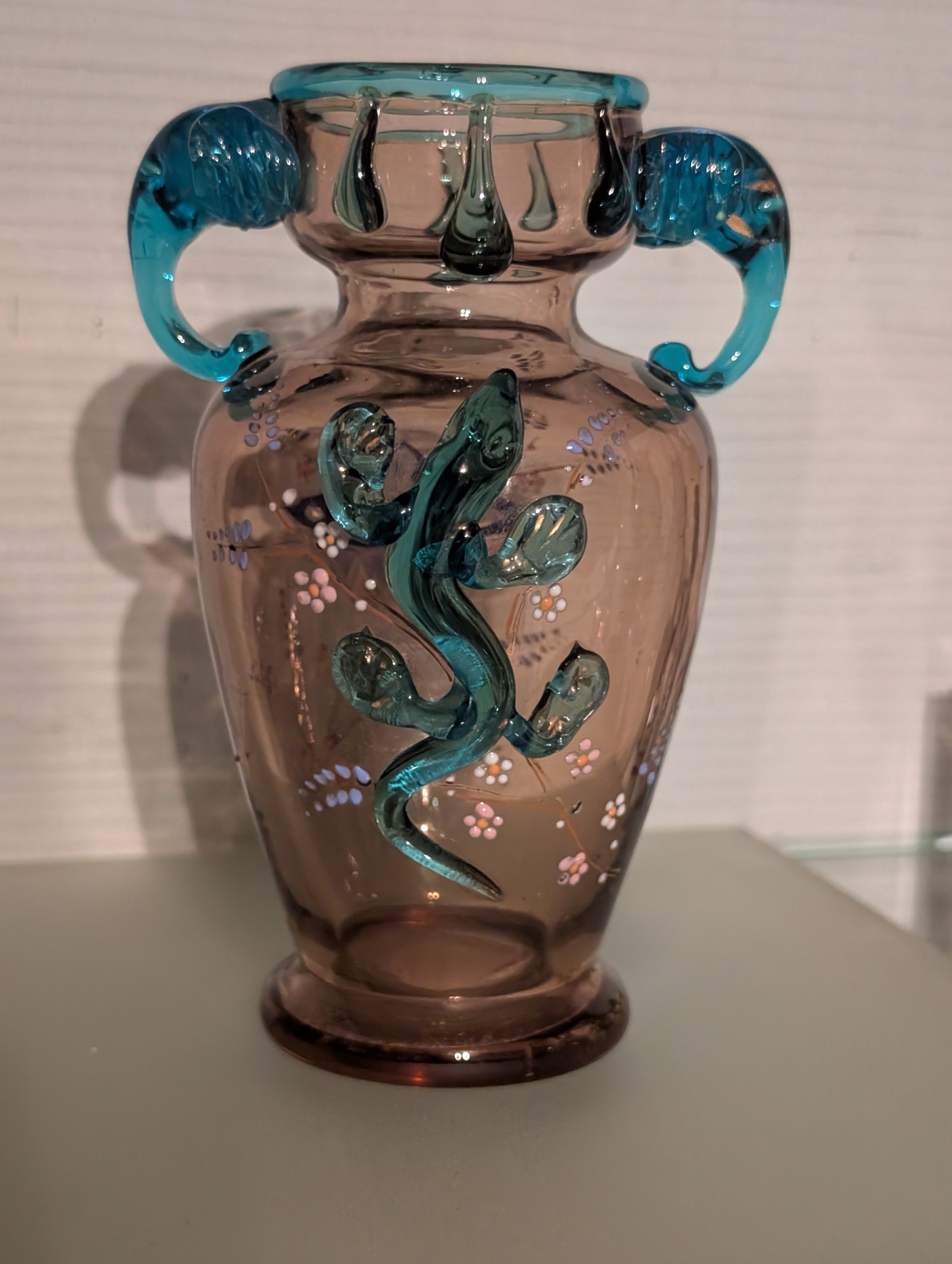Verre filé avec des plaque en verre bleu et un décor émaillé.