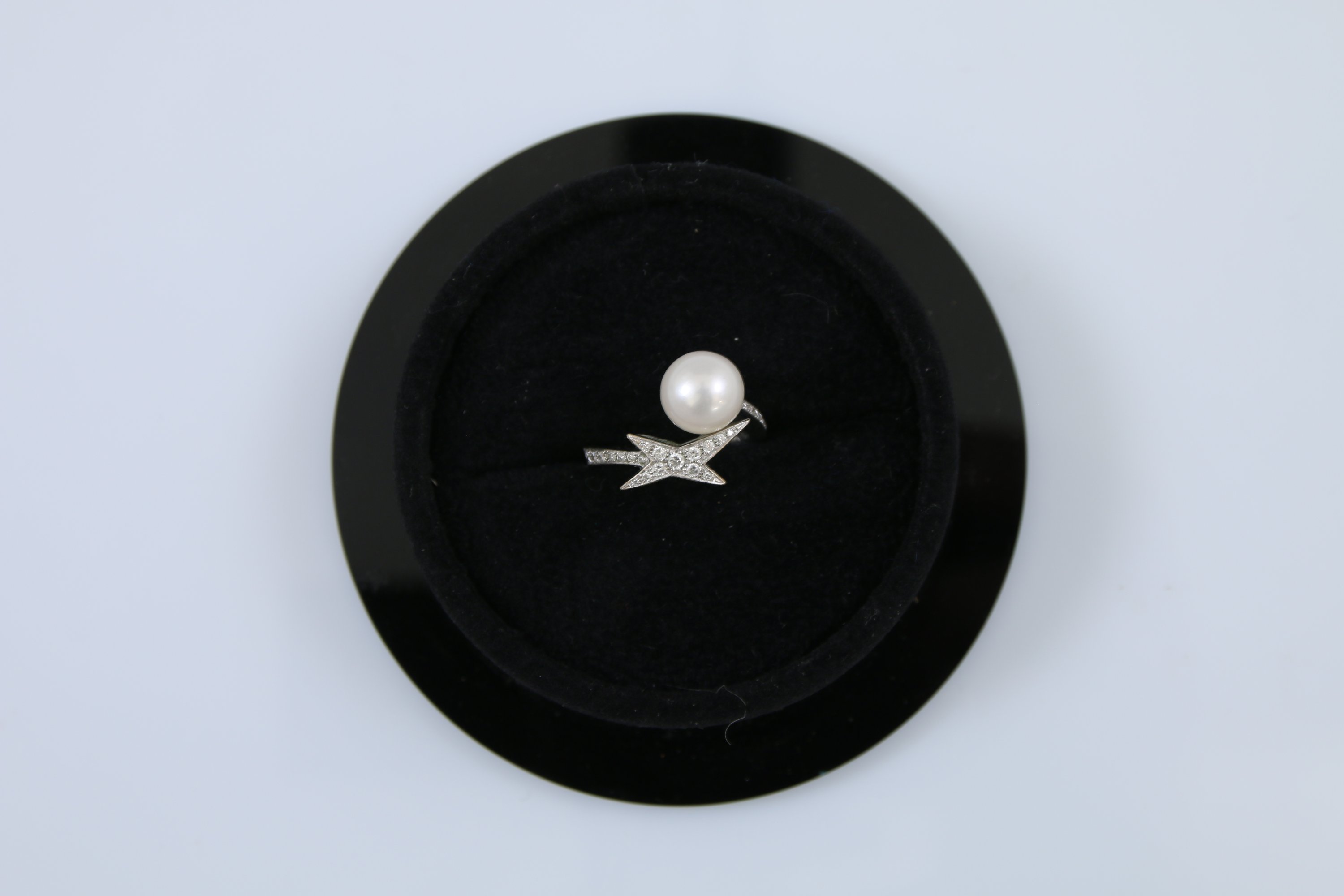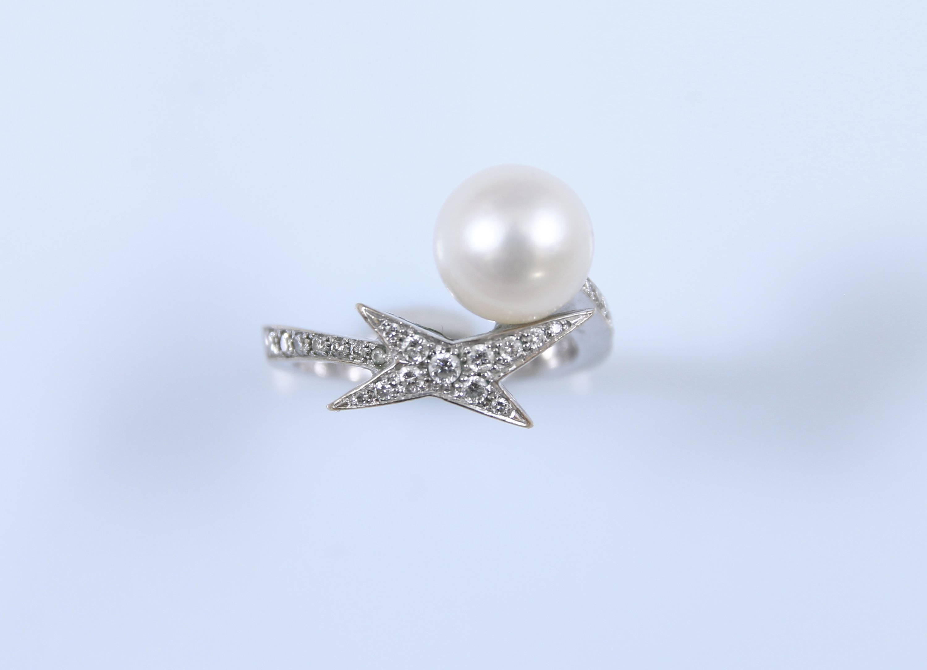 Or gris 750 millièmes sertie de 27 petits diamants en étoile et d'une perle blanche.