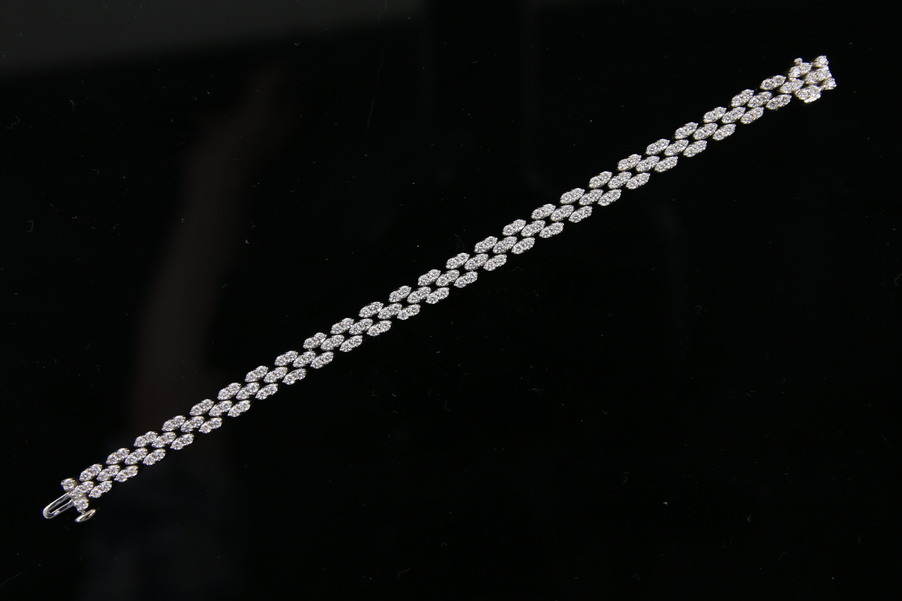 Sécoré de trois lignes de diamants ronds de taille brillant, les maillons de forme navette.