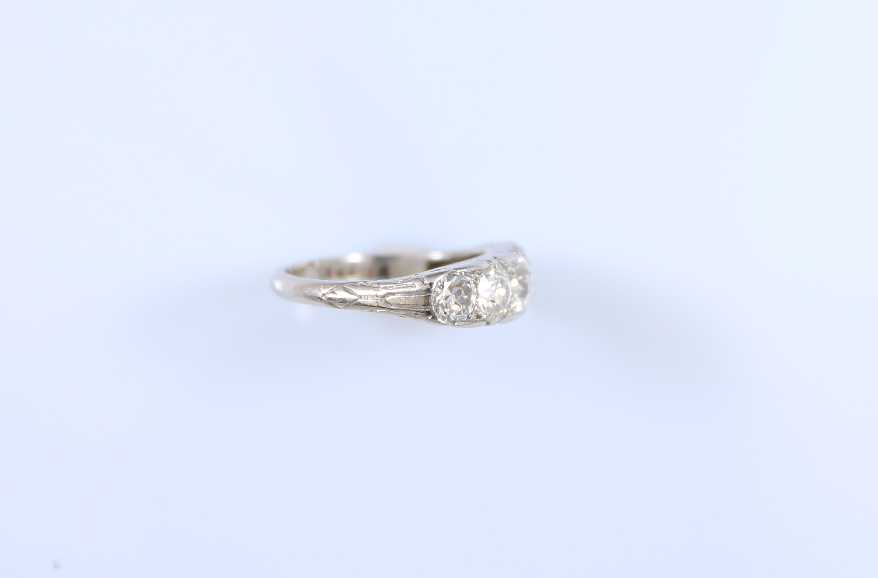 Partiellement gravée à décor d'enroulement, le centre serti d'une ligne de cinq diamants ronds de taille brillant ou de taille ancienne en chute.