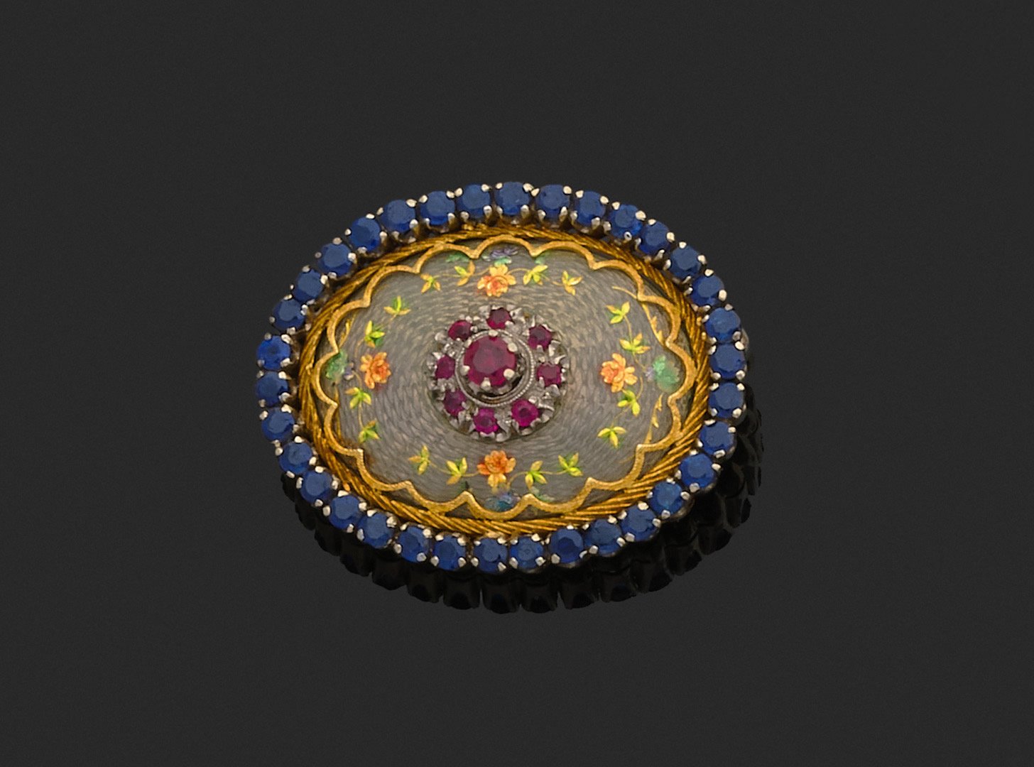 A décor de feuillages appliqué d'un motif serti de rubis et dans un entourage de saphirs ronds.