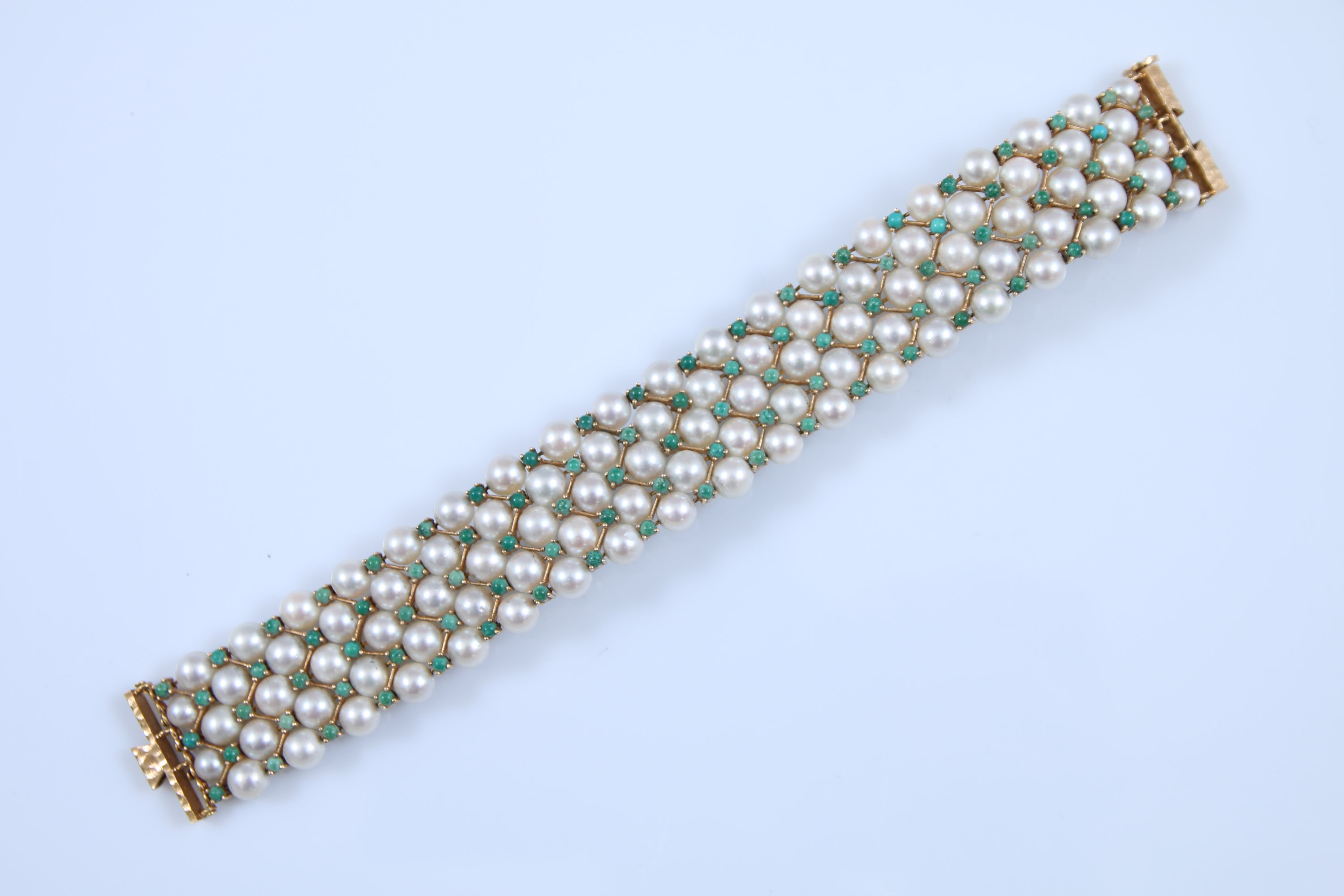 Or jaune 750 millièmes ornée de cinq lignes de perles de culture alternées de pierres vertes de forme cabochon.