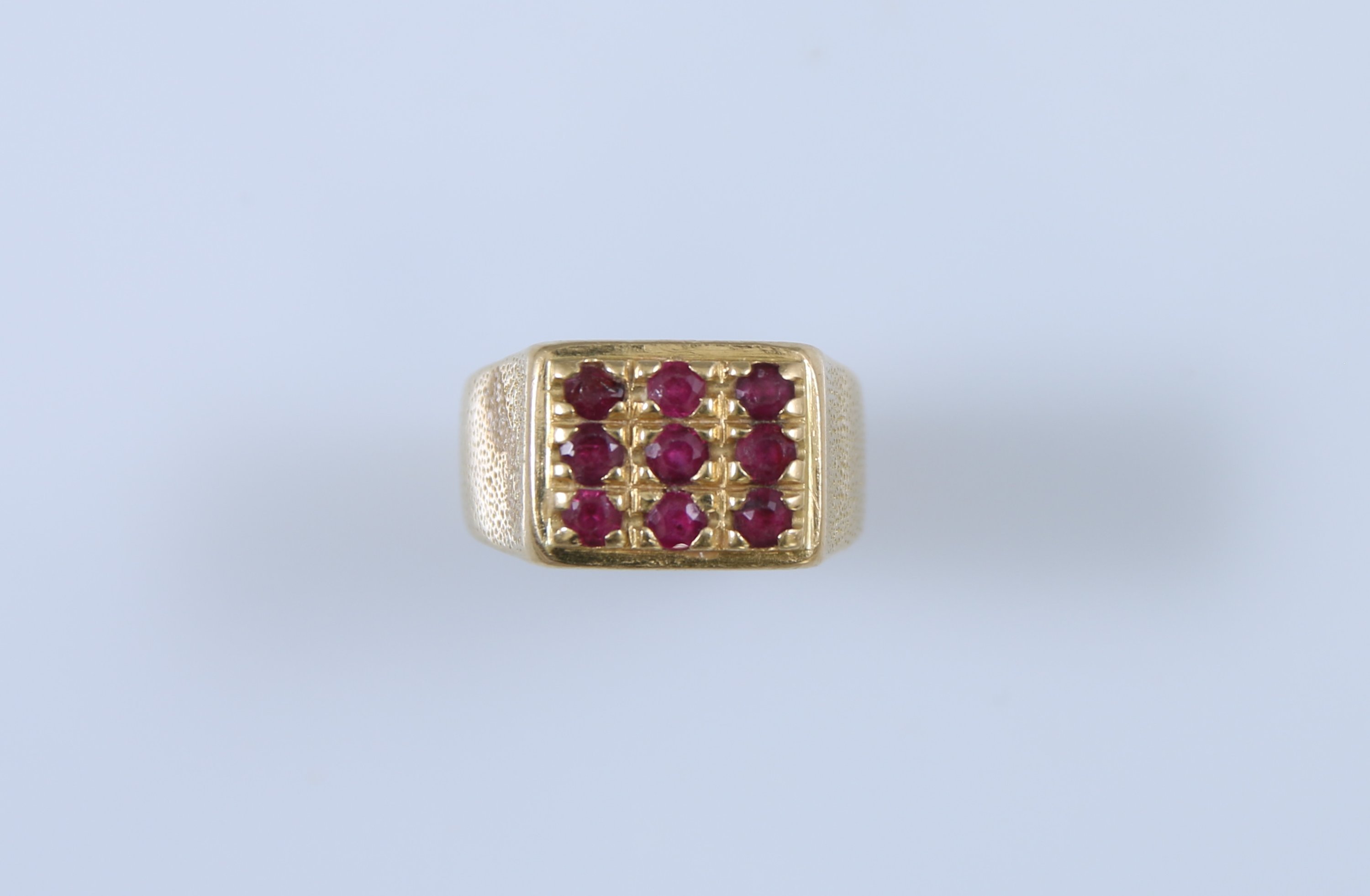 Or jaune 750 millièmes sertie de neuf pierre rouge sur trois rangs.