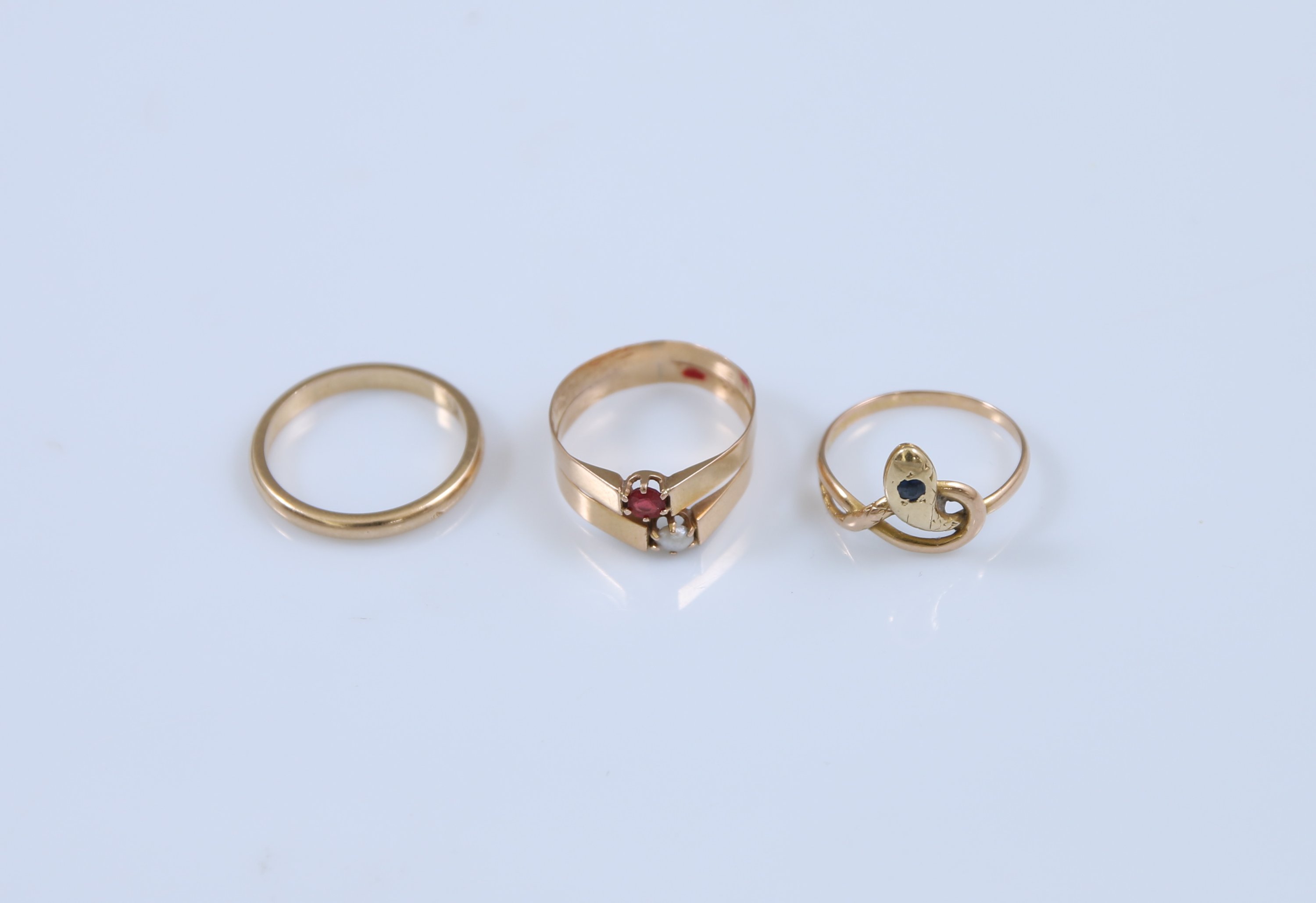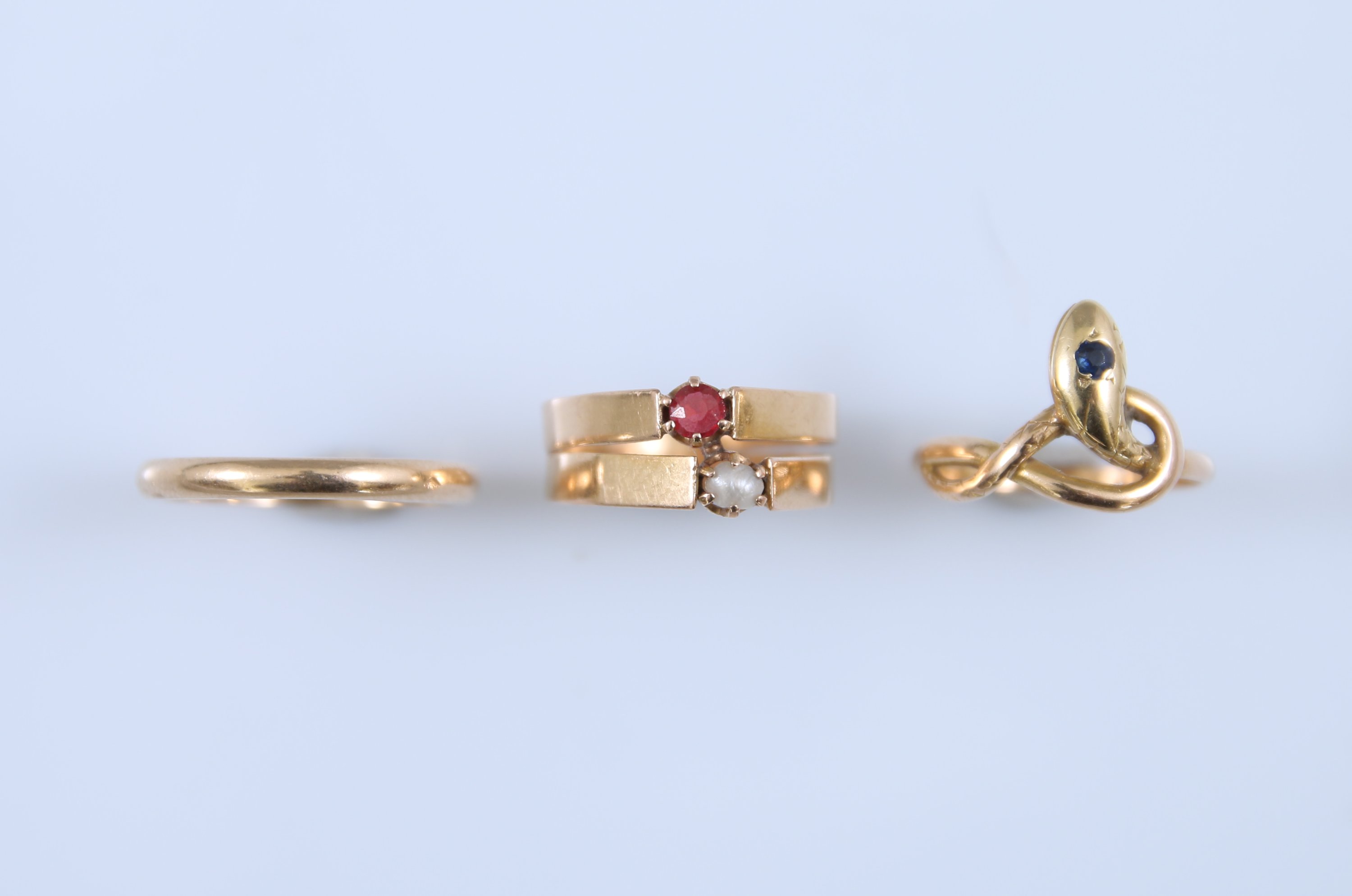 Une des bague en forme de serpent sertie d'une pierre bleue et l'autre en forme de double jonc sertie d'une petite perle et d'une pierre rouge.