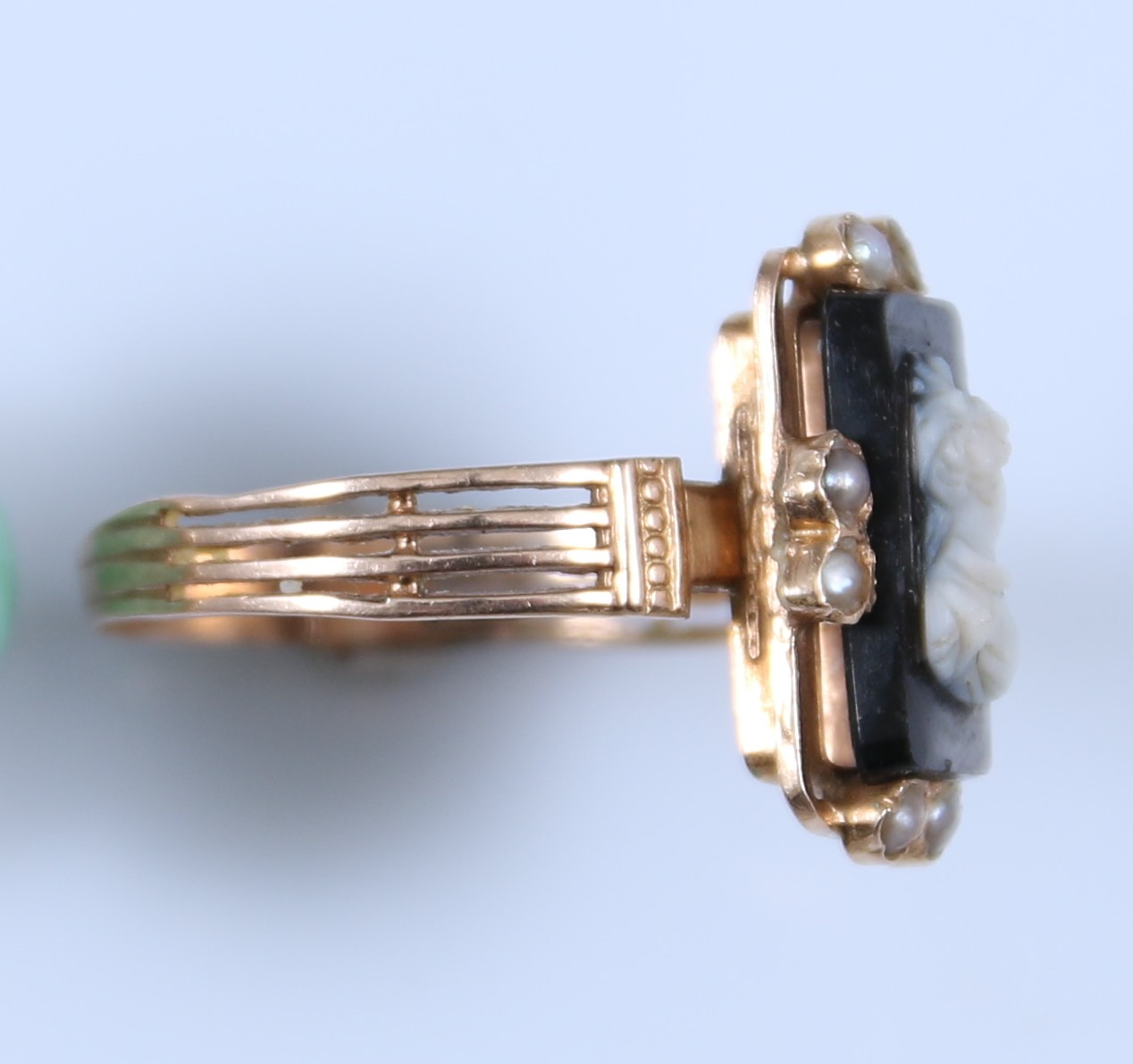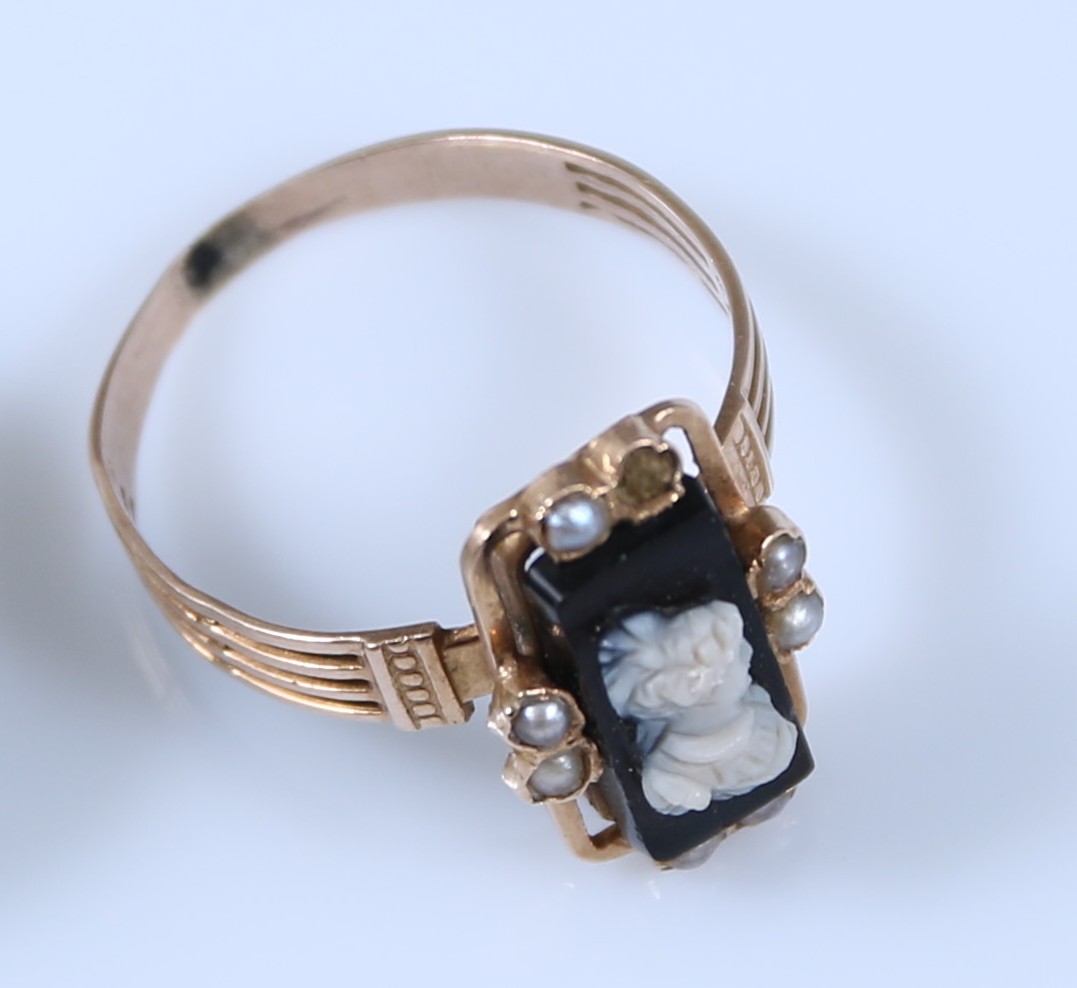 Or jaune 750 millièmes, au chaton au profil féminin à l'imitation d'un camée.