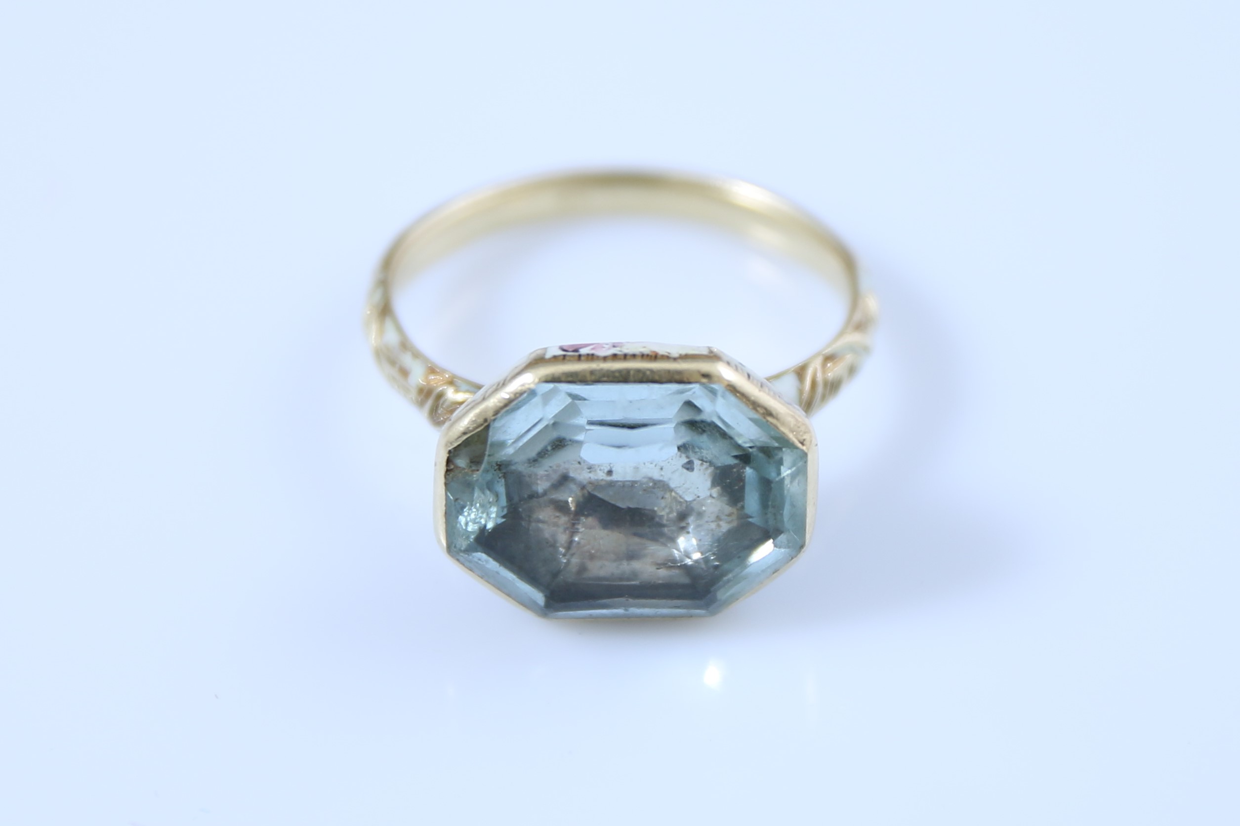 Or jaune 750 millièmes partiellement émaillée en polychromie, le centre orné d'une aigue-marine de forme octogonale serti-clos sur clinquant, le dessus facetté.