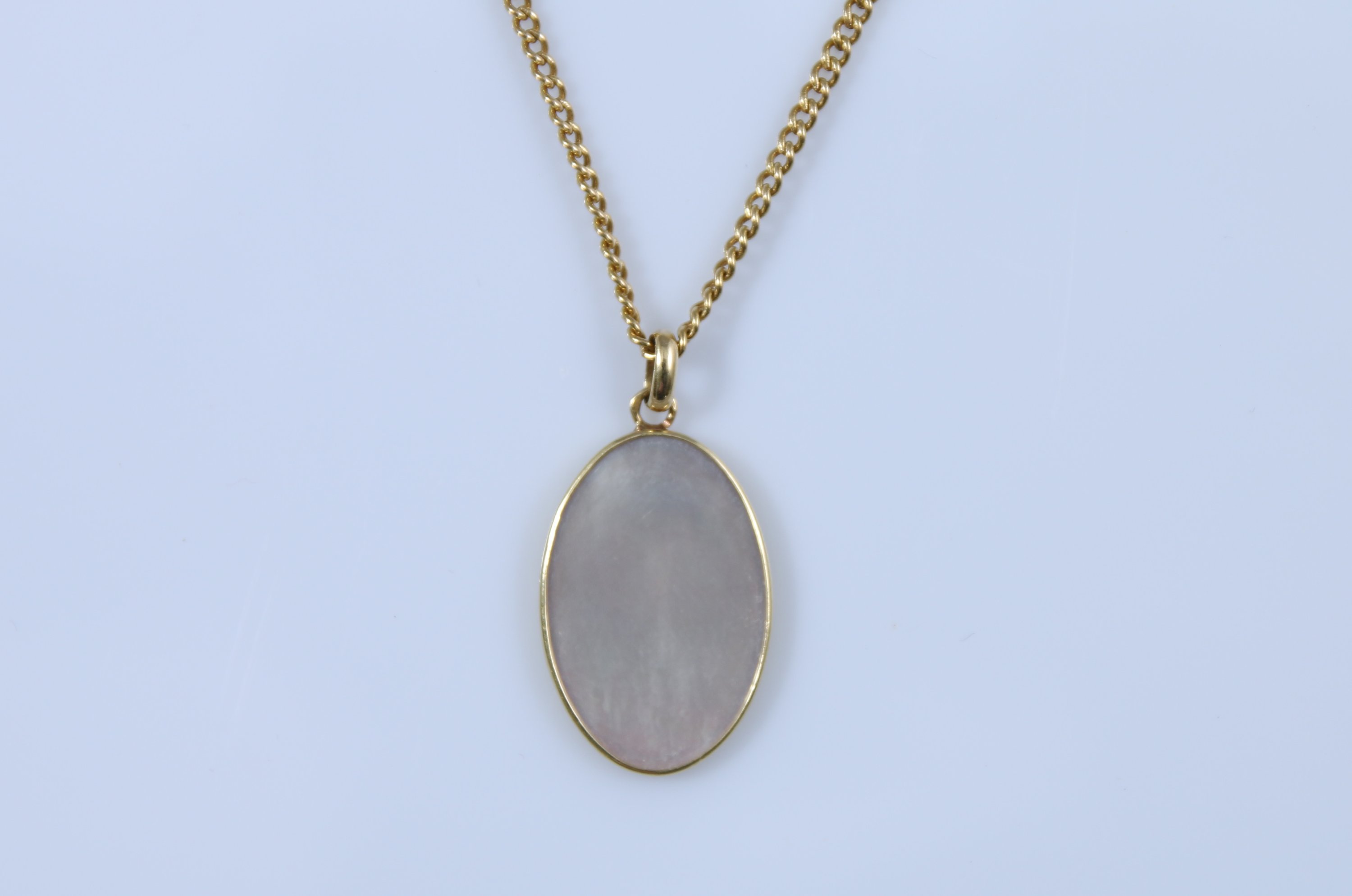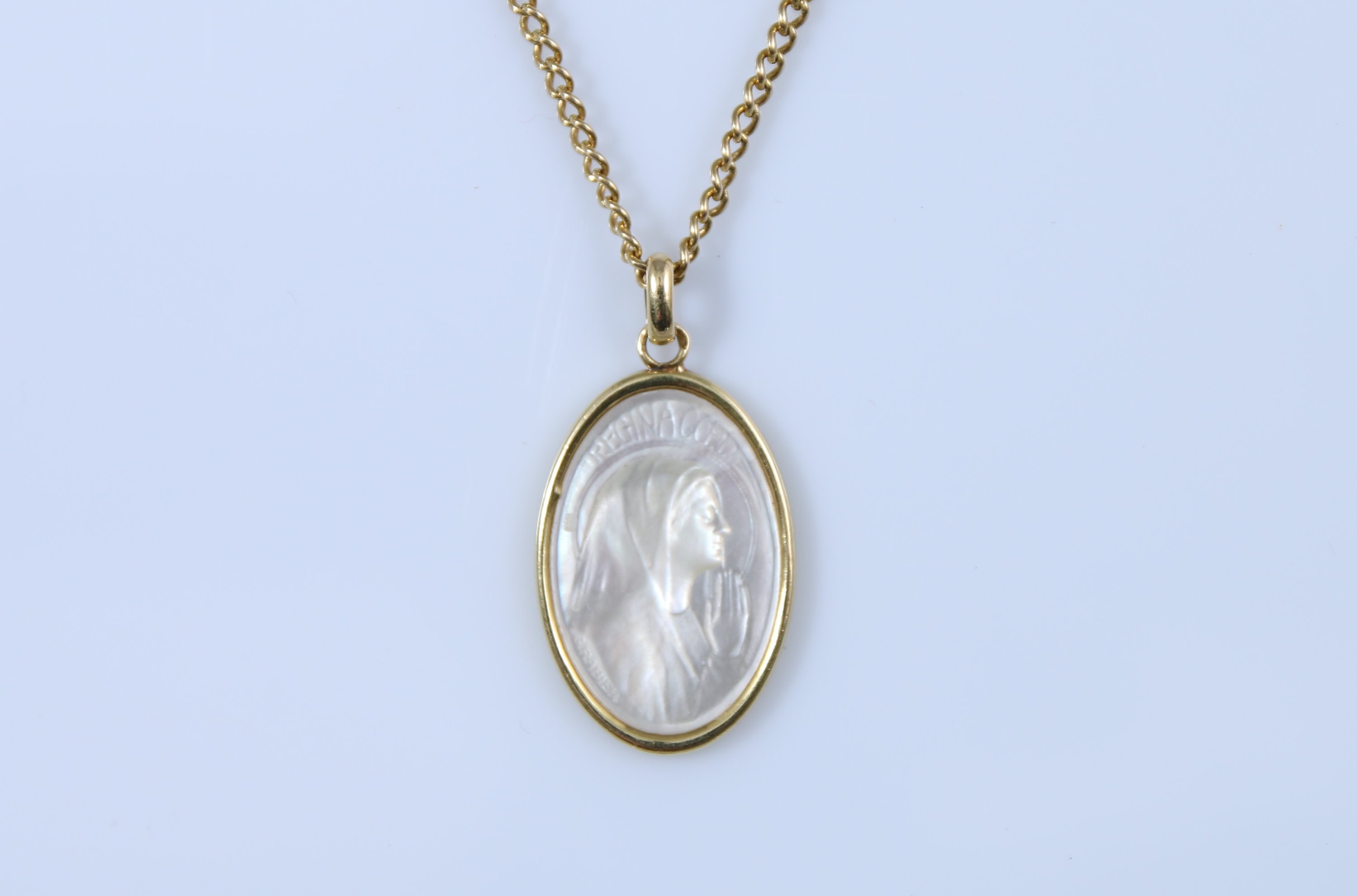 La chaîne à mailles forçat et le médaillon en nacre au profil de la Vierge signé Grabier.