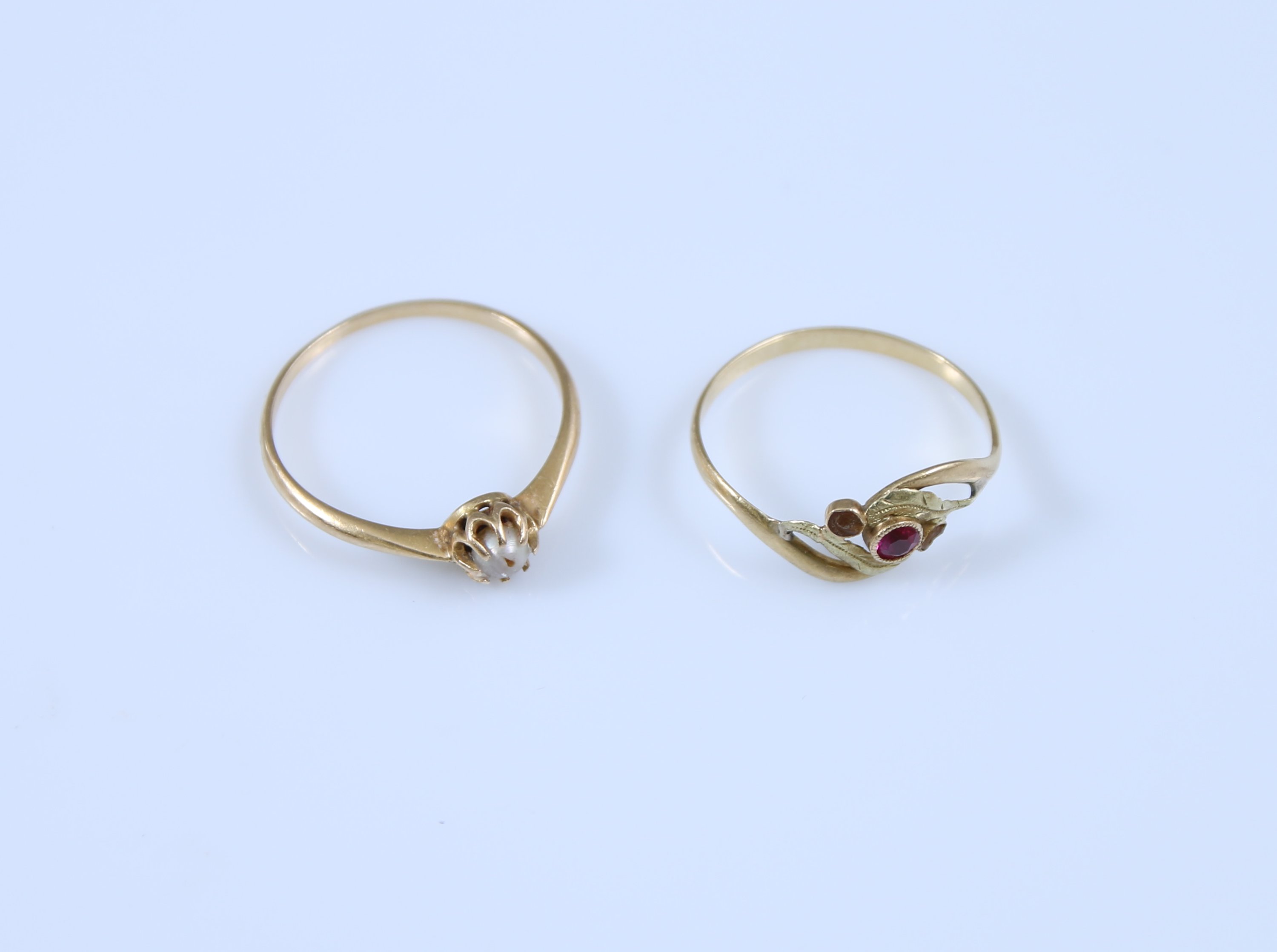 Or jaune 750 millièmes, l'une sertie d'une perle, l'autre d'une pierre rose dans un entourage de feuilles.