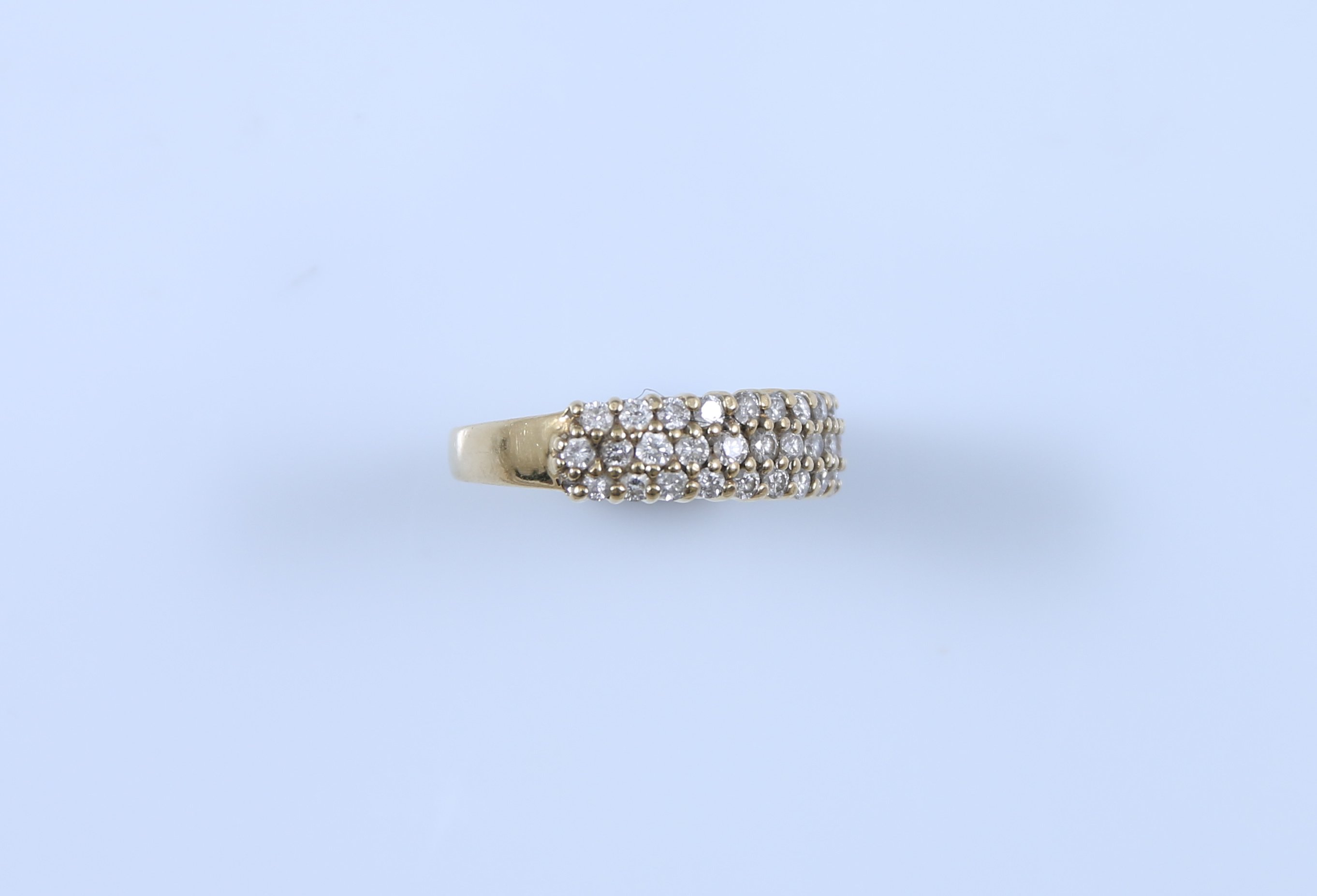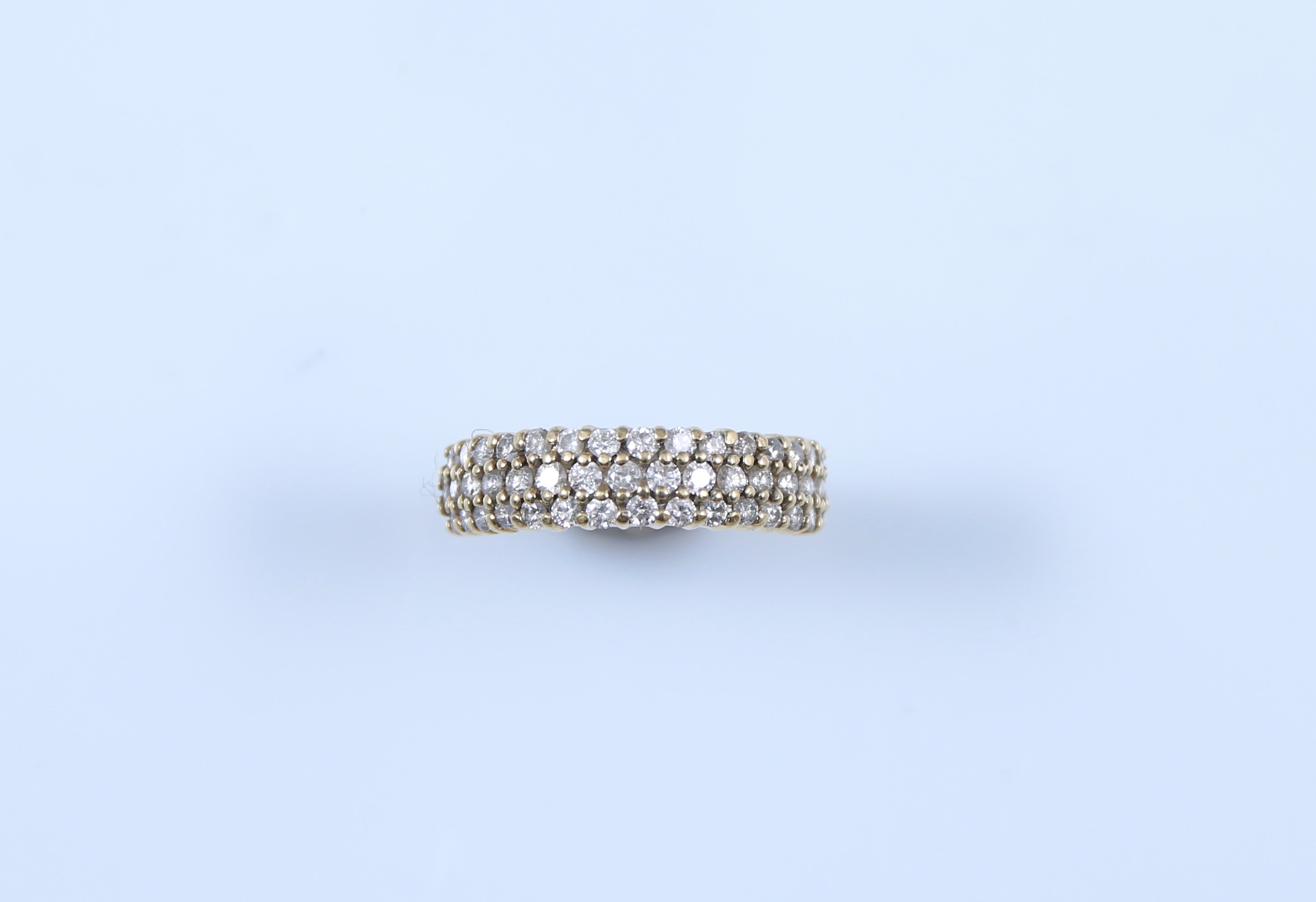 Or jaune 750 millièmes ornée au centre de trois lignes de diamants ronds de taille brillant.