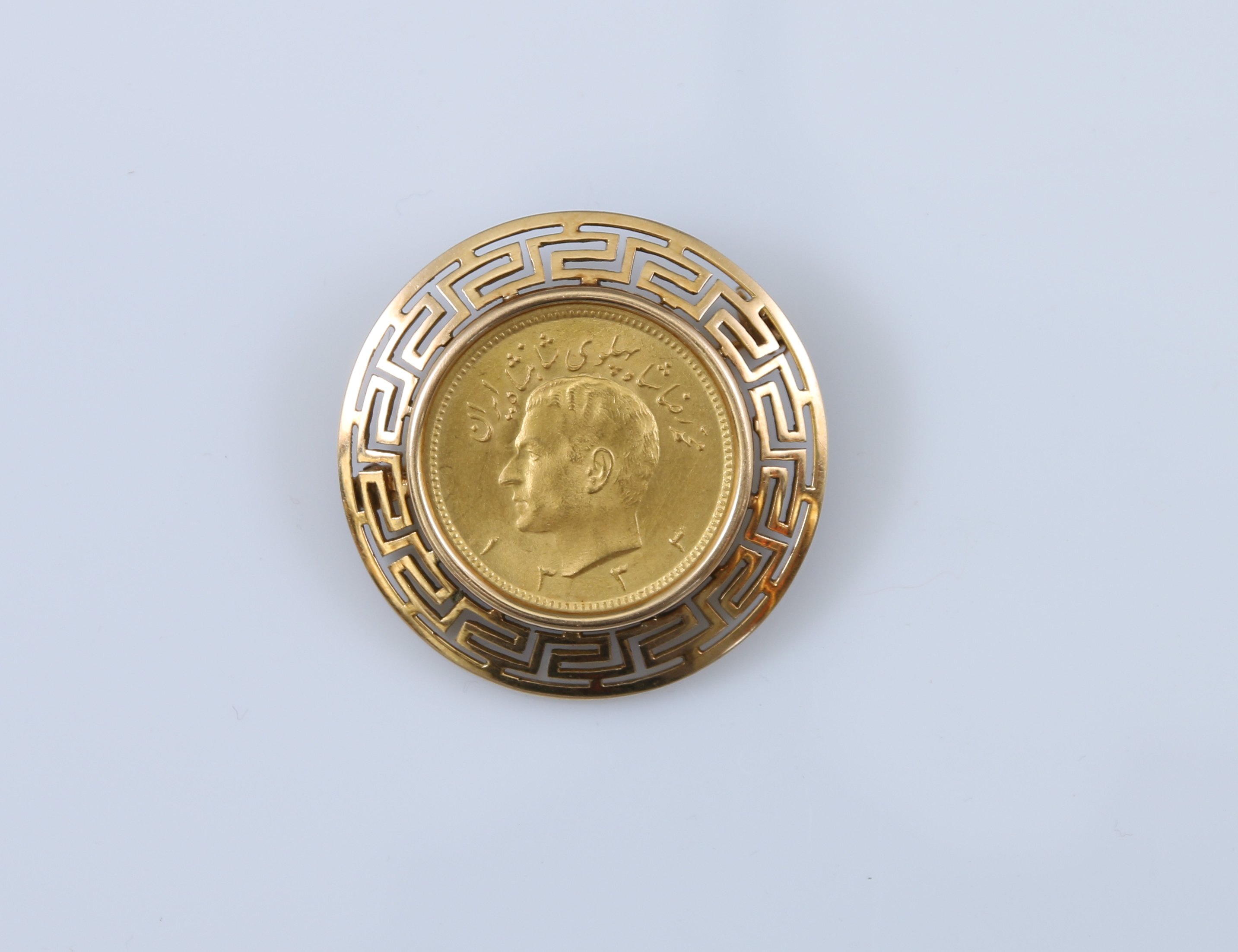 Or jaune 750 millièmes., à décor de grecques et ornée d'une pièce d'un Pahlavi or à l'éffigie de Mohammad Riza SH1333 (1954).
