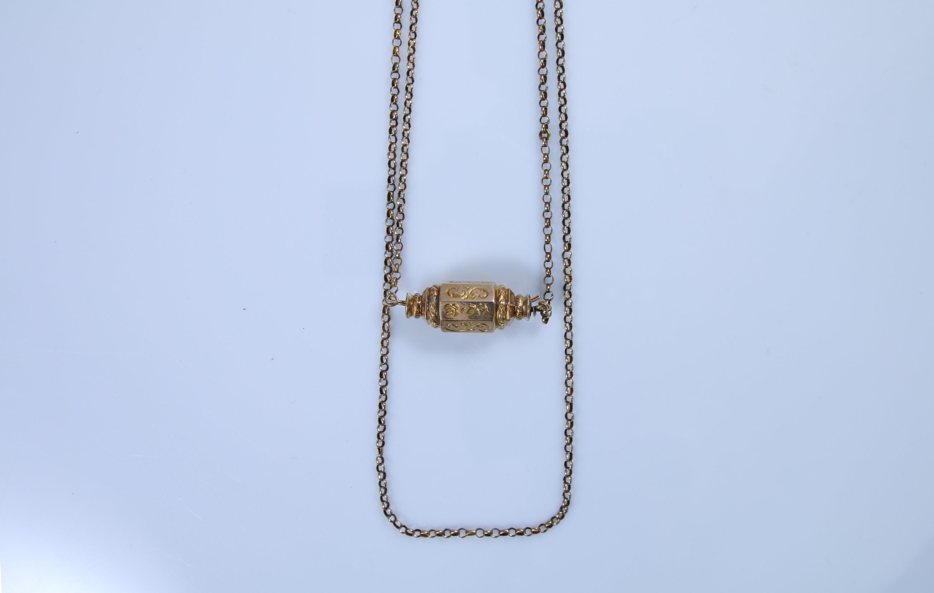 La chaine à mailles forçats à plusieurs rangs terminés par un pendentif de forme octogonale à décor de rinceaux et fleurs épanouies.