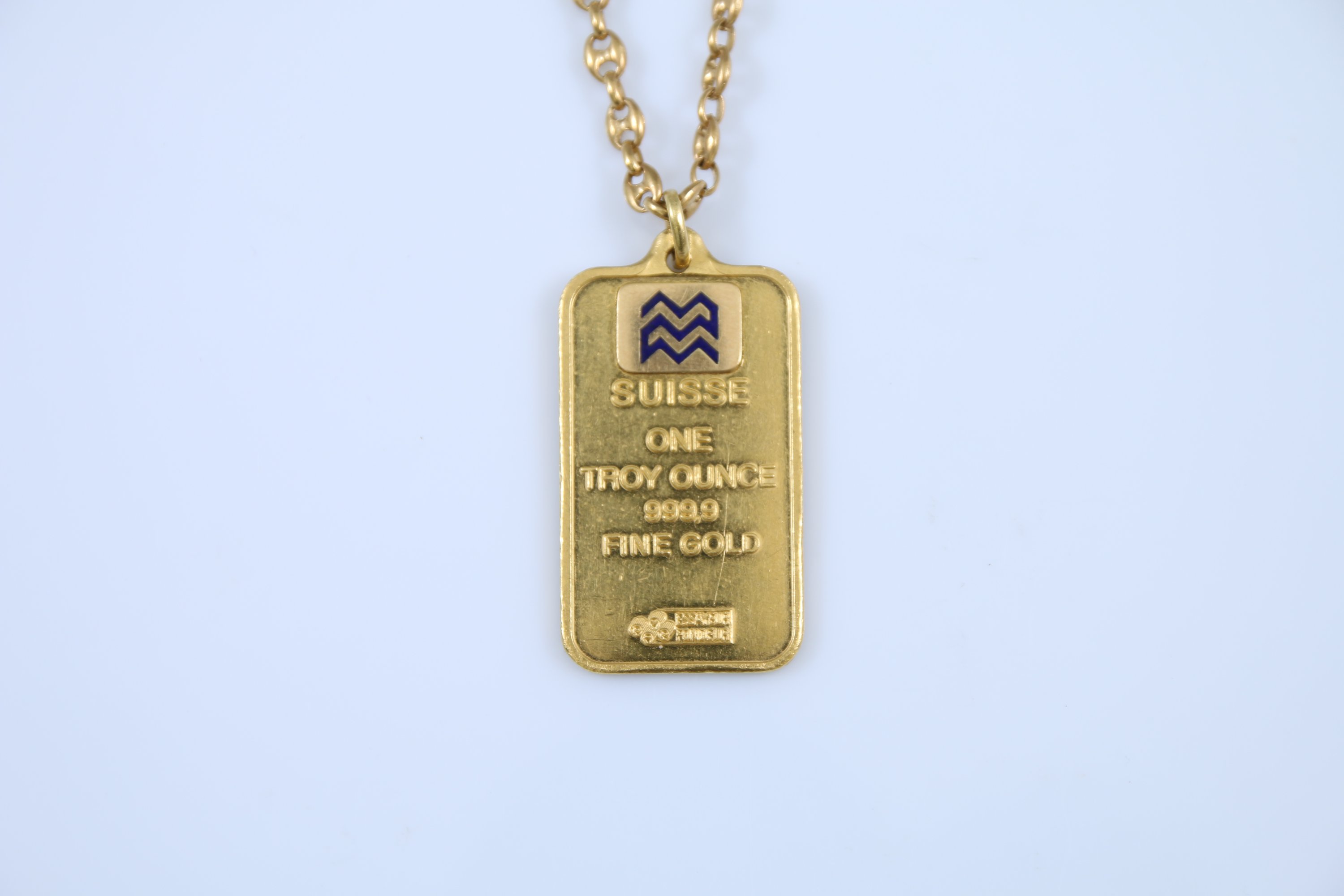 La chaine à mailles grains de café en or jaune 750 millièmes et le pendentif en or jaune 999,9 millièmes avec une figure de l'abondance sur l'avers et un symbole émaillé et la mention "Suisse One Troy Ounce 999.9 fine Gold" au revers. Sa bélière en or jaune 750 millièmes.