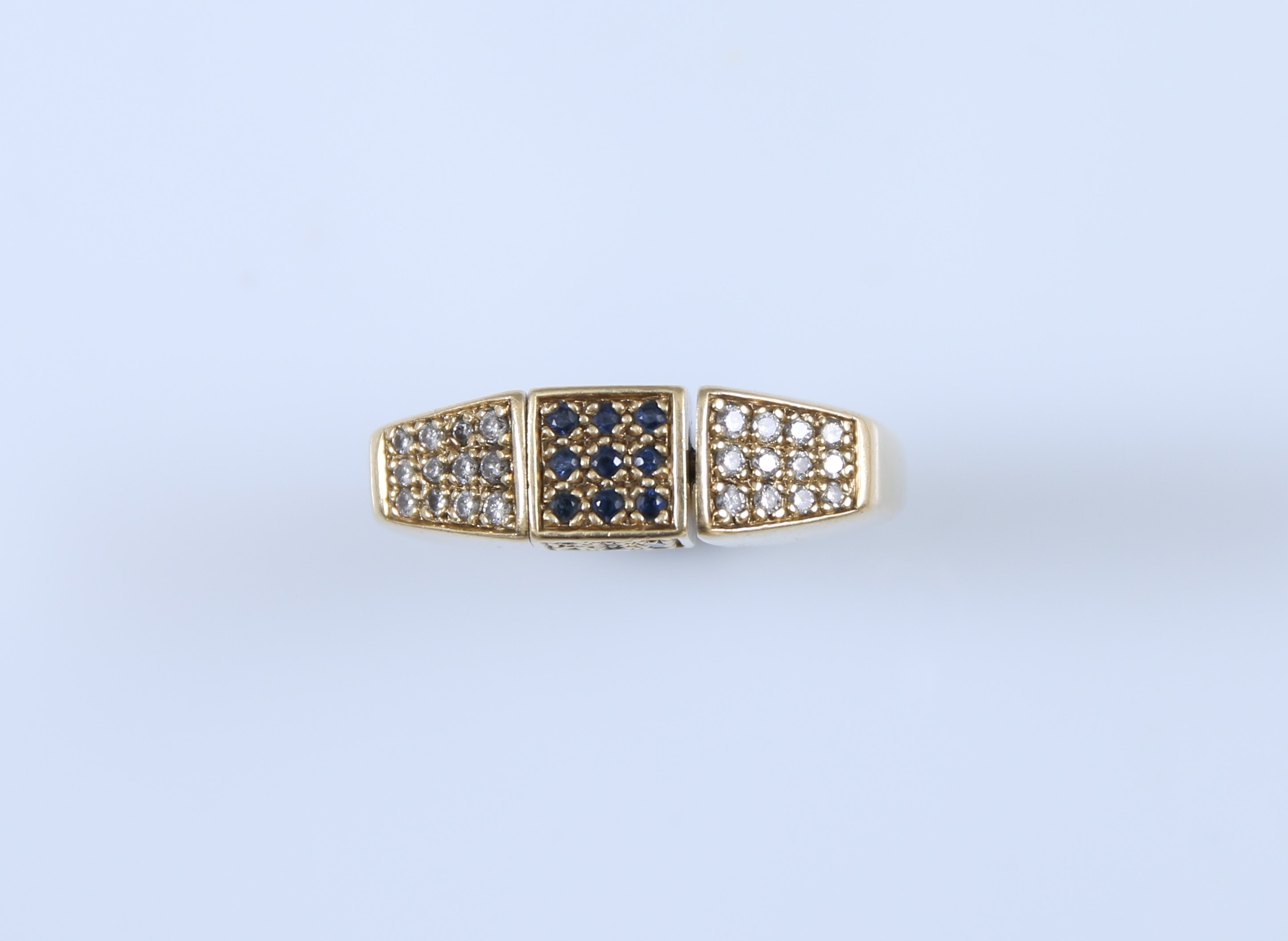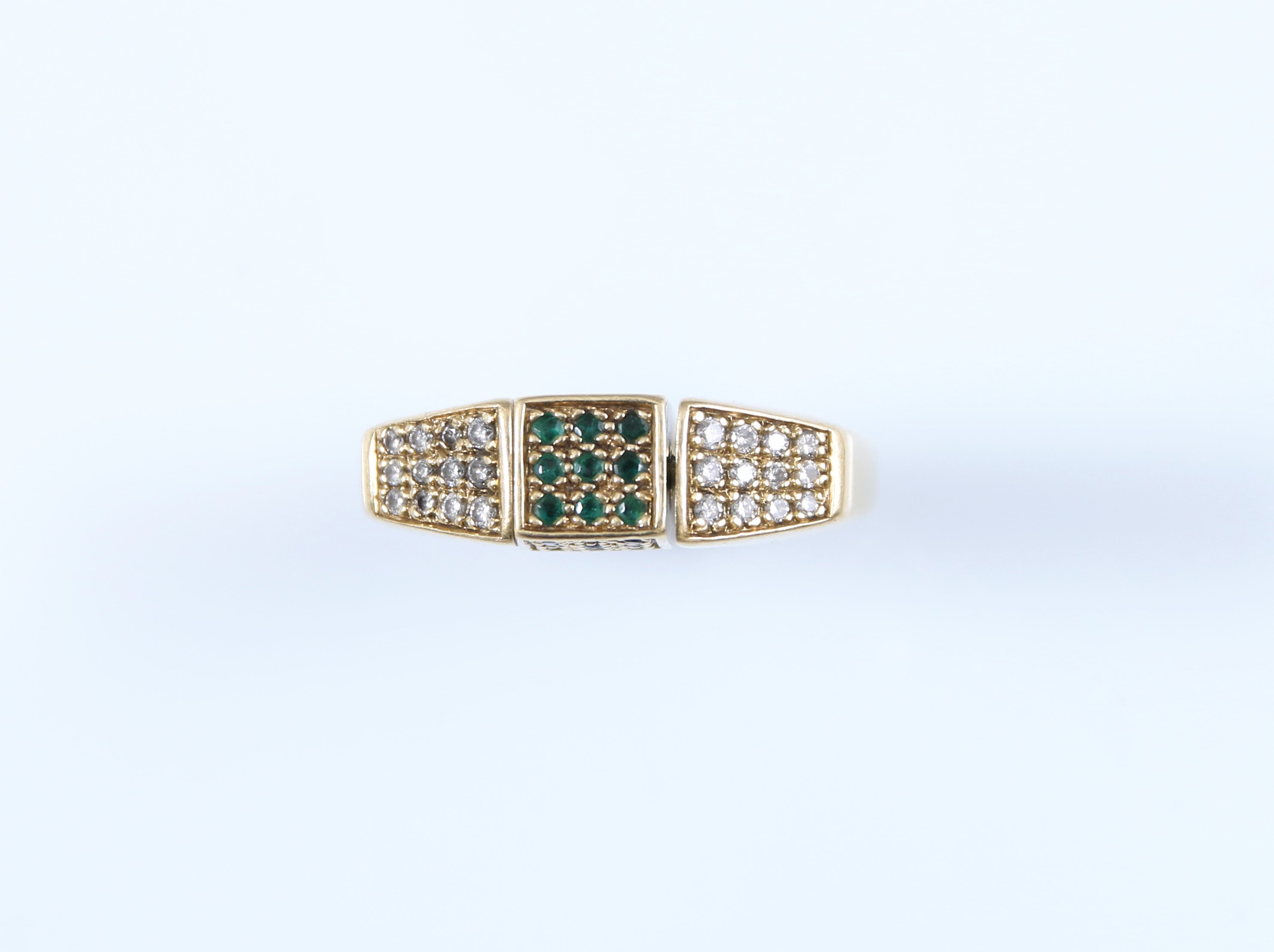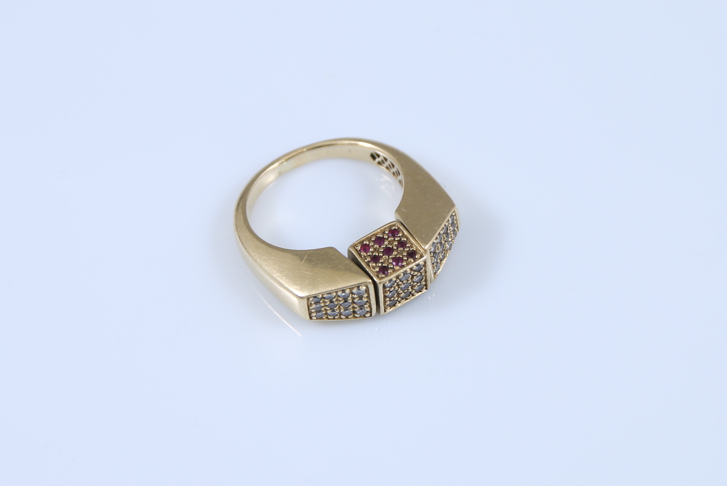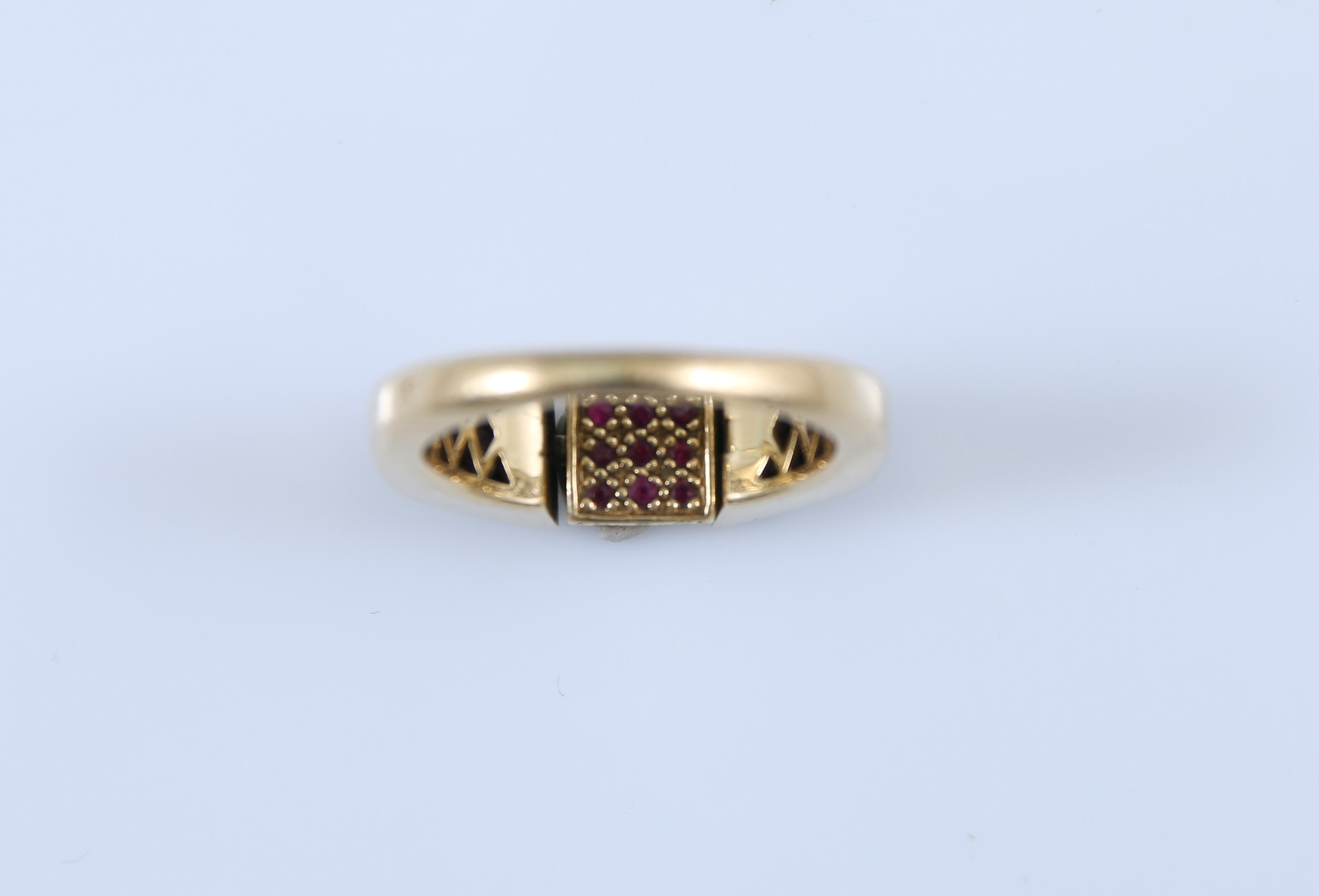 Or jaune 750 millièmes. Le chaton tournant de forme cubique serti de brillants, rubis, saphirs et émeraude.