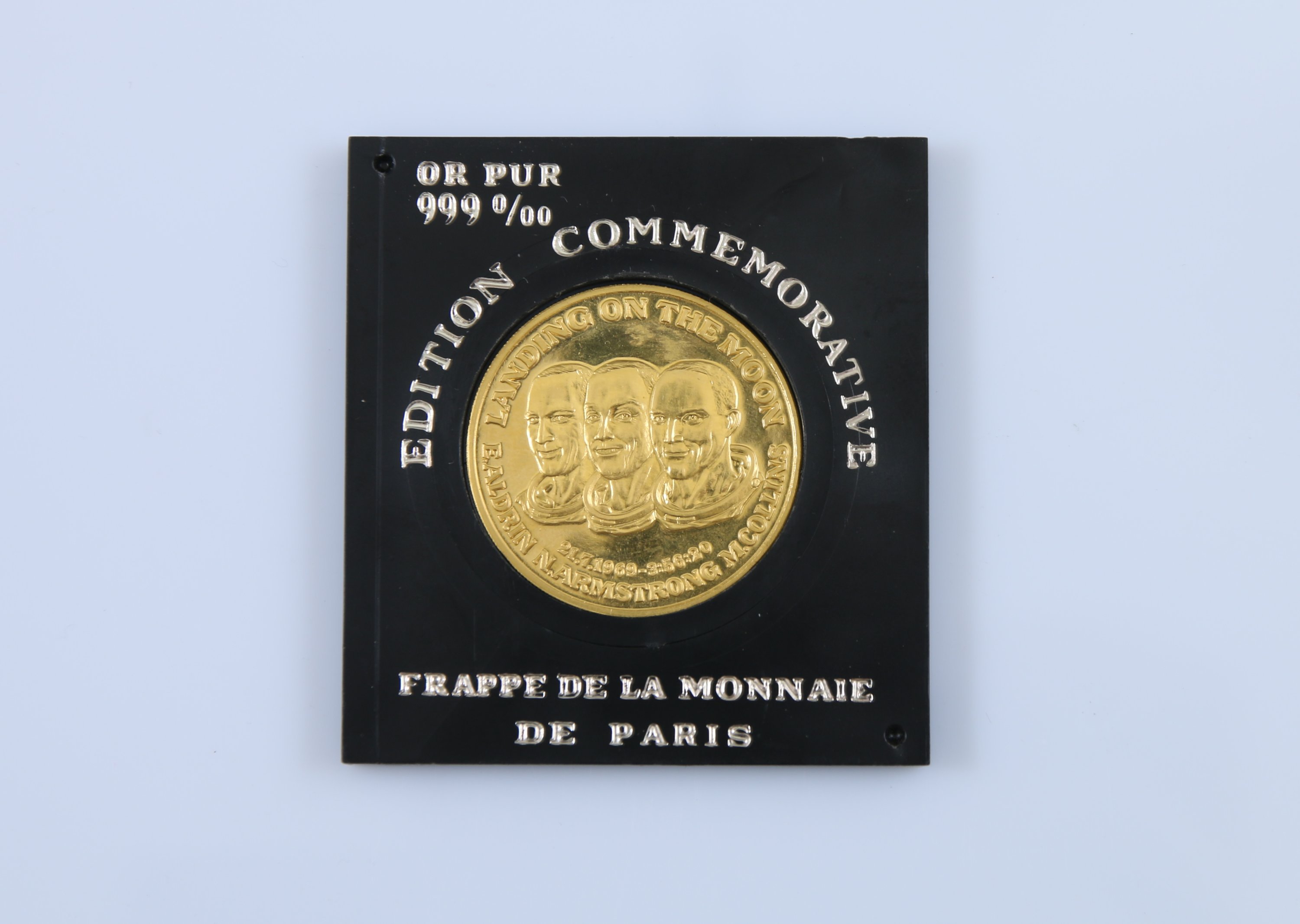 L'avers au décor de l'alunissage, le revers avec la mention "Landing on the Moon" avec les portraits de Neil Amstrong, Edwin Aldrin et Michael Collins.